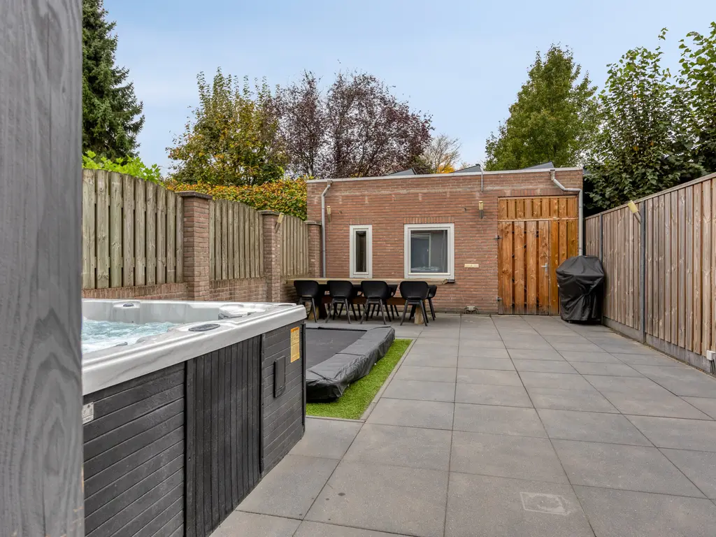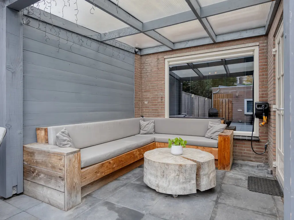 De achtertuin is strak en onderhoudsvriendelijk aangelegd. Onder de overkapping kun je het hele jaar door genieten van het buitenleven, van lange zomeravonden tot knusse herfstborrels. Achterin de tuin wacht iets bijzonders: een stenen schuur die is omgetoverd tot mancave met eigen bar, elektra en wateraansluiting. De ideale plek om te ontspannen, een potje te darten of met vrienden de Formule 1 te kijken. De bar is eventueel ter overname.