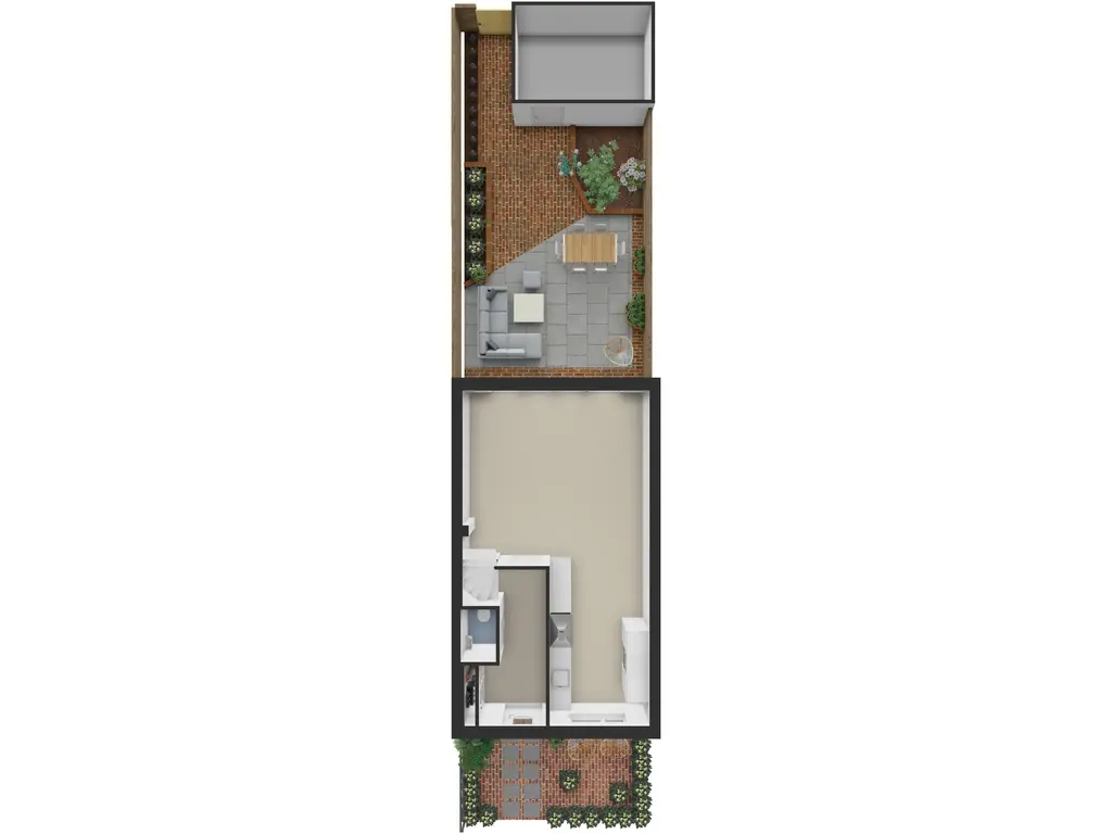 Via de sfeervolle voortuin betreedt u de woning. De ruime hal is praktisch ingericht met schuifkasten voor de meterkast en garderobe. De toiletruimte is modern afgewerkt met een hangend toilet en fonteintje, volledig betegeld in een stijlvolle wit/grijze kleurstelling.