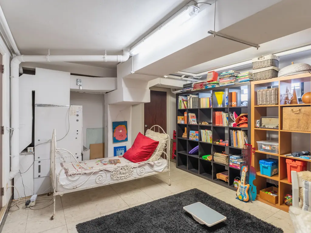 Vijf treden omlaag vindt u een royale kinderspeelkamer en de garage.