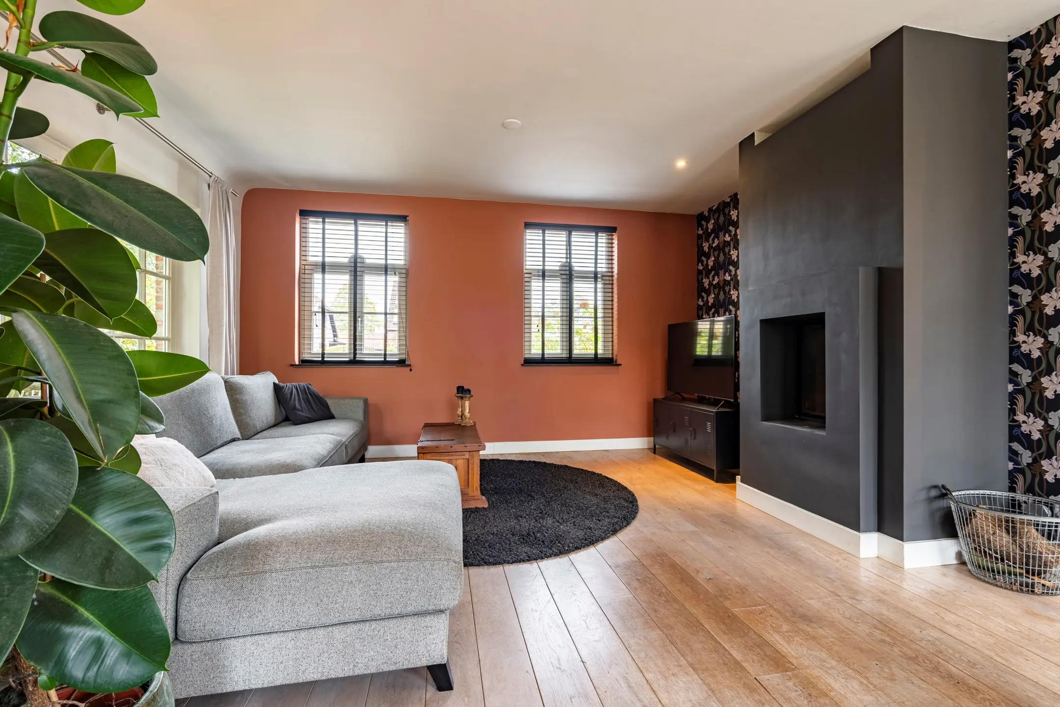 U betreedt de woning via de riante inkomhal met gastentoilet en toegang tot de gezellig ingerichte woonkamer, voorzien van parketvloer en houtkachel.