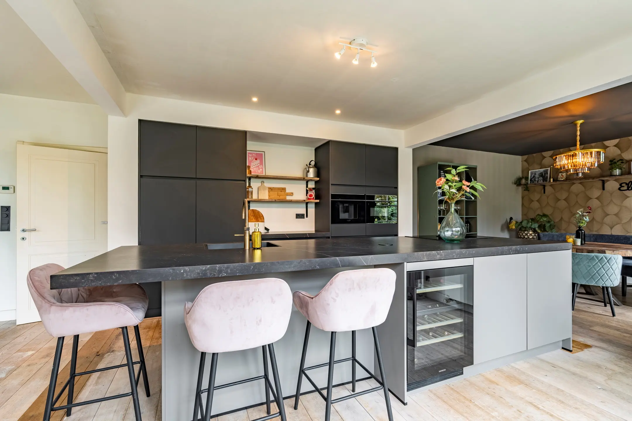 De keuken is o.a. voorzien van een kookeiland met Bora inductiekookplaat met afzuiging, een Quooker, koelkast, diepvries, magnetron, oven en vaatwasser. ( allen Siemens)