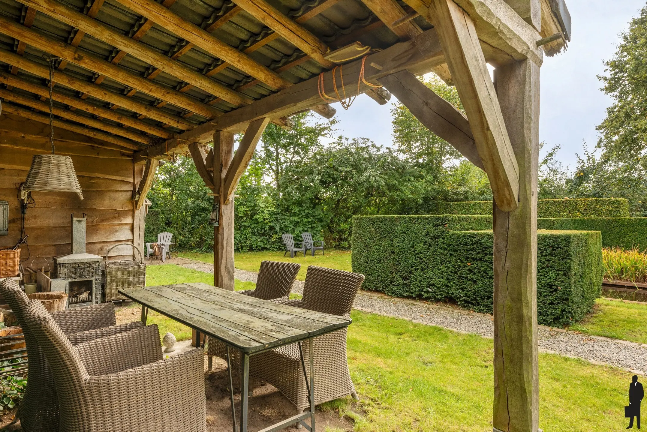 De tuin heeft een overdekt terras met aangrenzende schuur, gemaakt van massief eiken delen.