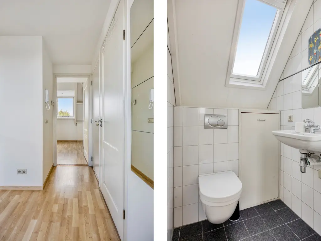 De entree biedt toegang tot de hal van het appartement, vanwaar u alle vertrekken bereikt. De woonkamer met open keuken is licht en sfeervol dankzij de grote dakramen en schuine plafonds, die het appartement een uniek karakter geven.