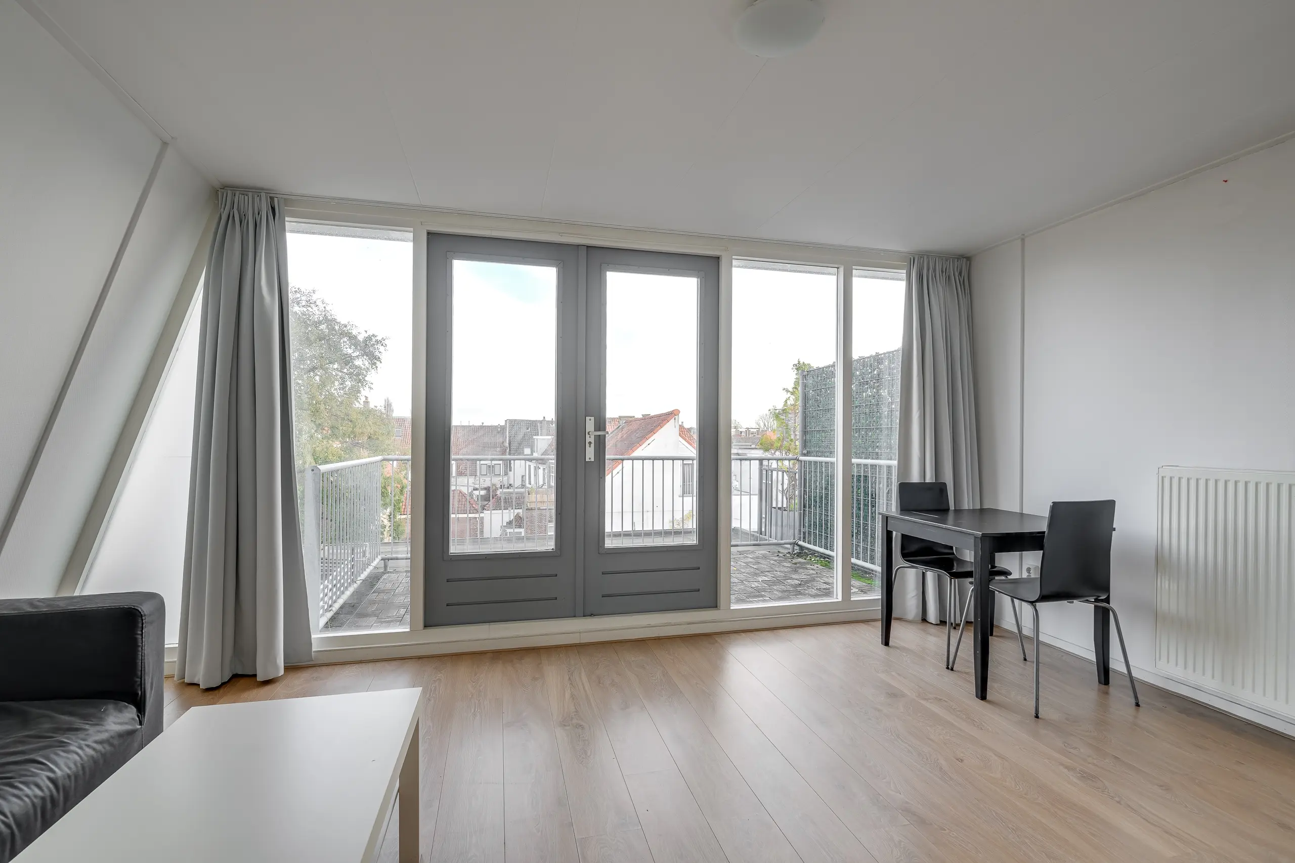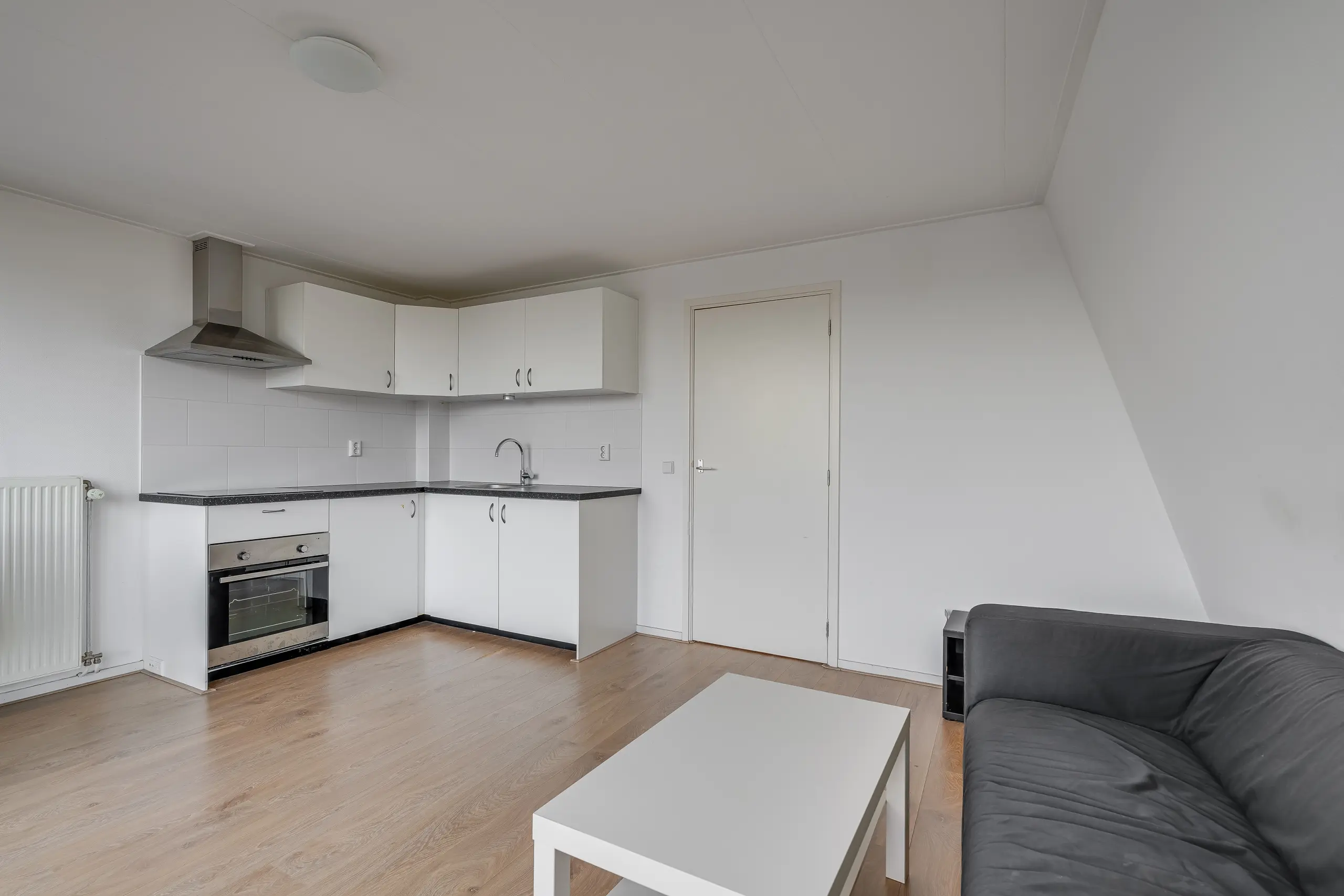 Het appartement heeft een gebruiksoppervlakte van circa 31 m², maar voelt door de slimme indeling en het overvloedige natuurlijke licht aanzienlijk ruimer aan. De woonkamer is voorzien van grote ramen en openslaande deuren naar het dakterras, wat zorgt voor een prettige, open sfeer. Dankzij de ligging op het oosten geniet je hier van de zon in de ochtend. Perfect om rustig met een kop koffie op je dakterras te zitten.
