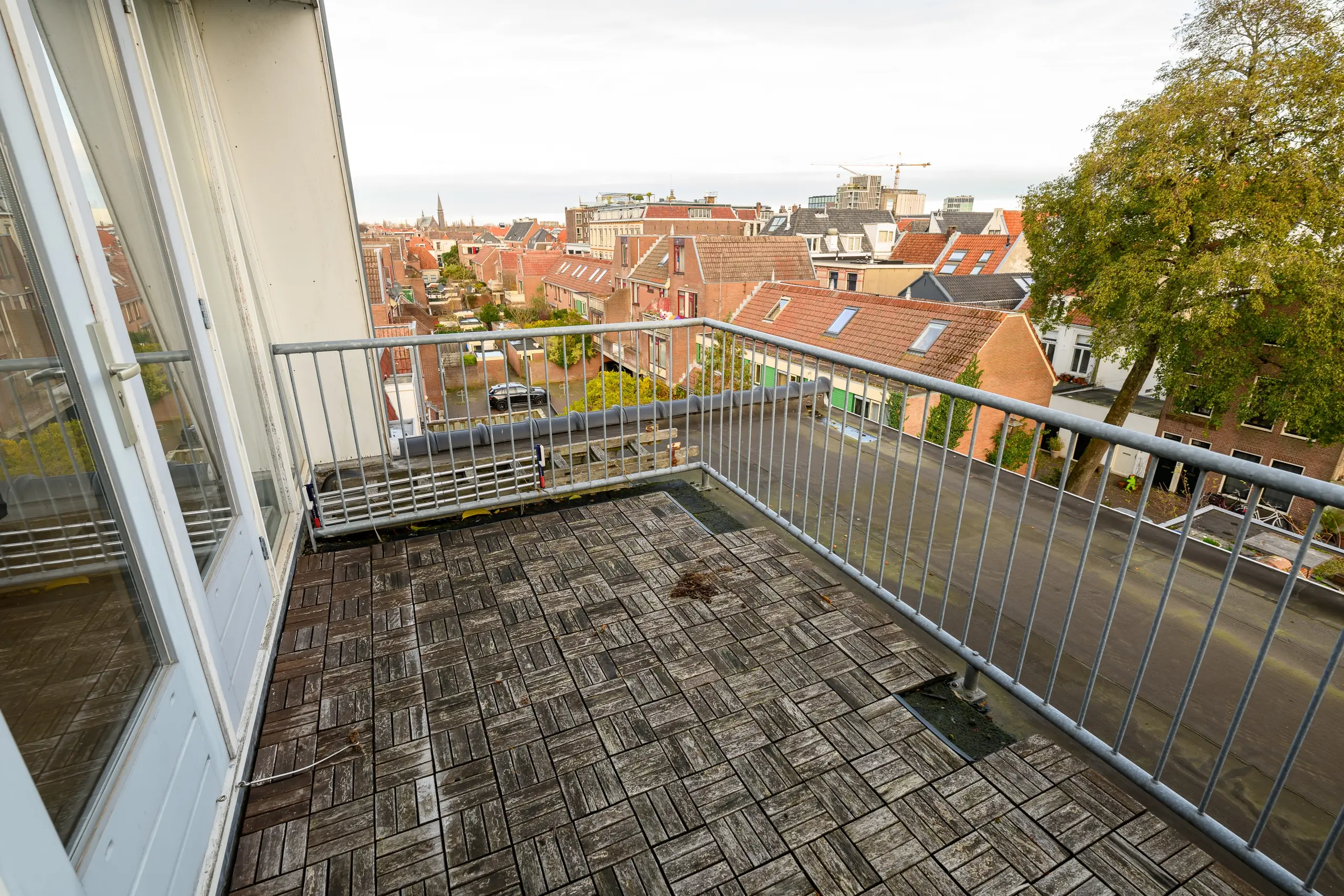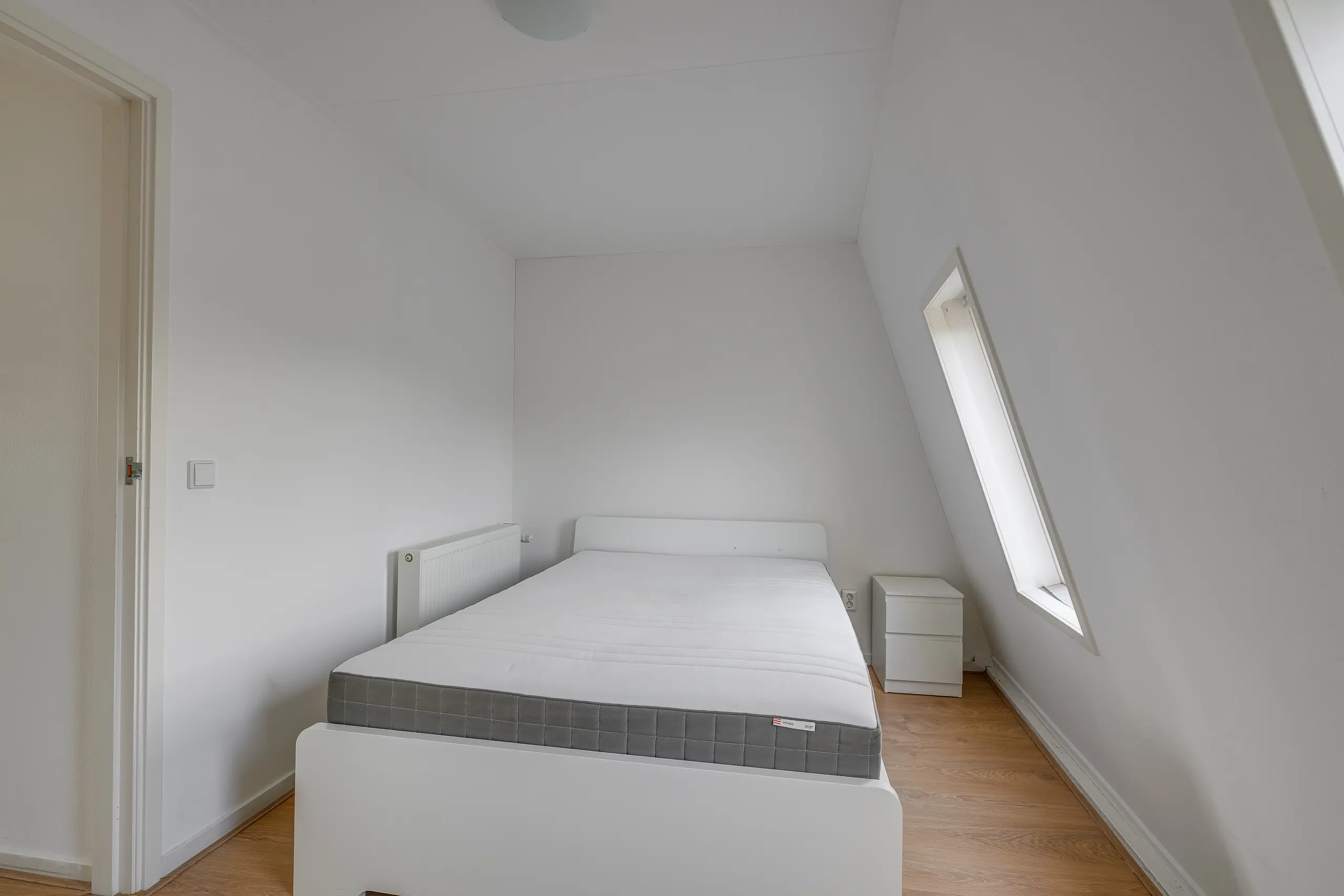 • Naastgelegen is de compacte slaapkamer, voorzien van drie ramen met uitzicht op de skyline van Leiden (o.a. Pieterskerk).
