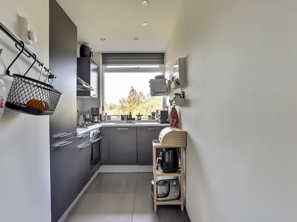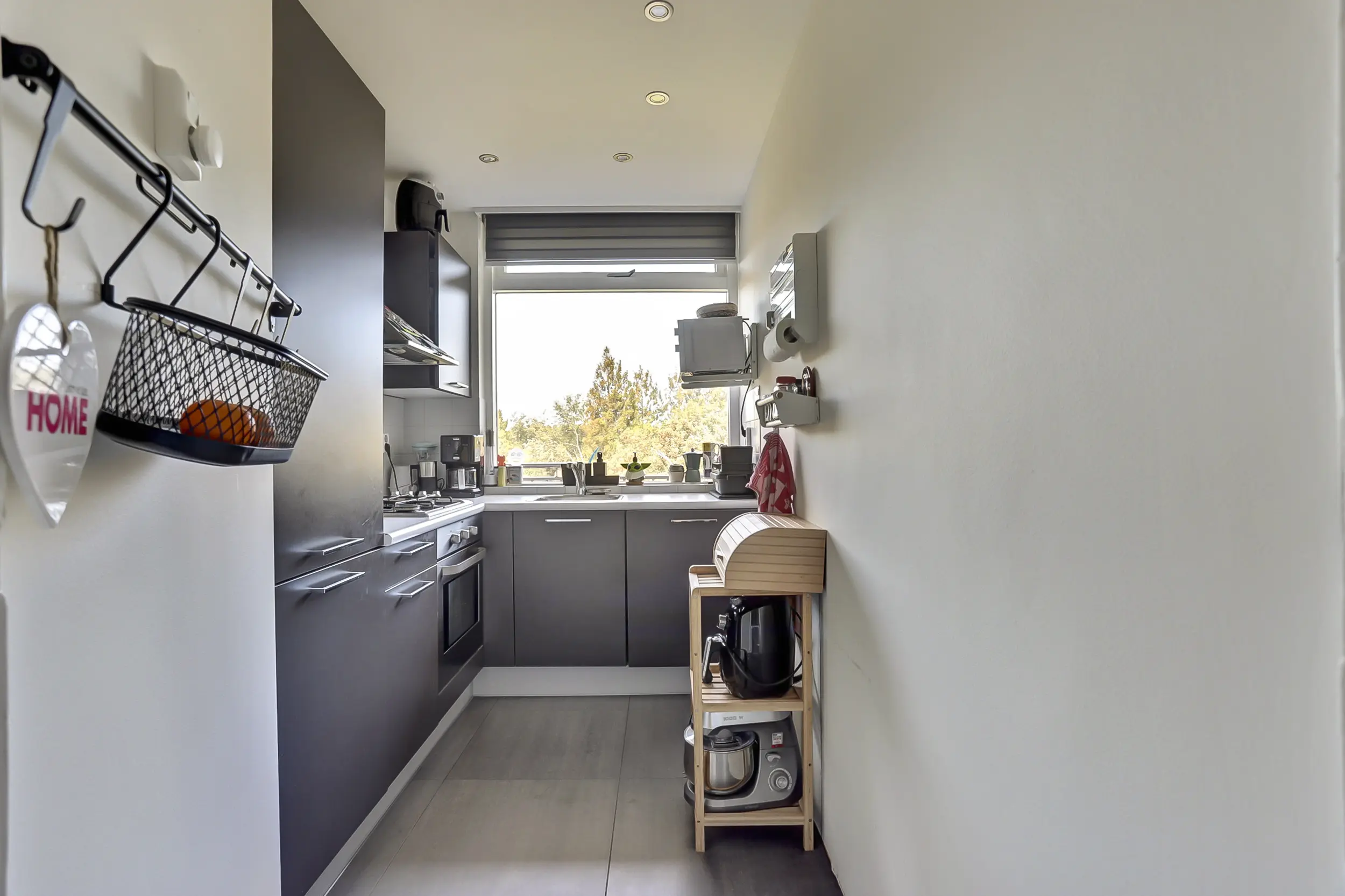 Aan de voorzijde bevindt zich de nette keuken. Deze is efficiënt ingericht en voorzien van alle gemakken, waaronder een 4-pits gasfornuis, oven, vaatwasser en een koel-/vriescombinatie. De keuken biedt voldoende opbergruimte en nodigt uit tot het bereiden van de lekkerste gerechten.