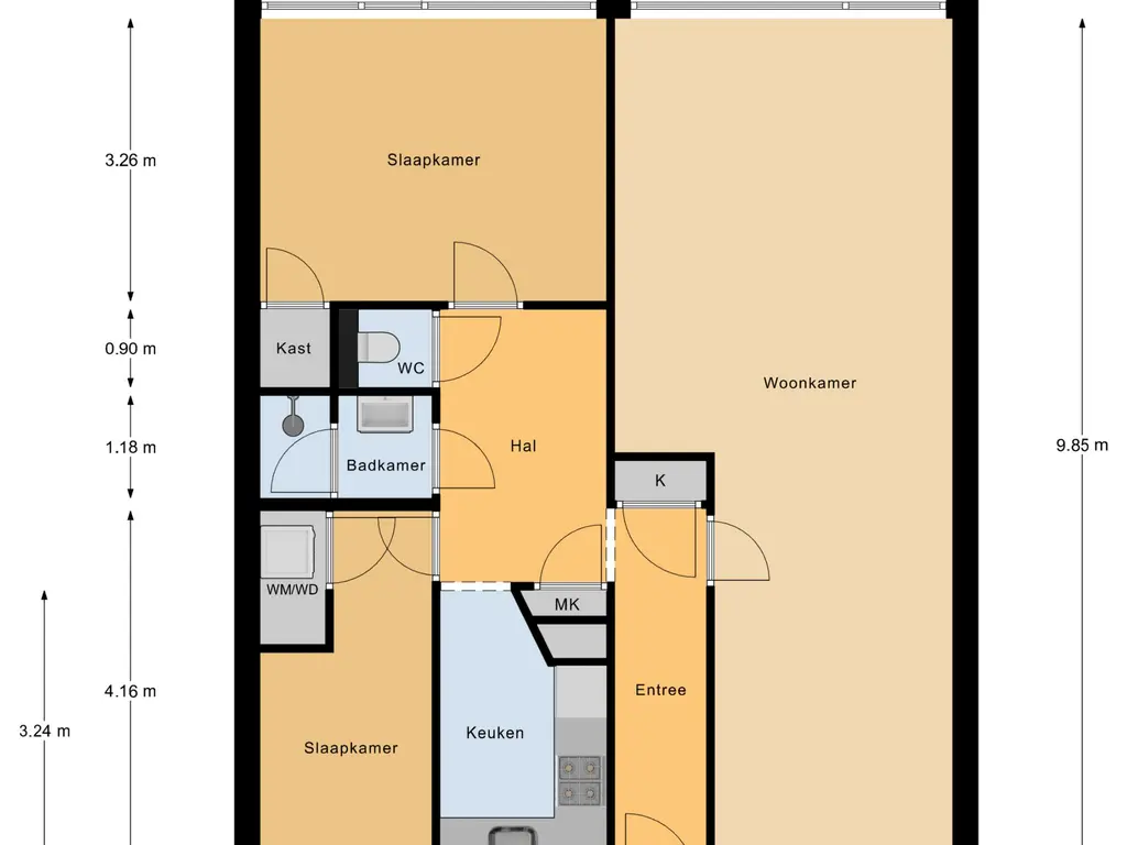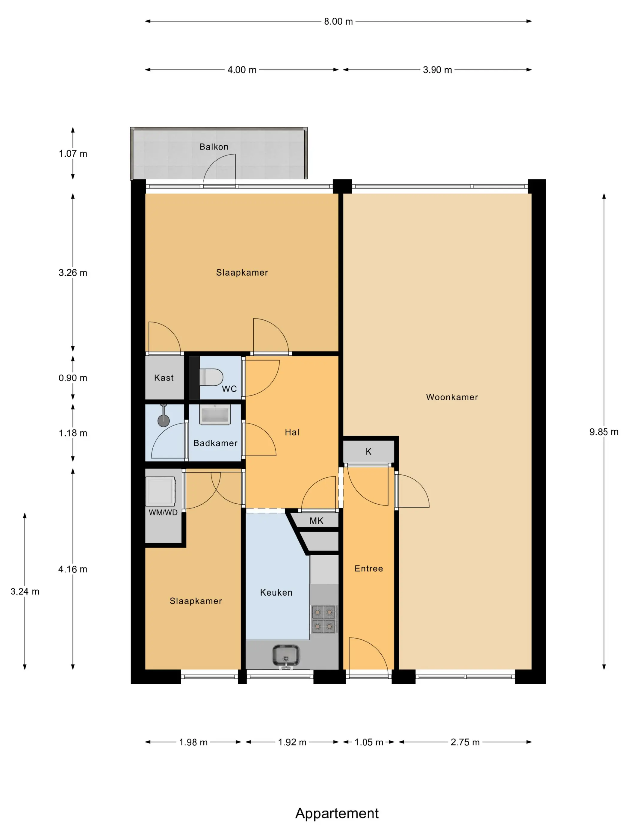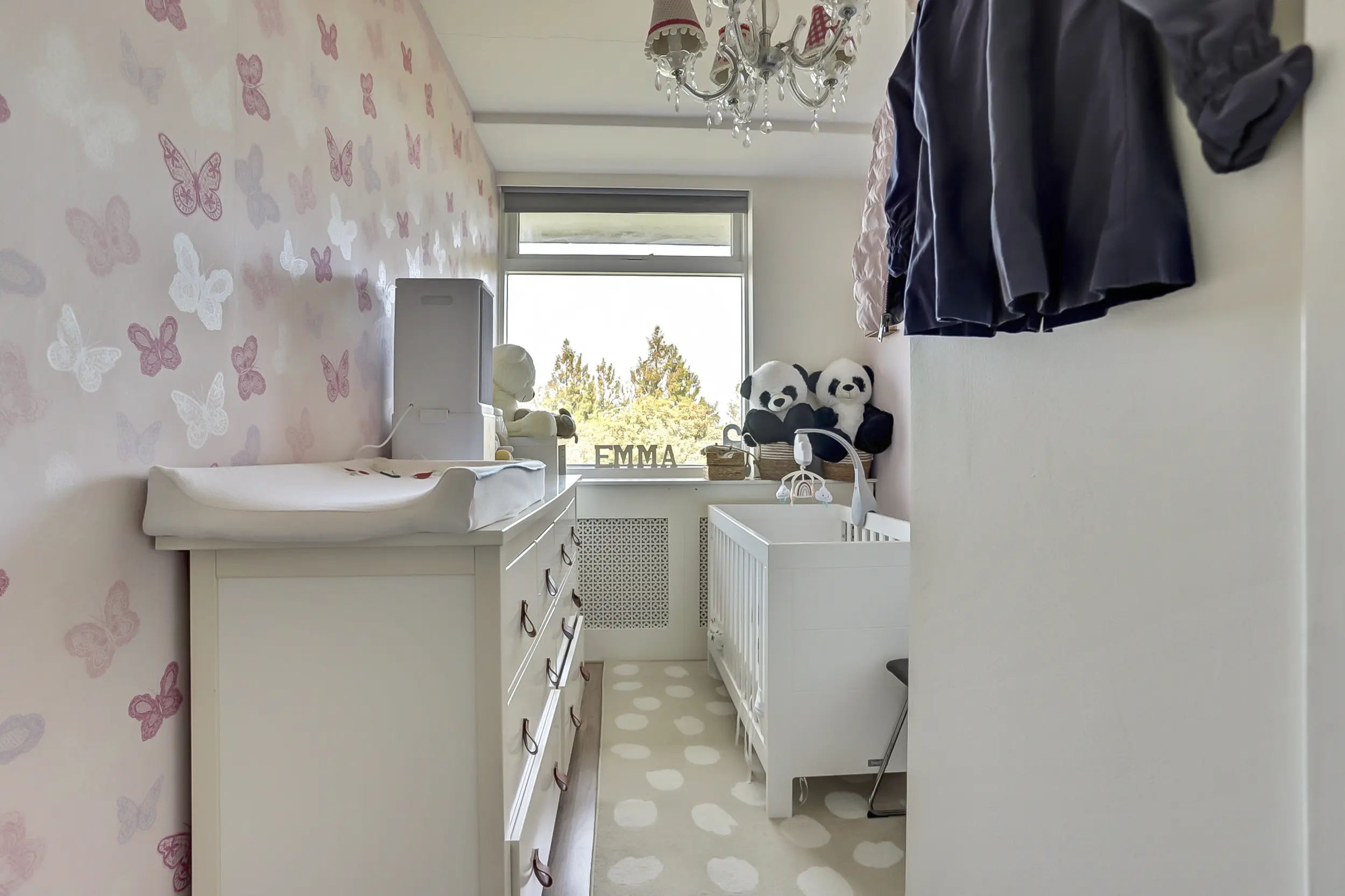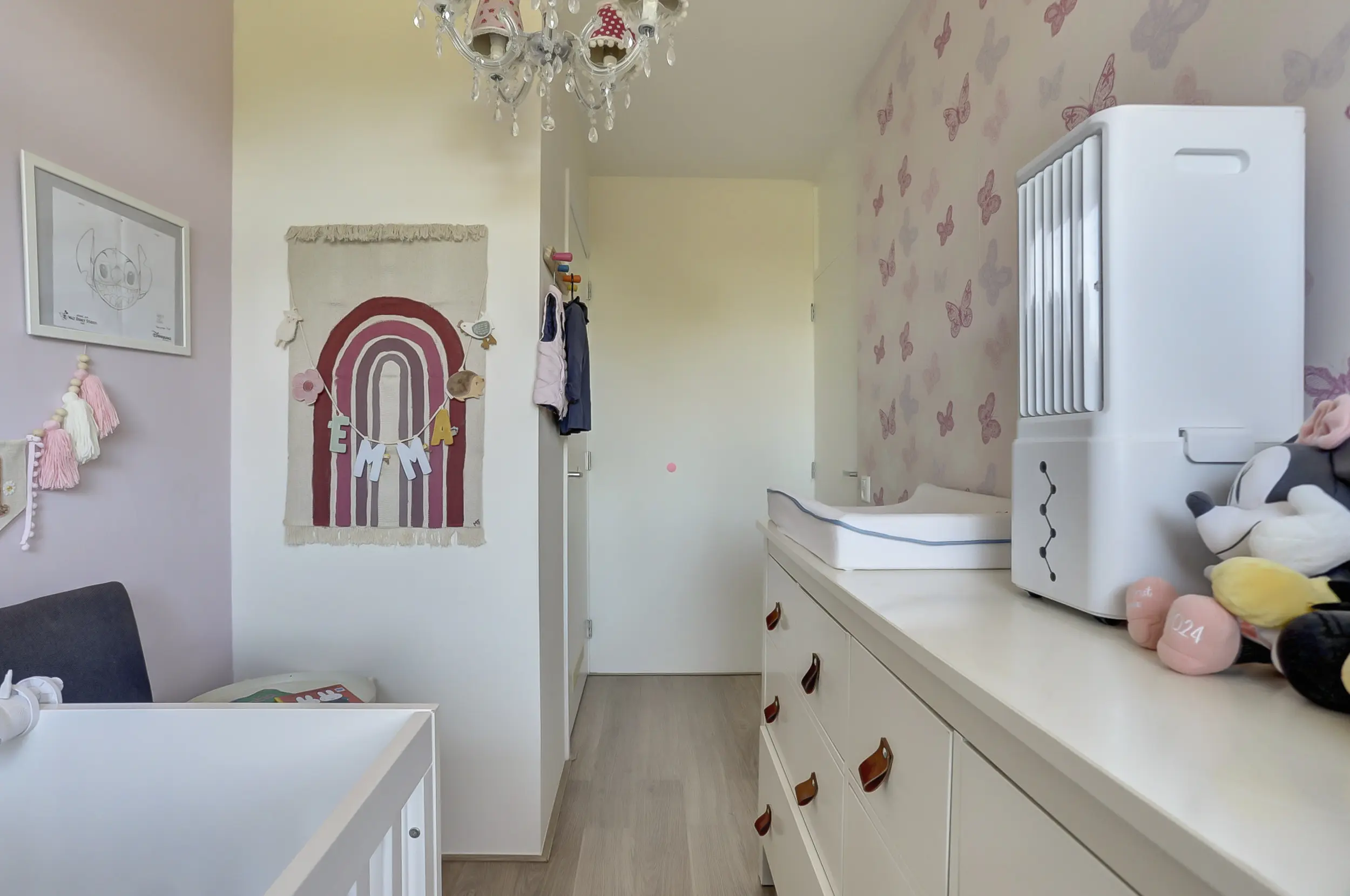 Vanuit de hal heb je toegang tot de twee slaapkamers, het toilet en de badkamer. De hoofdslaapkamer bevindt zich aan de rustige achterzijde en heeft een royale oppervlakte van ca. 12 m². Vanuit hier loop je via een deur zo het zonnige balkon op het westen op, waar je na een lange dag heerlijk kunt ontspannen in de avondzon. De tweede slaapkamer aan de voorzijde is ca. 8 m² groot en beschikt over een handige inbouwkast waar de wasmachine en warmwaterboiler zijn opgesteld. Beide kamers zijn perfect in te delen als slaapkamer, kinderkamer, werkkamer of hobbyruimte.