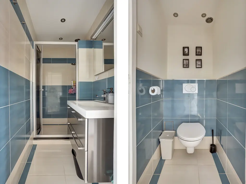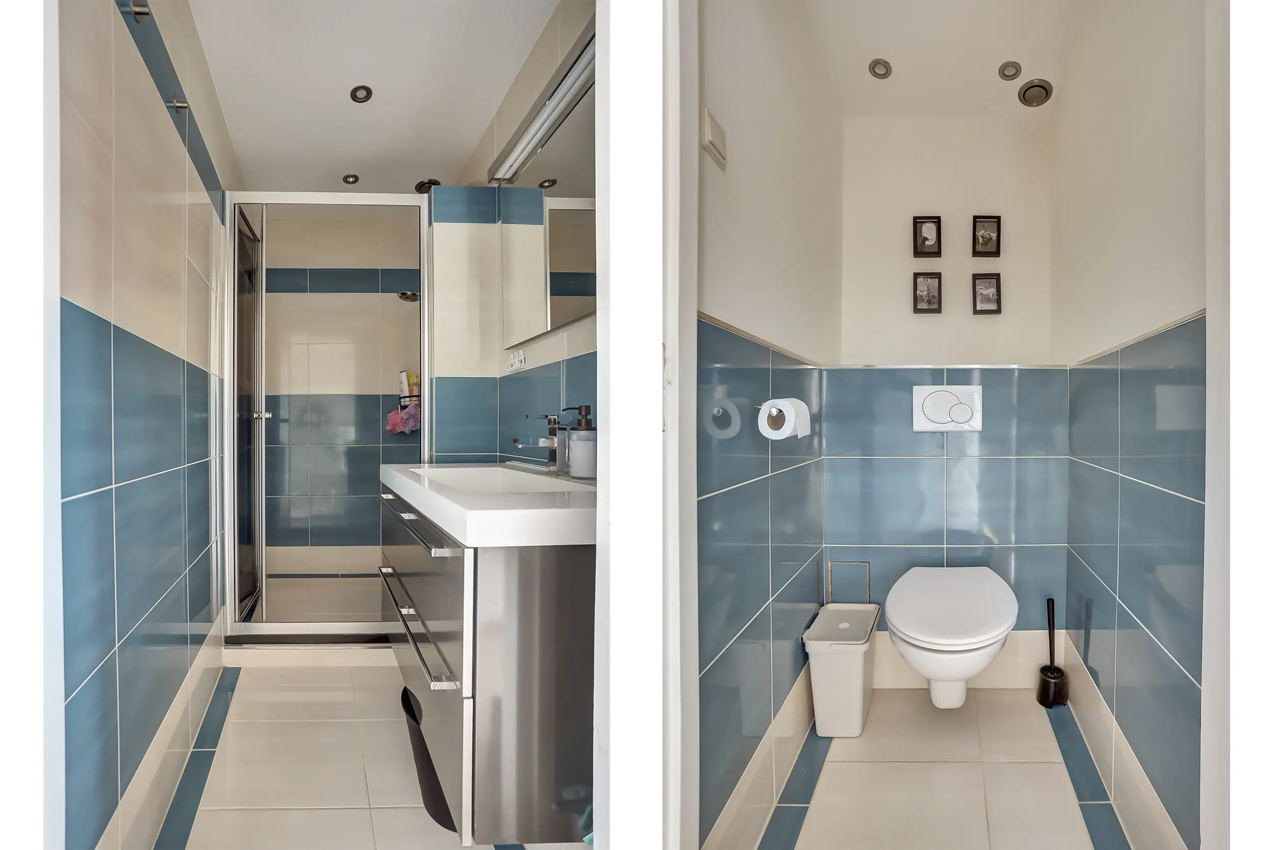 De moderne badkamer is voorzien van een ruime inloopdouche en een brede wastafel met meubel. De strakke afwerking en het moderne zwevende closet in de separate toiletruimte maken het geheel compleet.