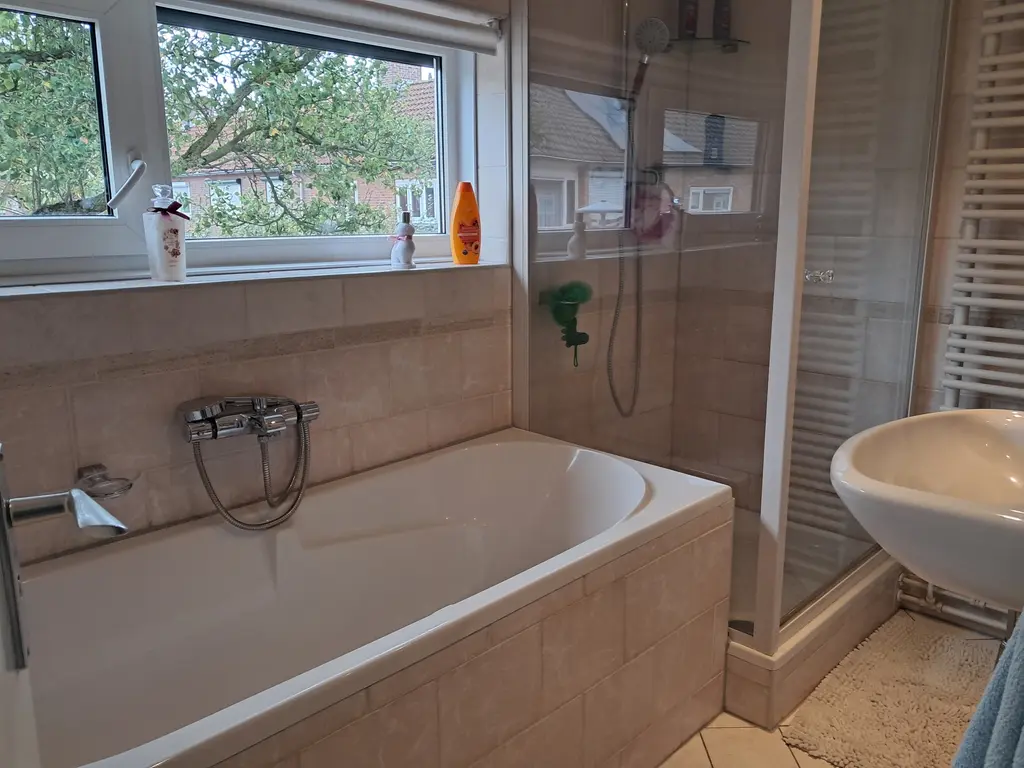 Deze verdieping is ingedeeld met een overloop, 3 slaapkamers en badkamer. De goed onderhouden badkamer is ingericht met een ligbad, douchecabine en wastafel.