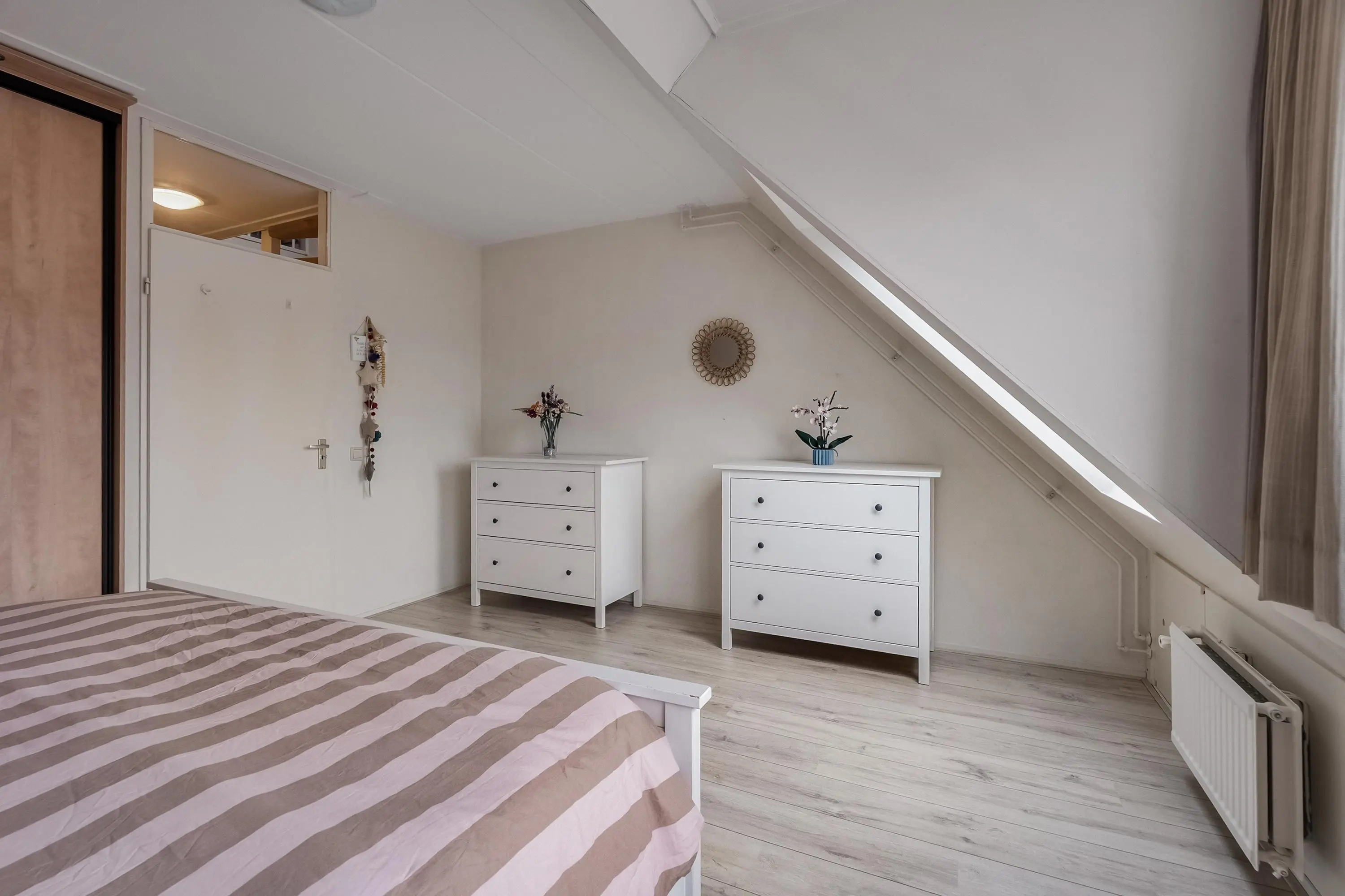 Slaapkamer 3 (ca. 11 m2) beschikt over een kunststof dakkapel met elektrisch bedienbaar rolluik en hor, een Velux dakraam met verduisterend gordijn, een lichte laminaatvloer en bergruimte achter het knieschot aan beide kanten. Deze slaapkamer is verrassend ruimtelijk dankzij de dakkapel en het dakraam, waardoor er natuurlijke lichtinval is en de ruimte optimaal wordt benut.