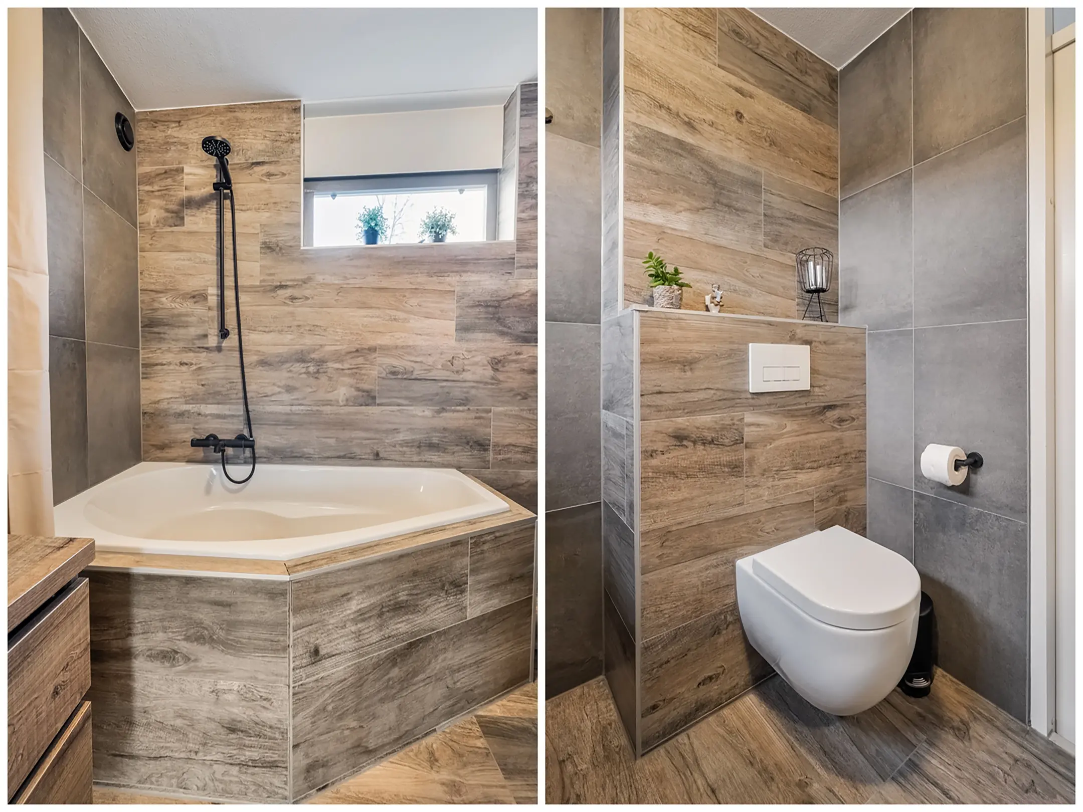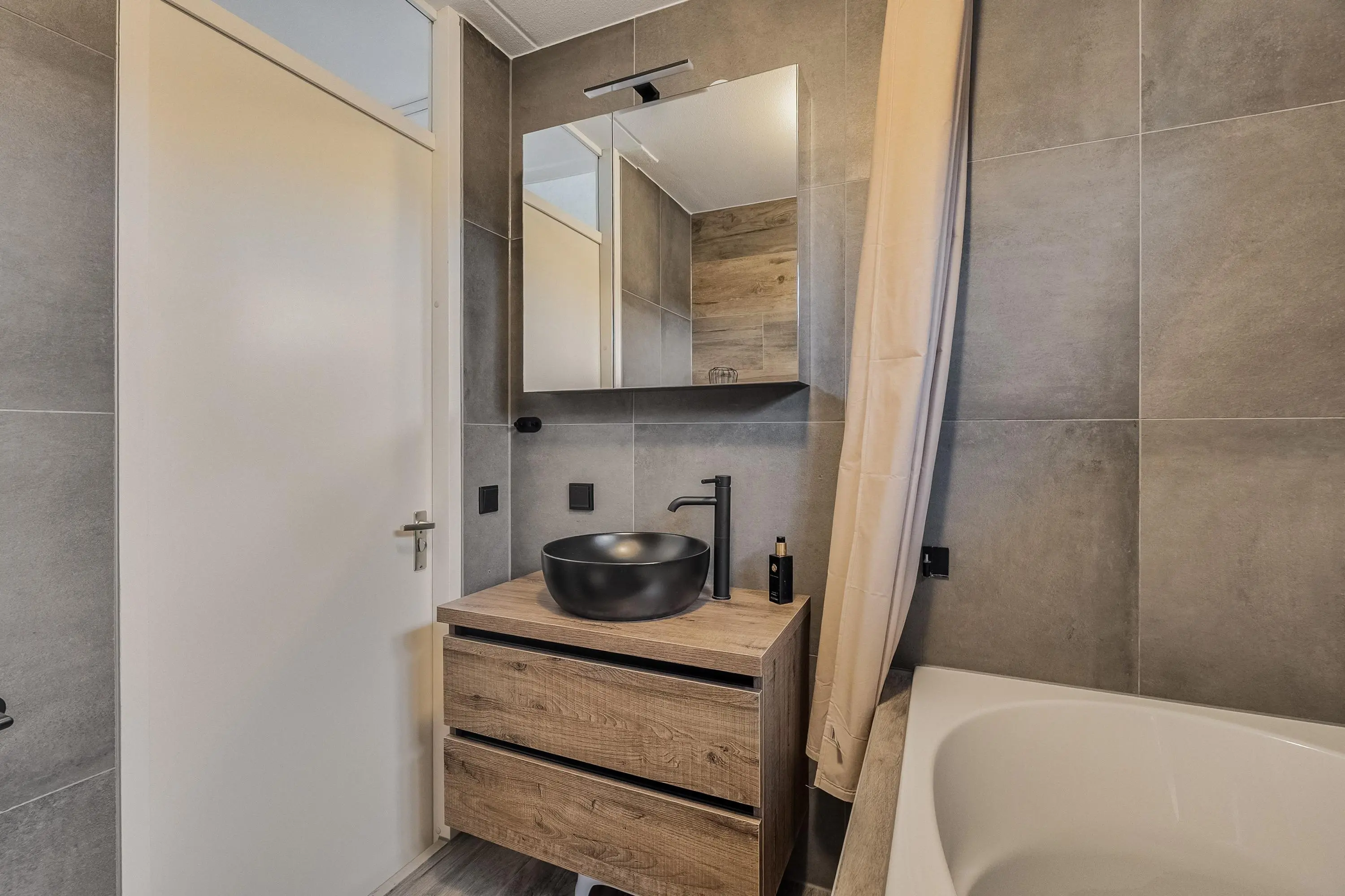 De moderne badkamer (ca. 4 m2) is in 2021 gerenoveerd. De sanitaire voorzieningen zijn een wastafel met wastafelmeubel en extra stopcontacten voor het scheerapparaat en haardroger, spiegel met spiegelkast en verlichting, hangend tweede toilet en een ligbad. De badkamer is geheel betegeld in een lichte kleurstelling.