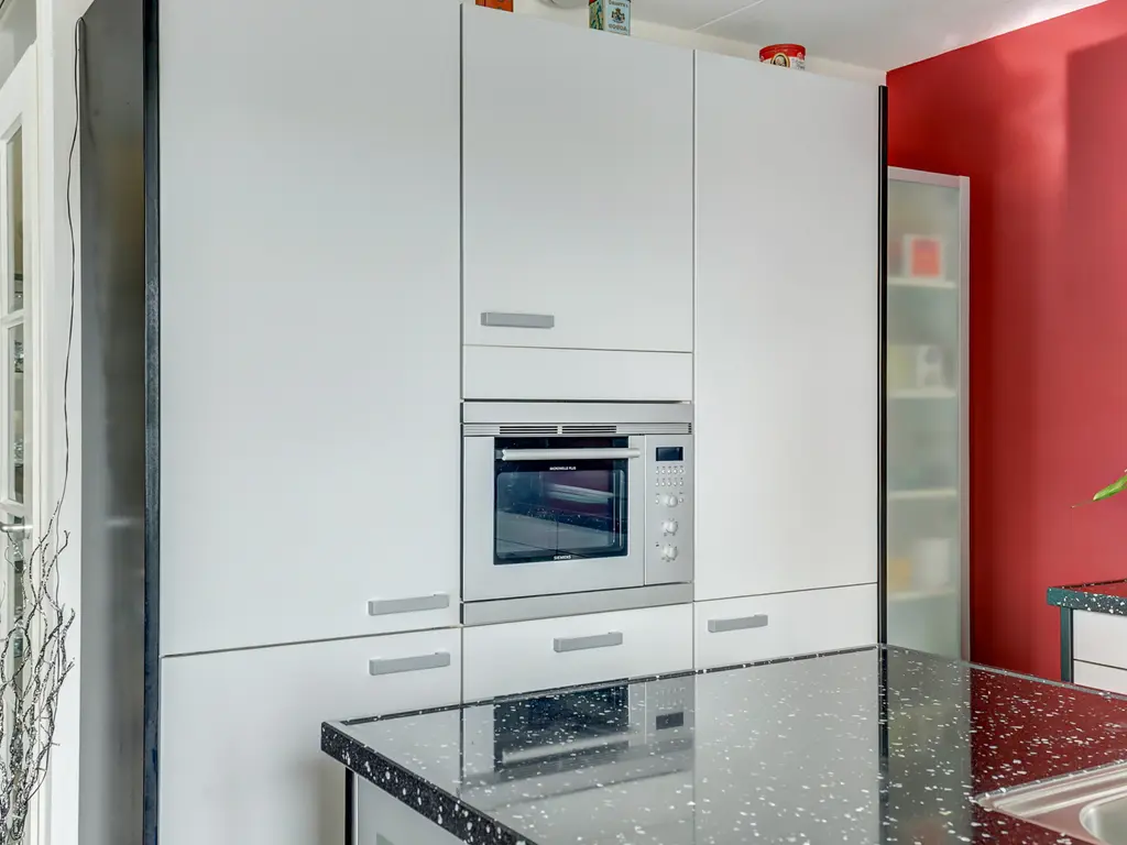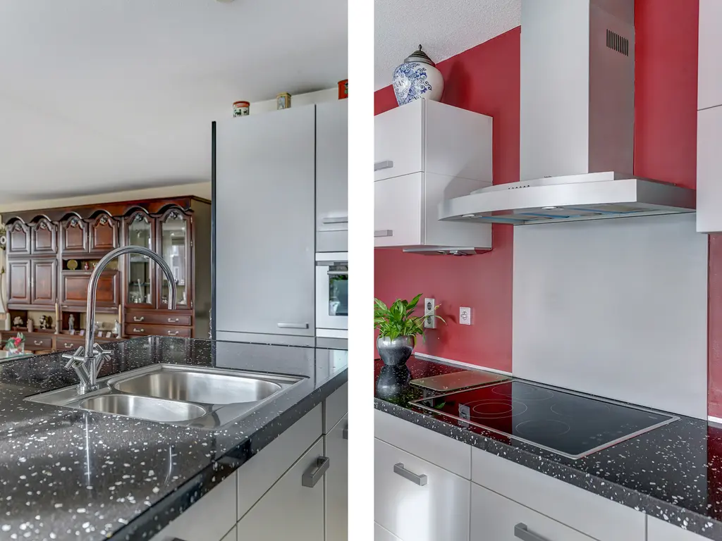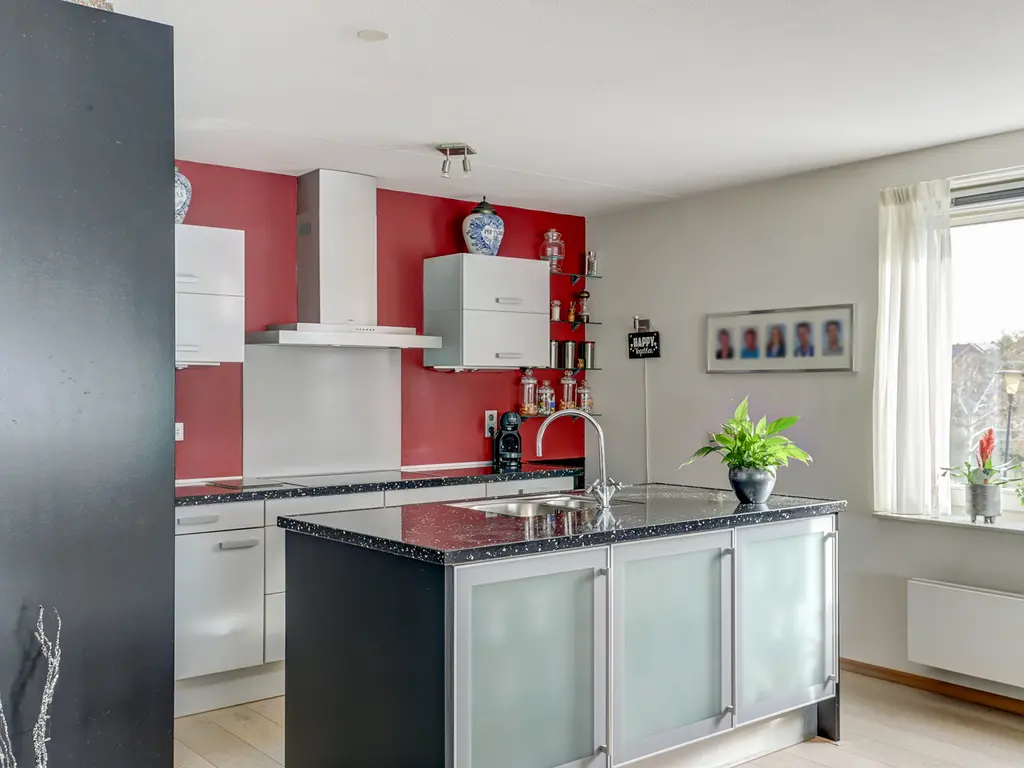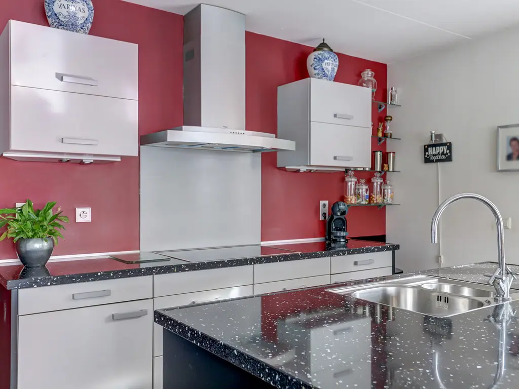 Aan de achterzijde loopt de woonkamer naadloos over in de moderne open keuken, uitgevoerd in hoekopstelling en voorzien van een groot eiland. De keuken is voorzien van diverse inbouwapparatuur, zoals een koelkast, vriezer, vaatwasser, combi-oven en een grote inductiekookplaat met afzuigkap. Er is veel bergruimte in de kastenwand, onderkasten en bovenkastjes, en extra opbergruimte in het eiland, waar zich ook de anderhalve spoelbak bevindt. Een heerlijke, lichte keuken om uitgebreid te koken!