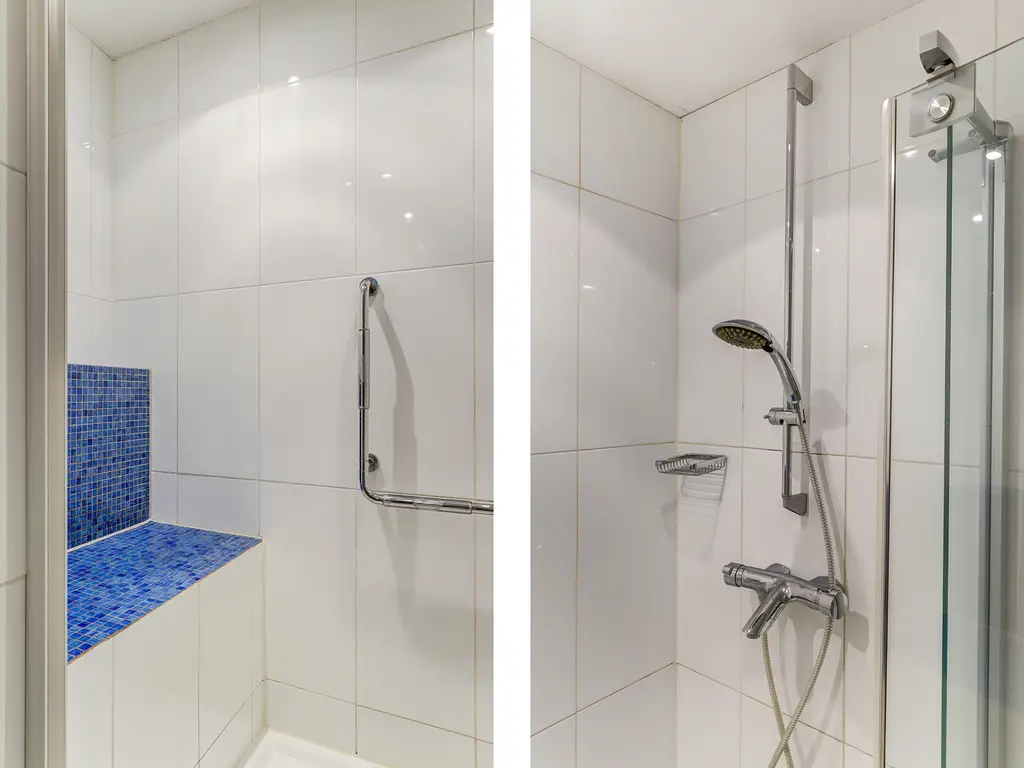 Tussen de twee slaapkamers ligt de ruime badkamer, voorzien van een grote douchecabine, tweede toilet en twee moderne wastafels met mengkranen en grote spiegels met verlichting erboven.