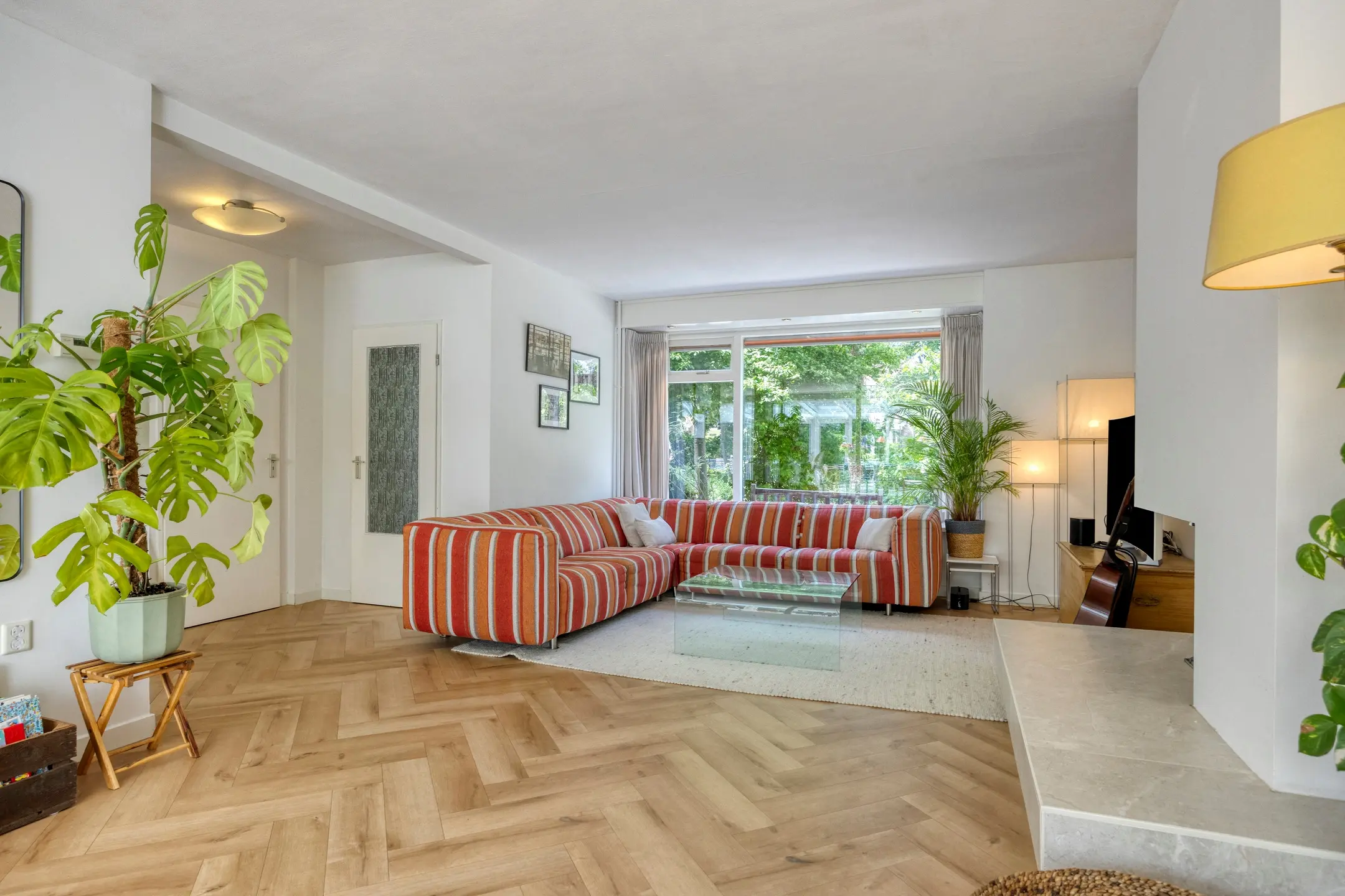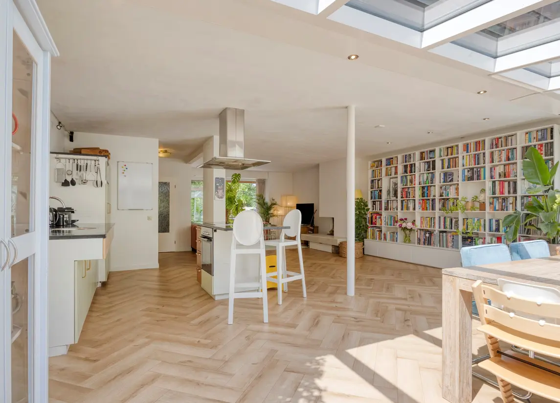 Through the sunny front garden, you reach the front door, which leads into the hallway with the meter cupboard and the toilet. The extended living room is wonderfully light and spacious, thanks to the many windows in the conservatory, and features a beautiful herringbone PVC floor with underfloor heating. The room also has a cozy open fireplace. The generous kitchen boasts a cooking island with an induction cooktop and a cozy bar area. The kitchen is equipped with various built-in appliances, including a close-in water boiler, an extractor hood, an oven, a fridge-freezer, and plenty of storage space. Through the French doors from the conservatory, you can access the lovely deep backyard (facing east), which has both a terrace by the conservatory and another at the rear. The spacious garage is also located here, offering numerous possibilities. At the back, the garden borders the quiet, dead-end Wilthoeflaan, making it an ideal play area for children.