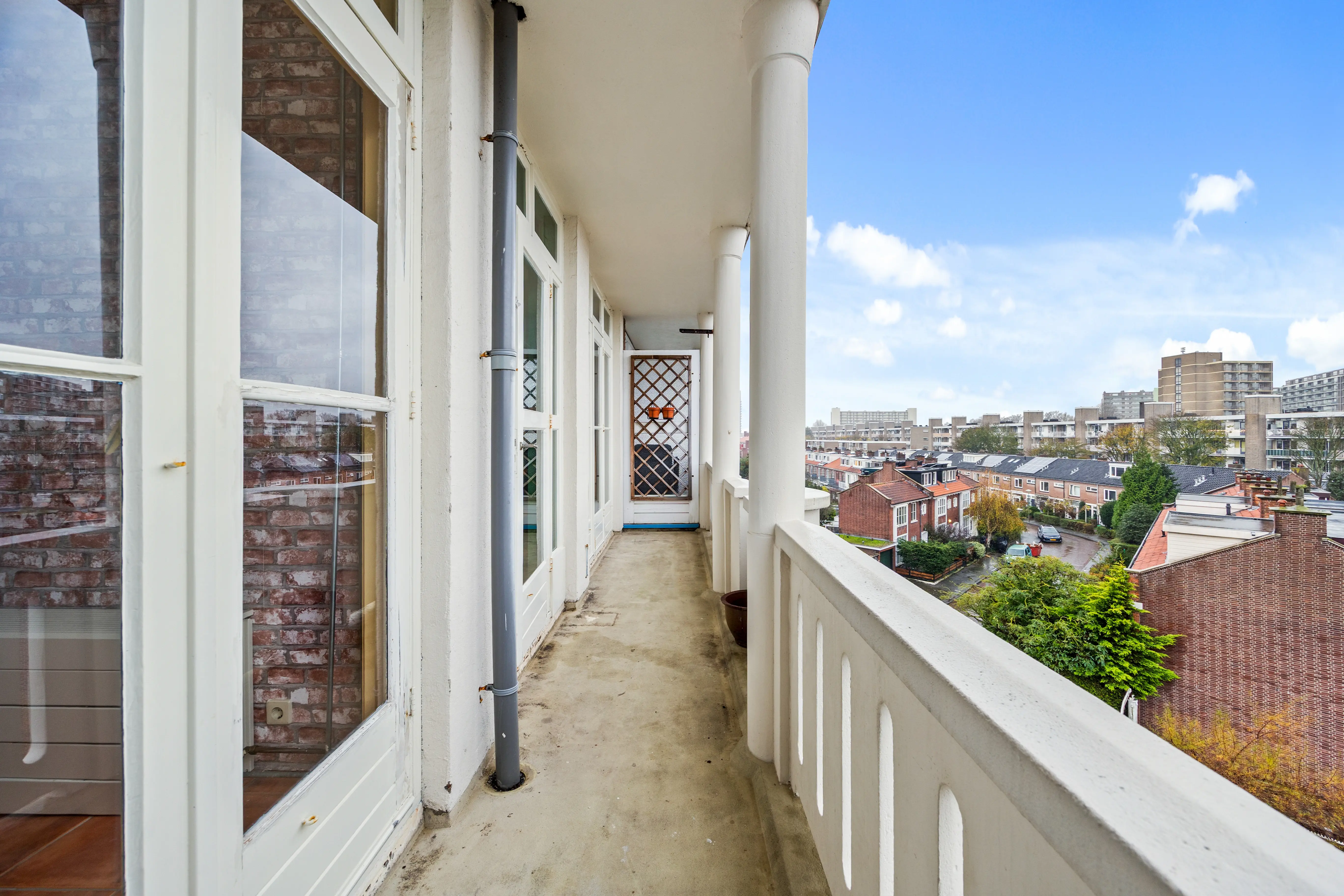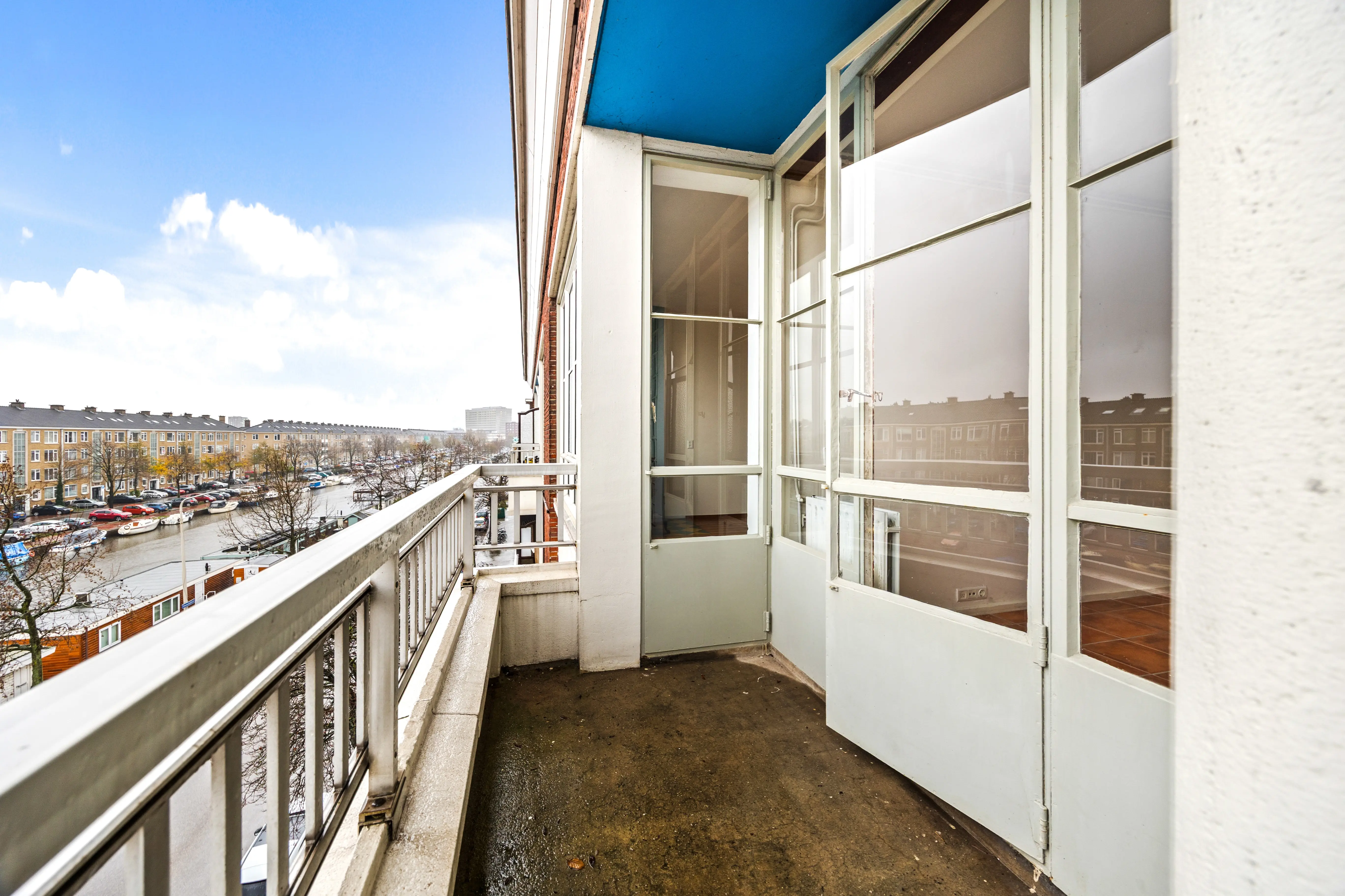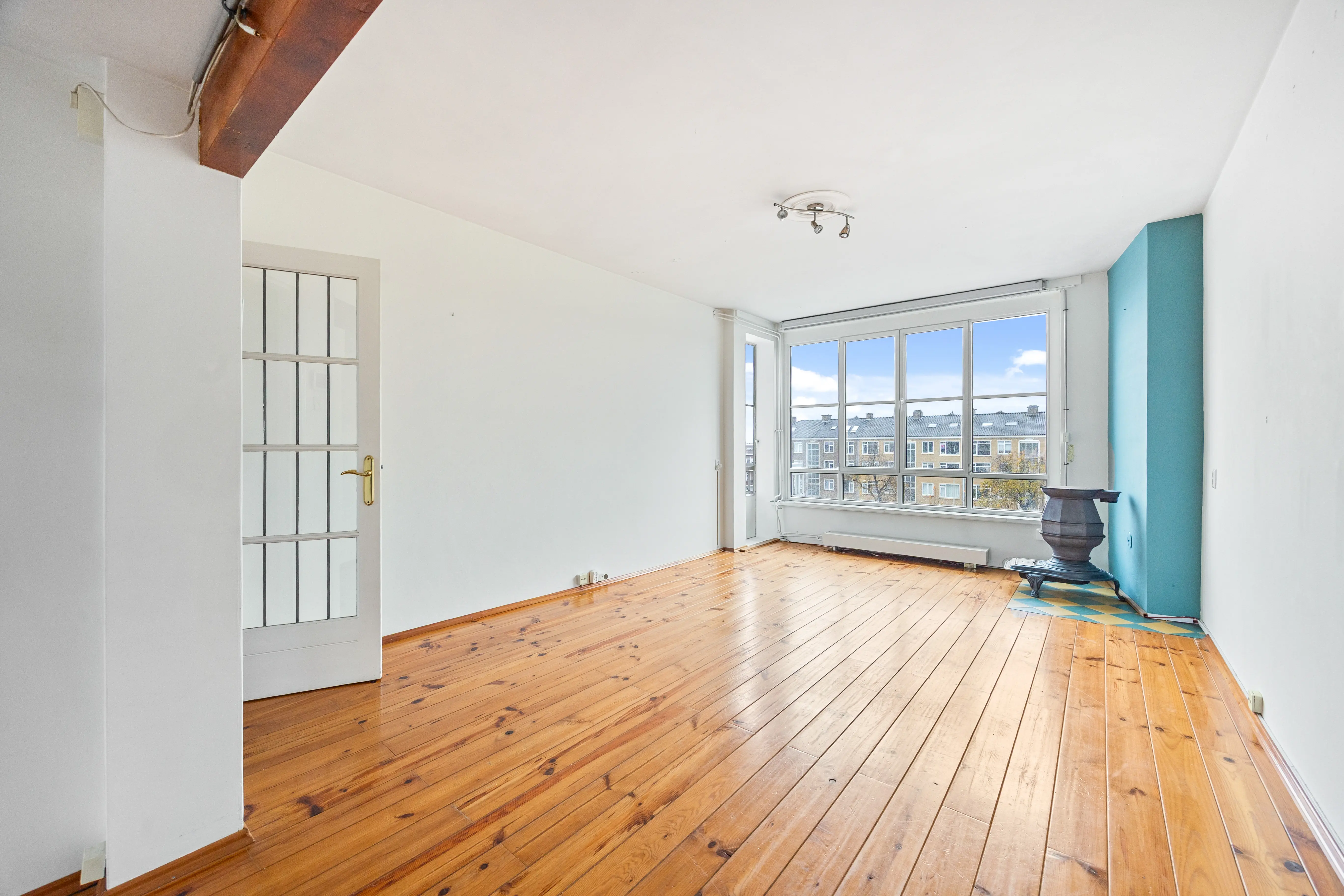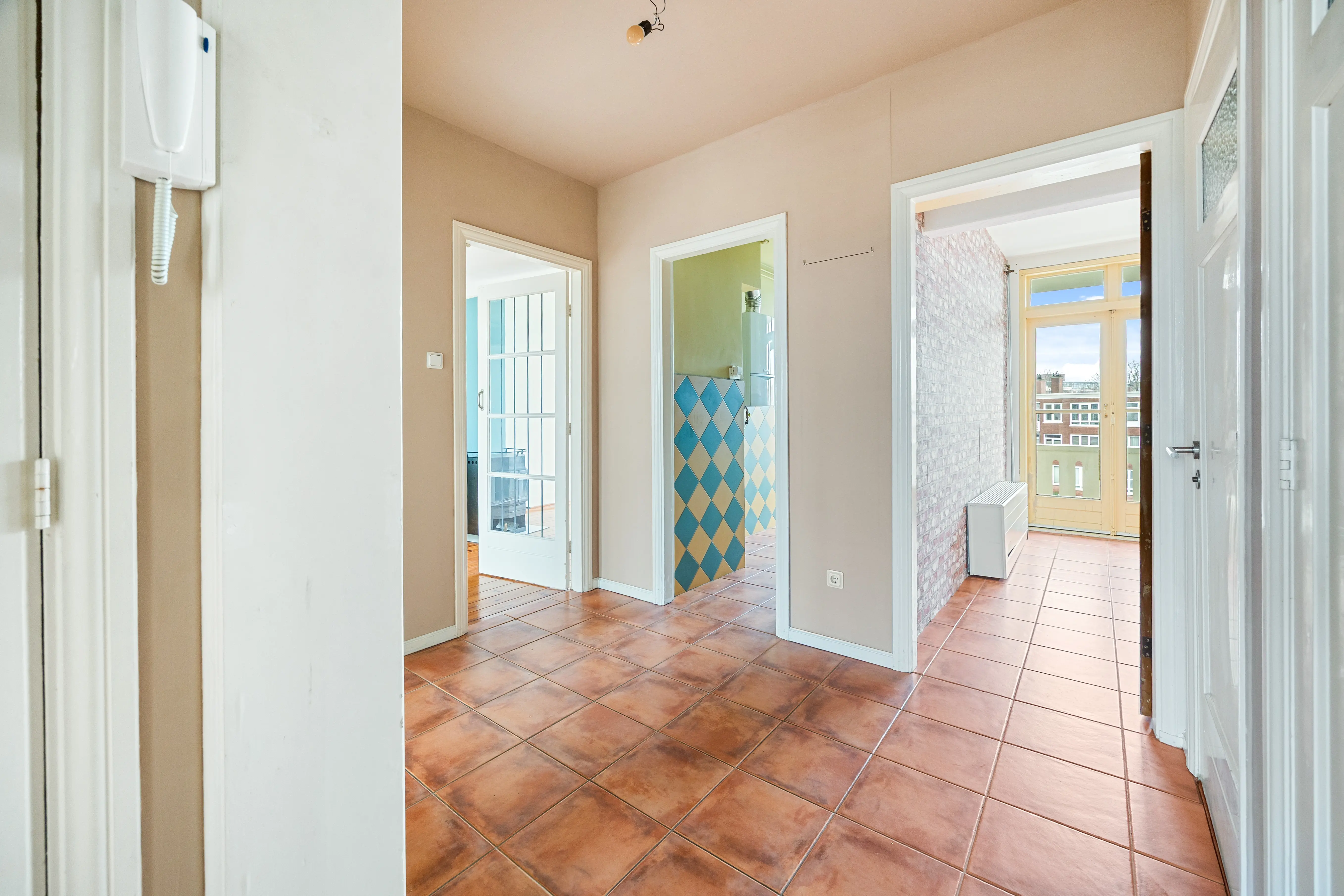 This spacious apartment, located on the fourth and top floor, offers 76 m² of living space and is located in a small apartment complex (built in 1952). It features a living/dining room and two bedrooms. Both the front and rear have balconies. The living room offers expansive views of the waterway and houseboats of the Veenendaalkade, as well as the The Hague skyline. Would you like to create an extra bedroom? This can easily be done by removing a wall between the living and dining room. The kitchen, bathroom fixtures, and electrical fixtures are basic and require modernization.