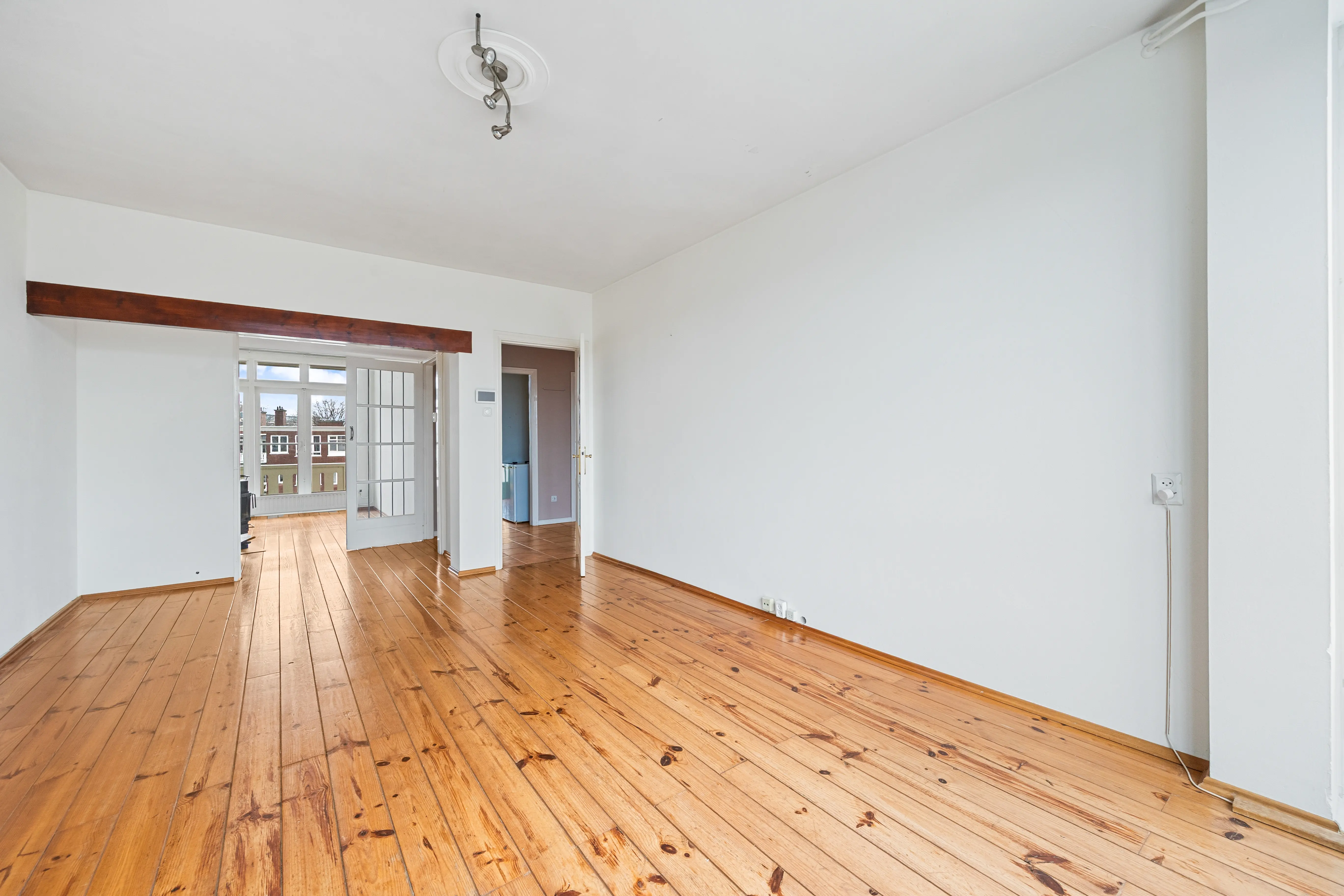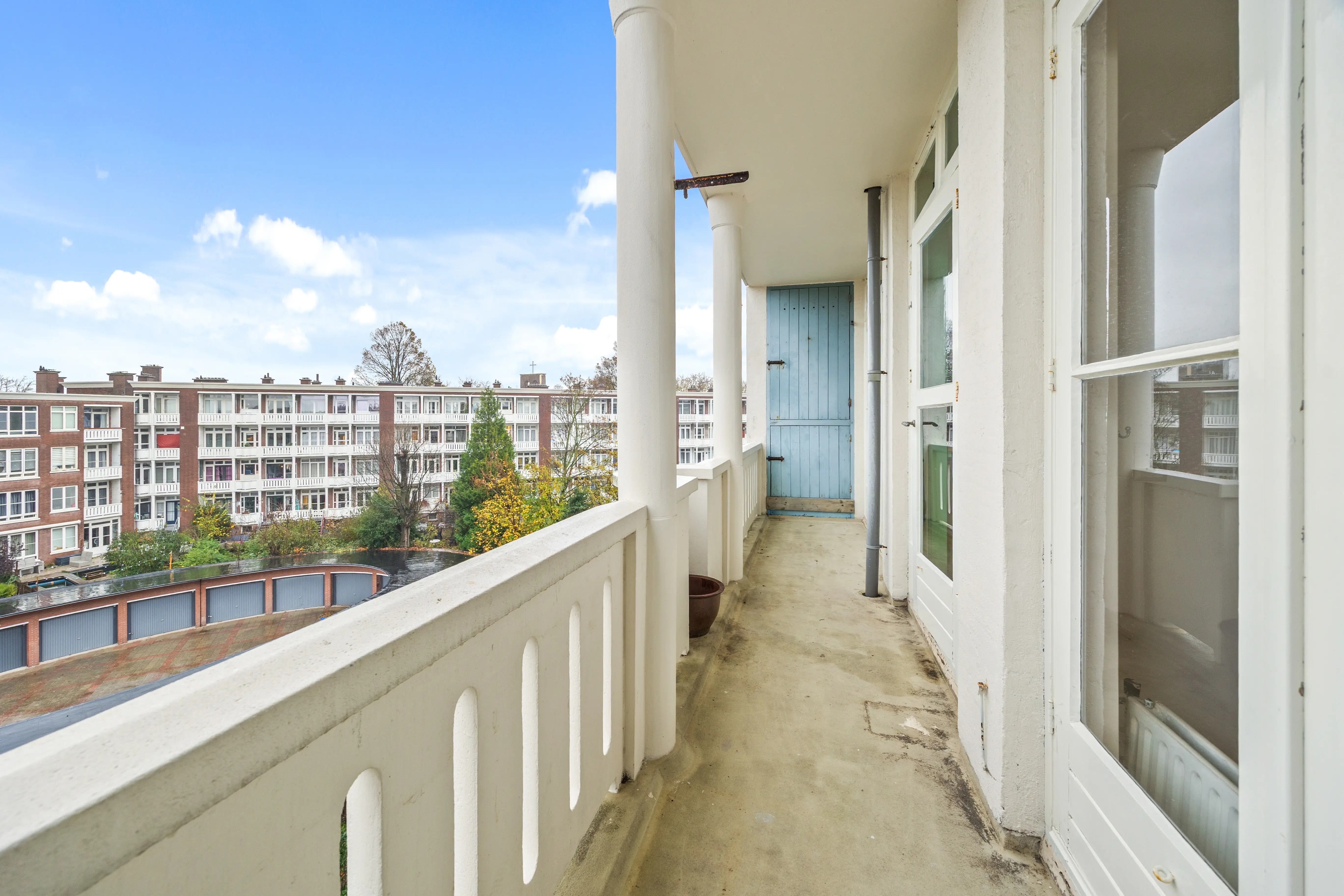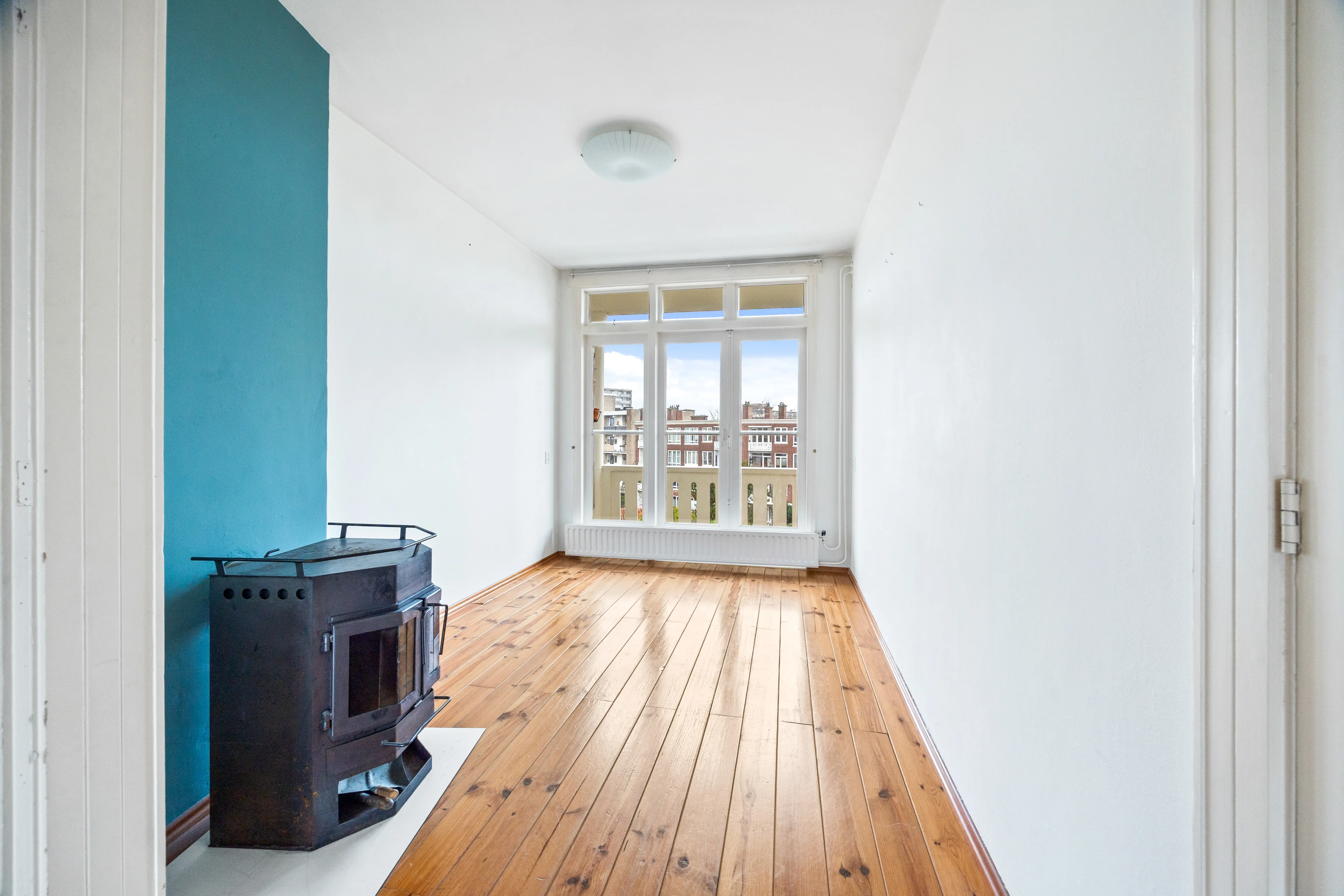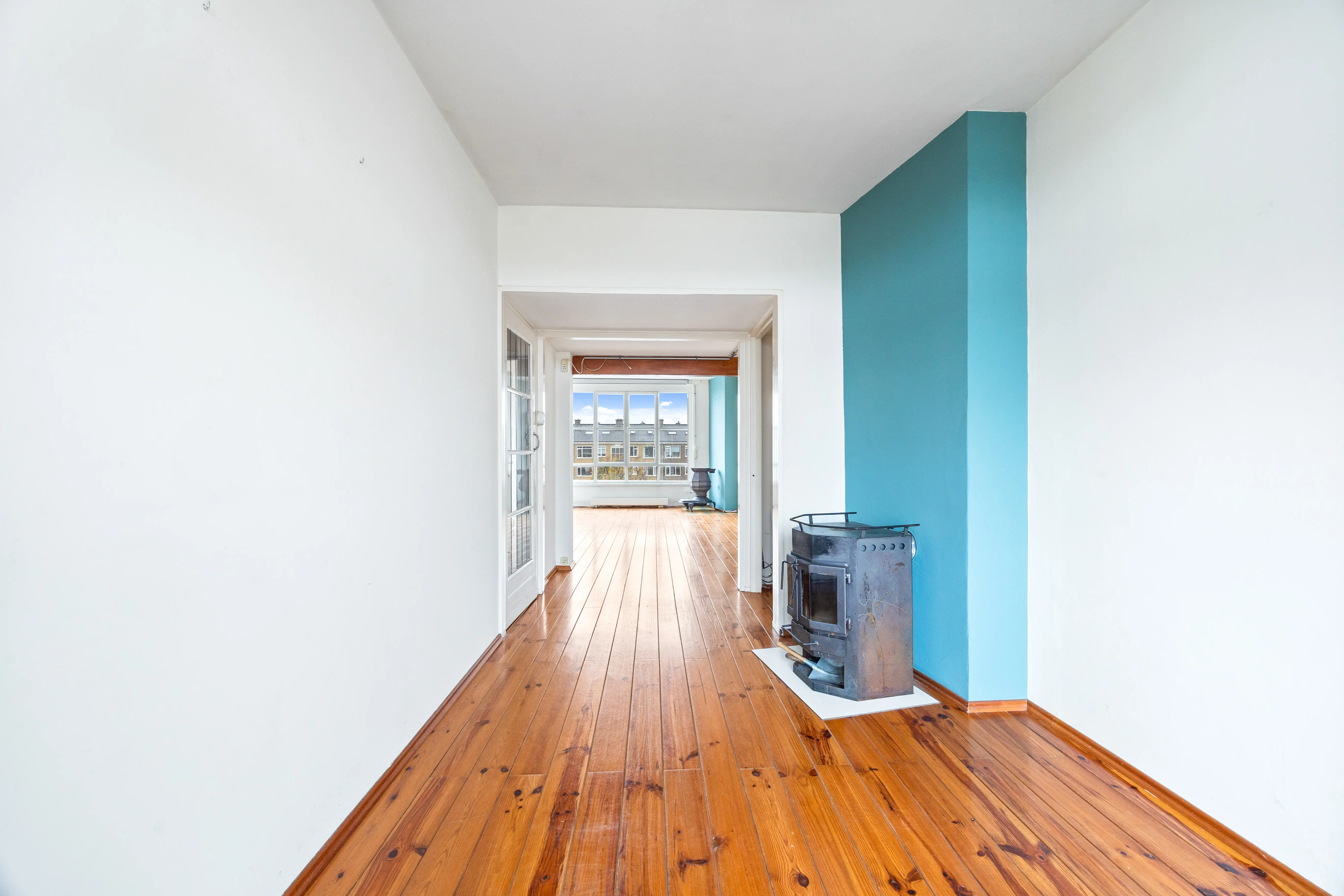 This spacious apartment, located on the fourth and top floor, offers 76 m² of living space and is located in a small apartment complex (built in 1952). It features a living/dining room and two bedrooms. Both the front and rear have balconies. The living room offers expansive views of the waterway and houseboats of the Veenendaalkade, as well as the The Hague skyline. Would you like to create an extra bedroom? This can easily be done by removing a wall between the living and dining room. The kitchen, bathroom fixtures, and electrical fixtures are basic and require modernization.