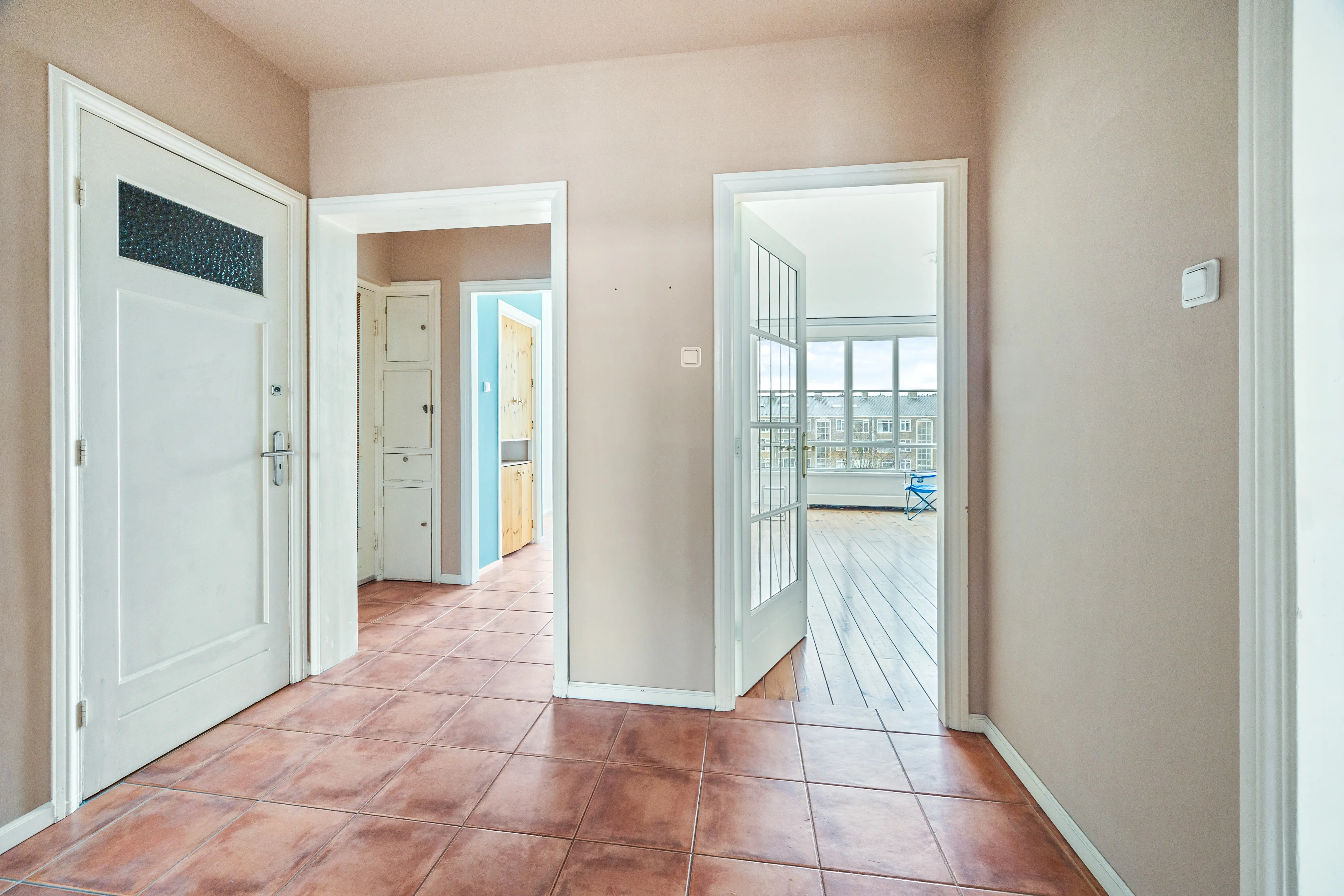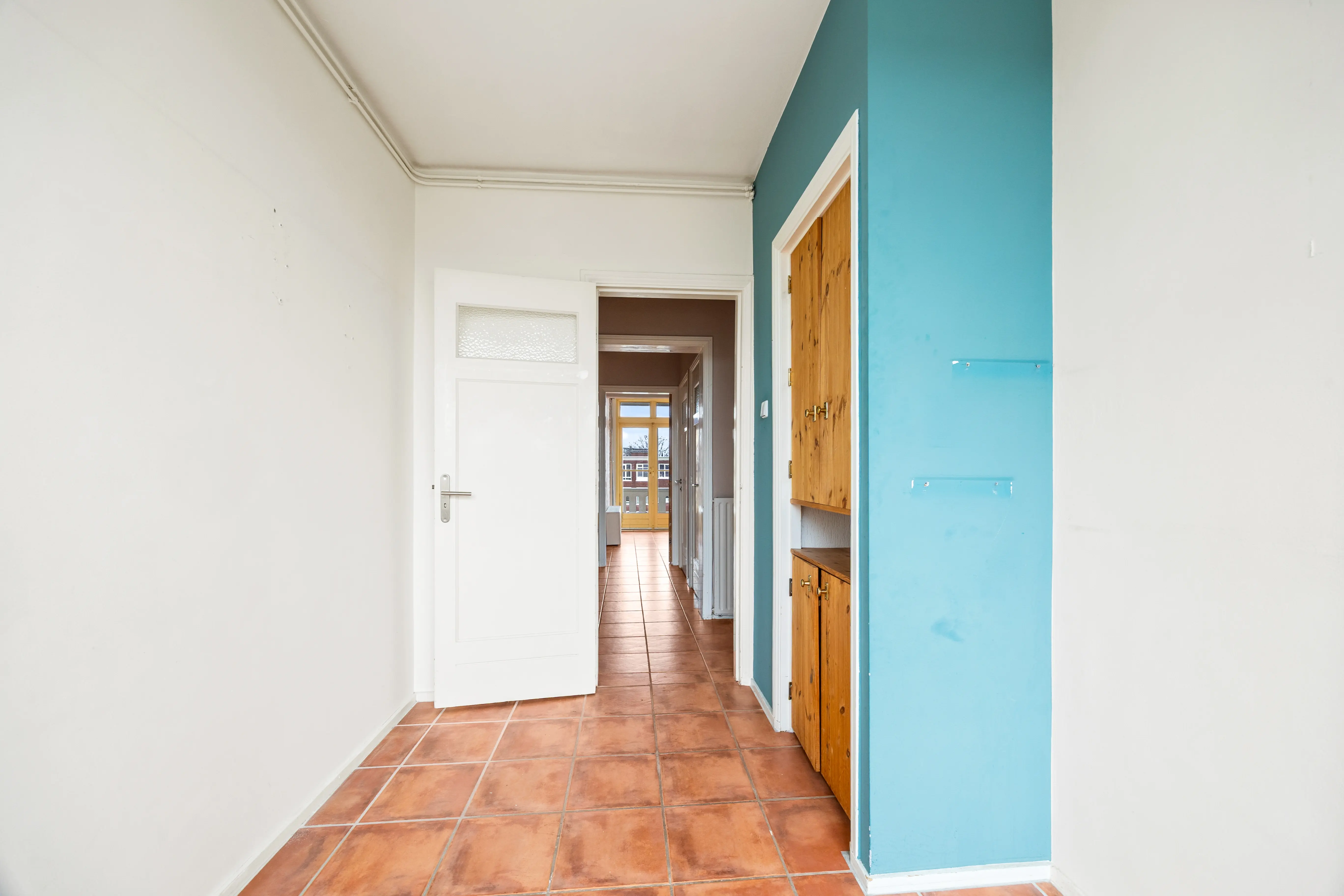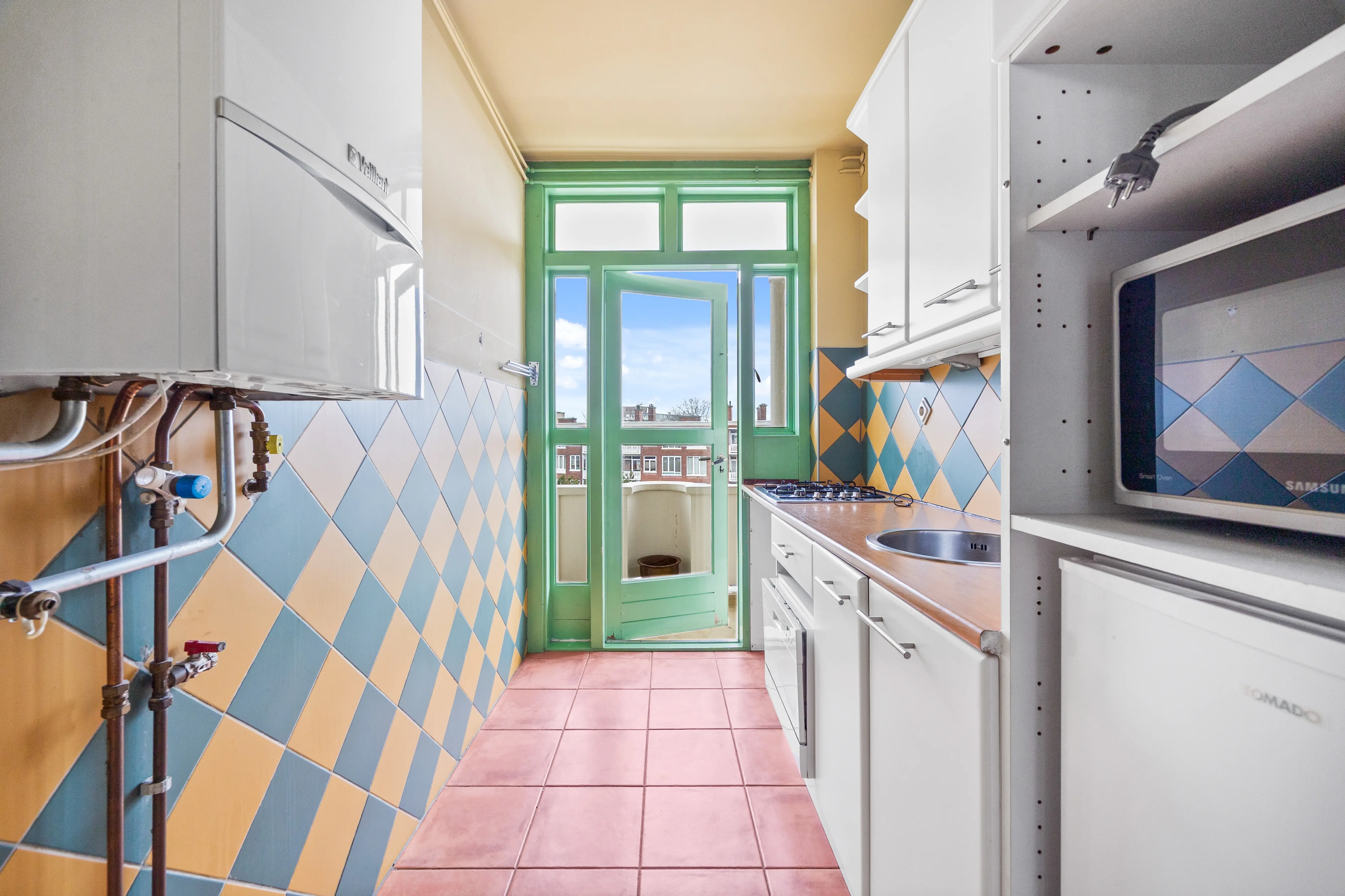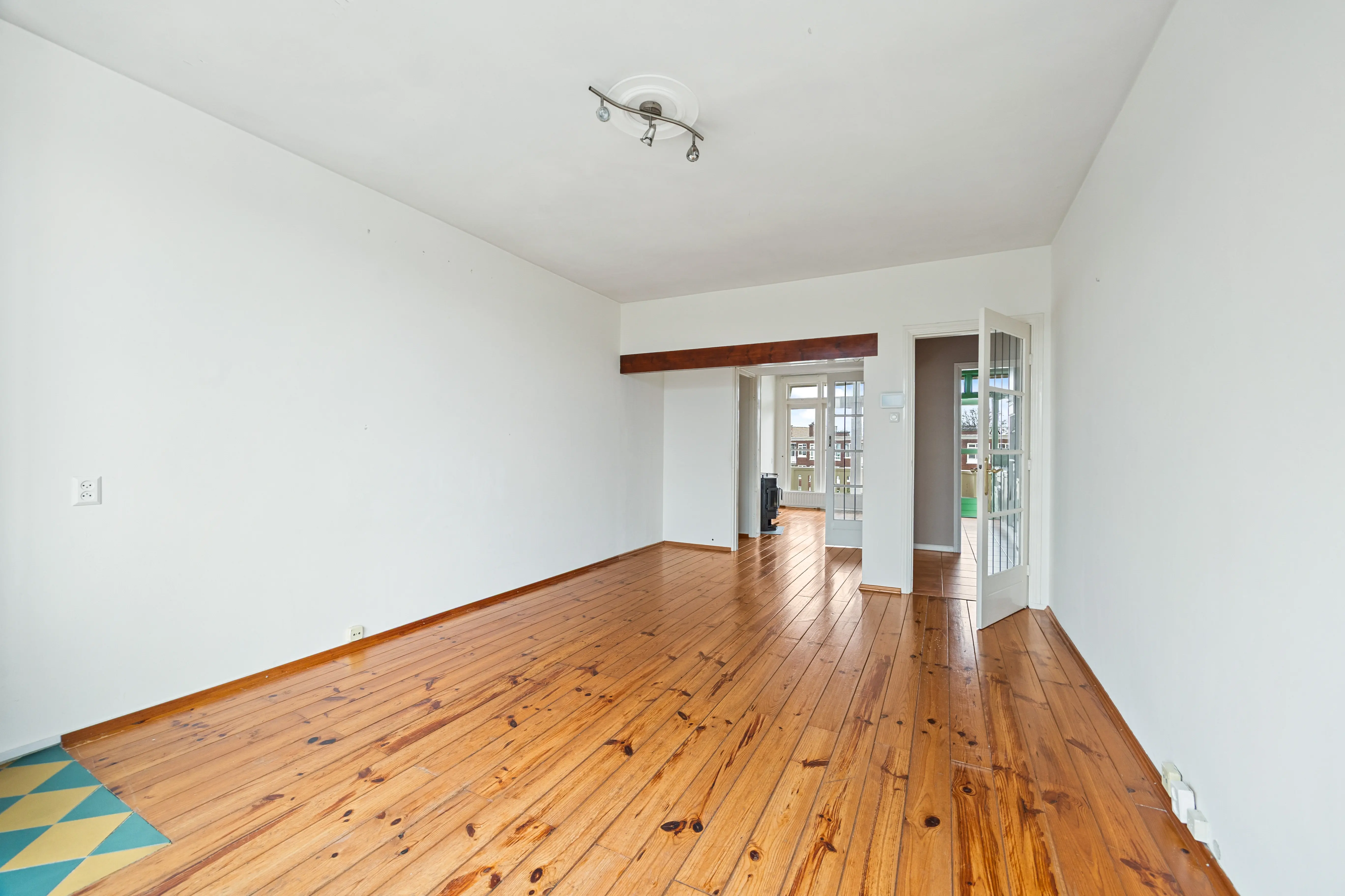 This spacious apartment, located on the fourth and top floor, offers 76 m² of living space and is located in a small apartment complex (built in 1952). It features a living/dining room and two bedrooms. Both the front and rear have balconies. The living room offers expansive views of the waterway and houseboats of the Veenendaalkade, as well as the The Hague skyline. Would you like to create an extra bedroom? This can easily be done by removing a wall between the living and dining room. The kitchen, bathroom fixtures, and electrical fixtures are basic and require modernization.