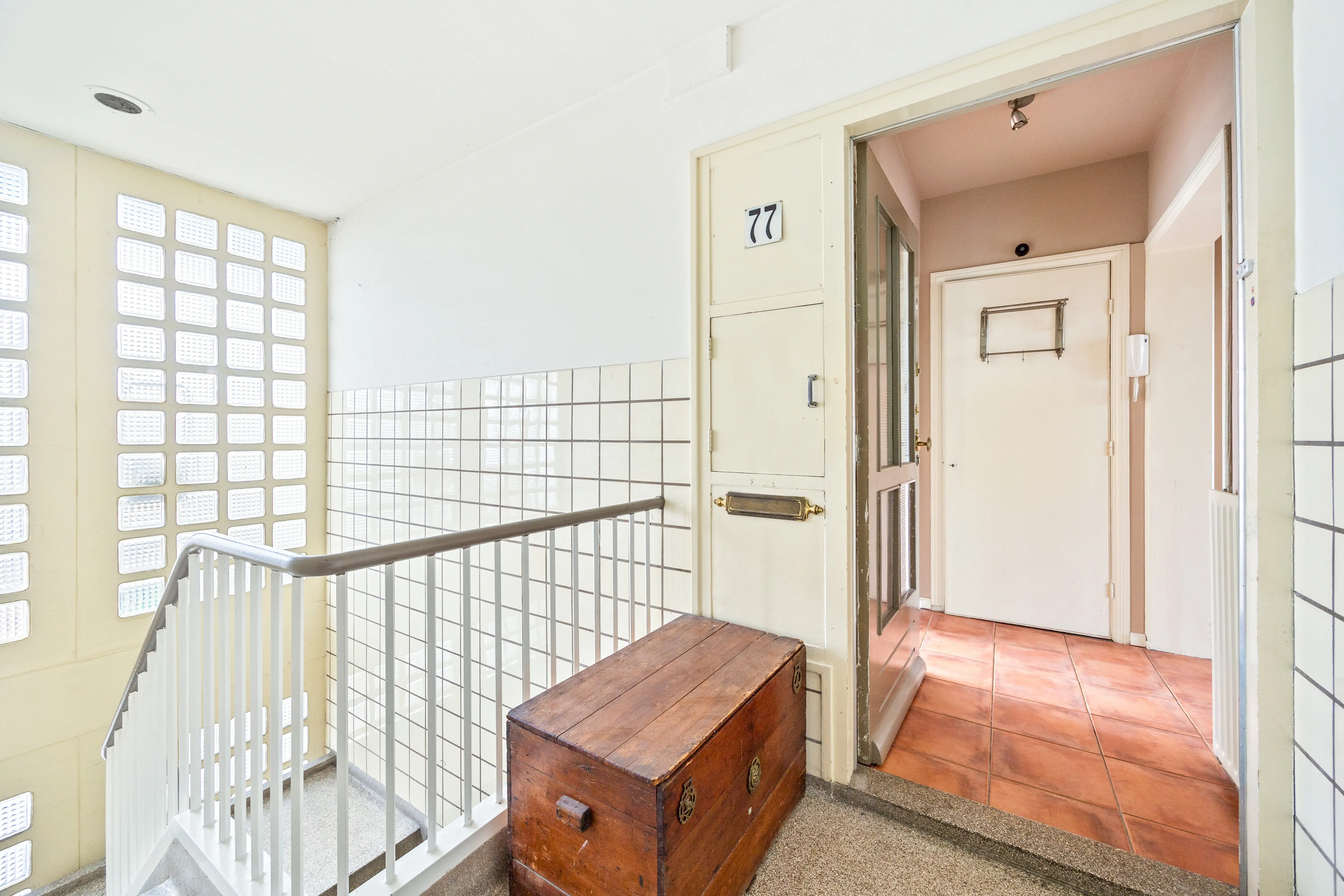 Het afgesloten portiek beschikt over een bellen- en brievenbustableau. In de onderbouw bevindt zich een privé bergruimte (8m²). Met de trap wordt de entree op de vierde woonlaag bereikt.