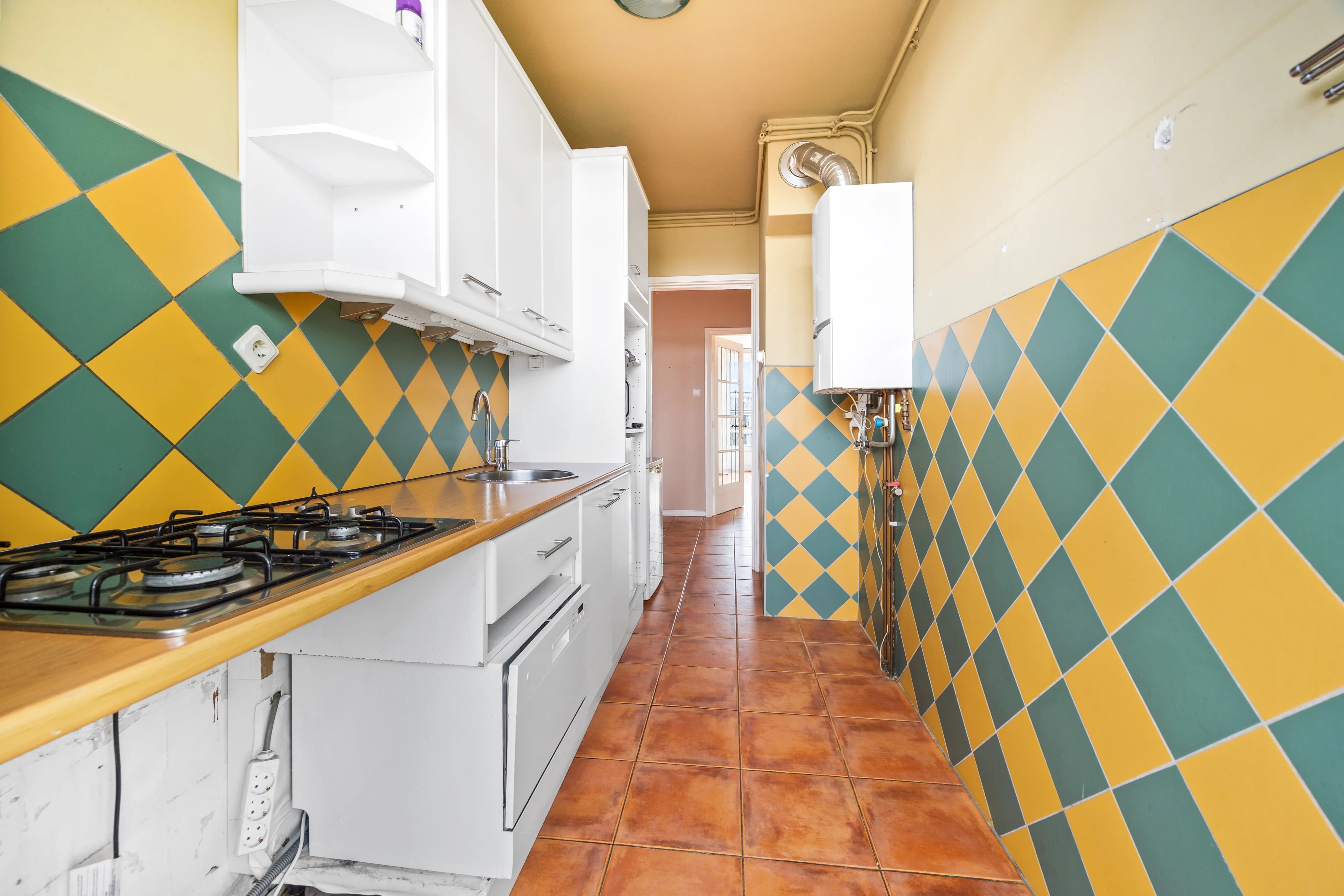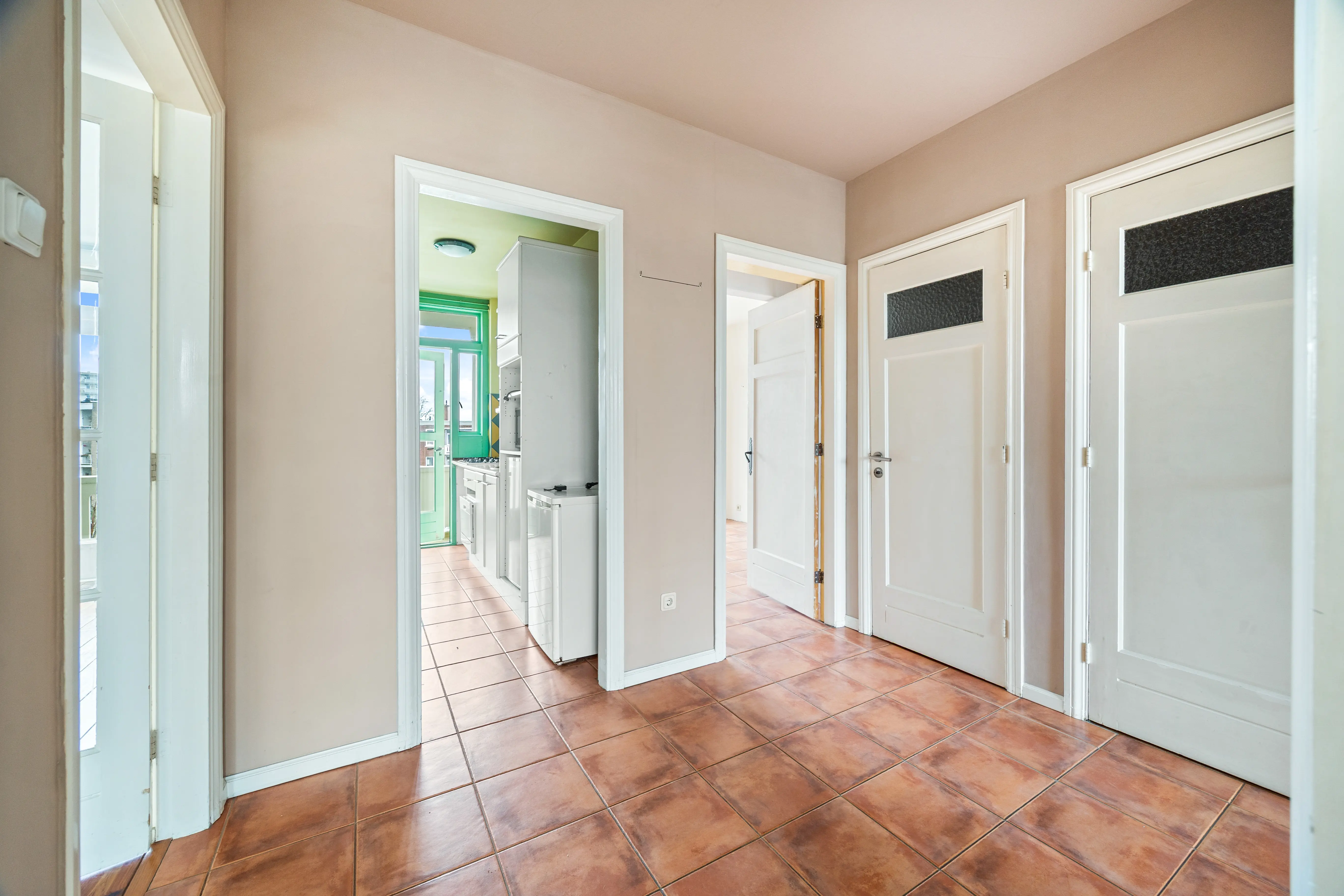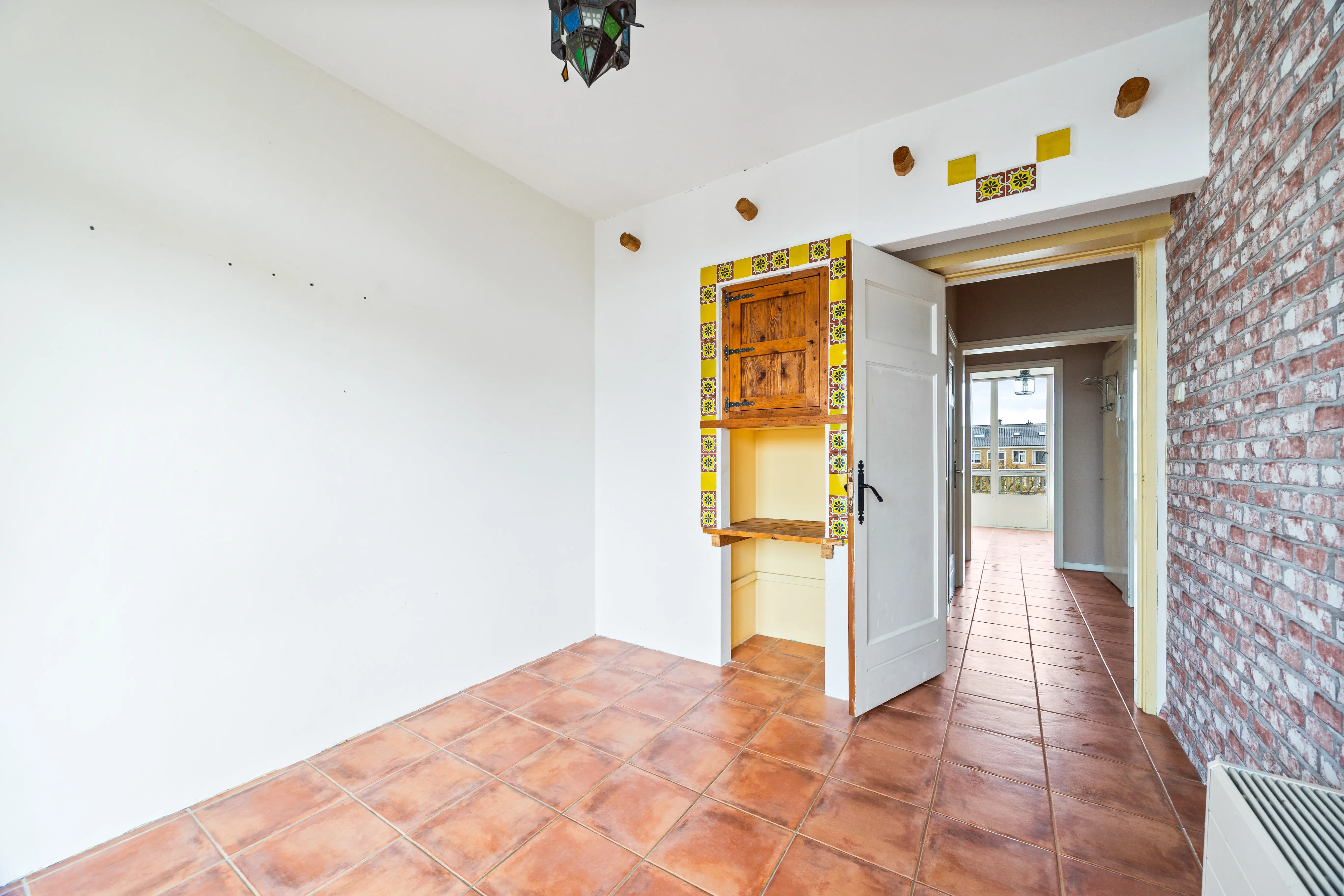 In de hal, keuken en achtergelegen slaapkamer liggen plavuizen op de vloer