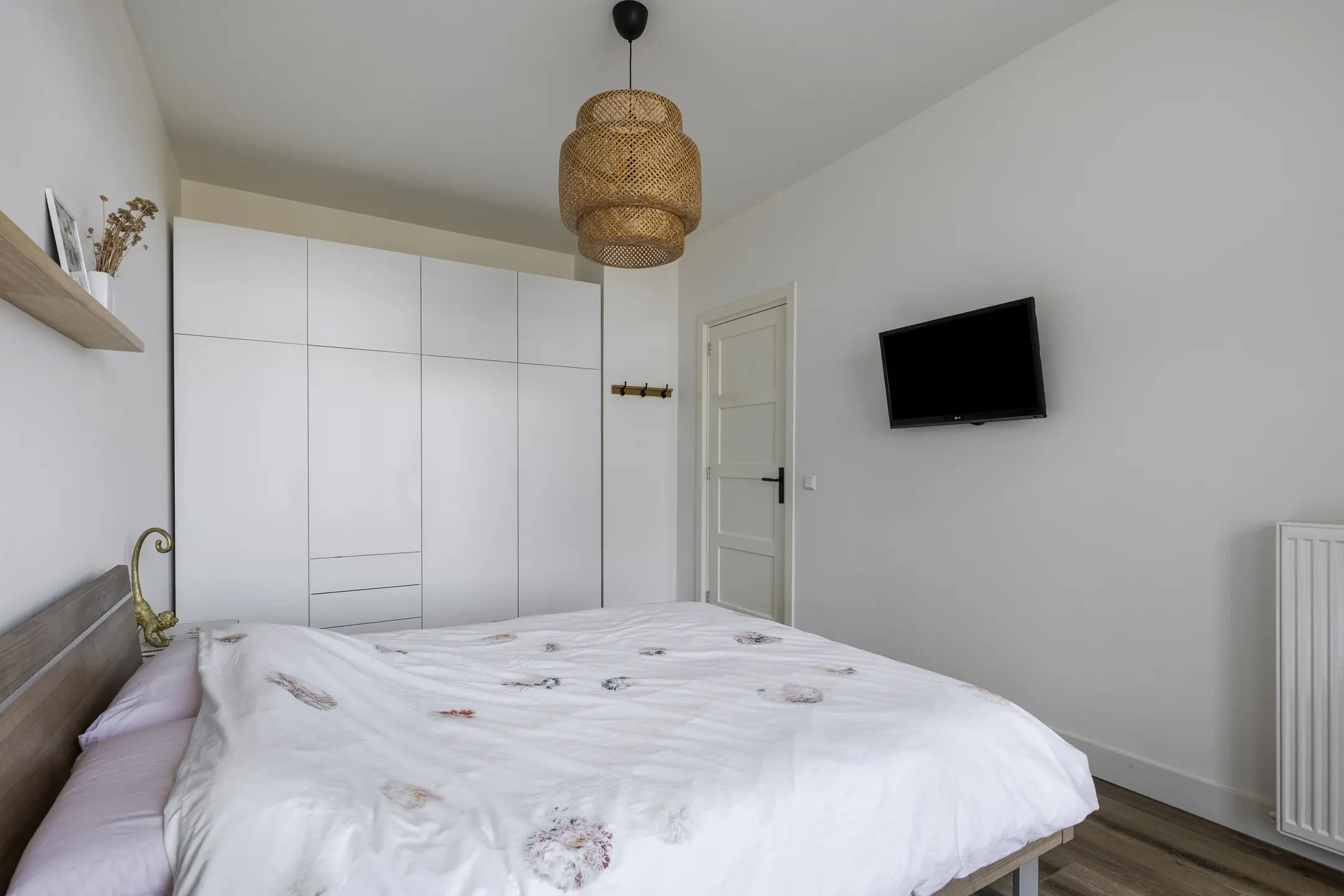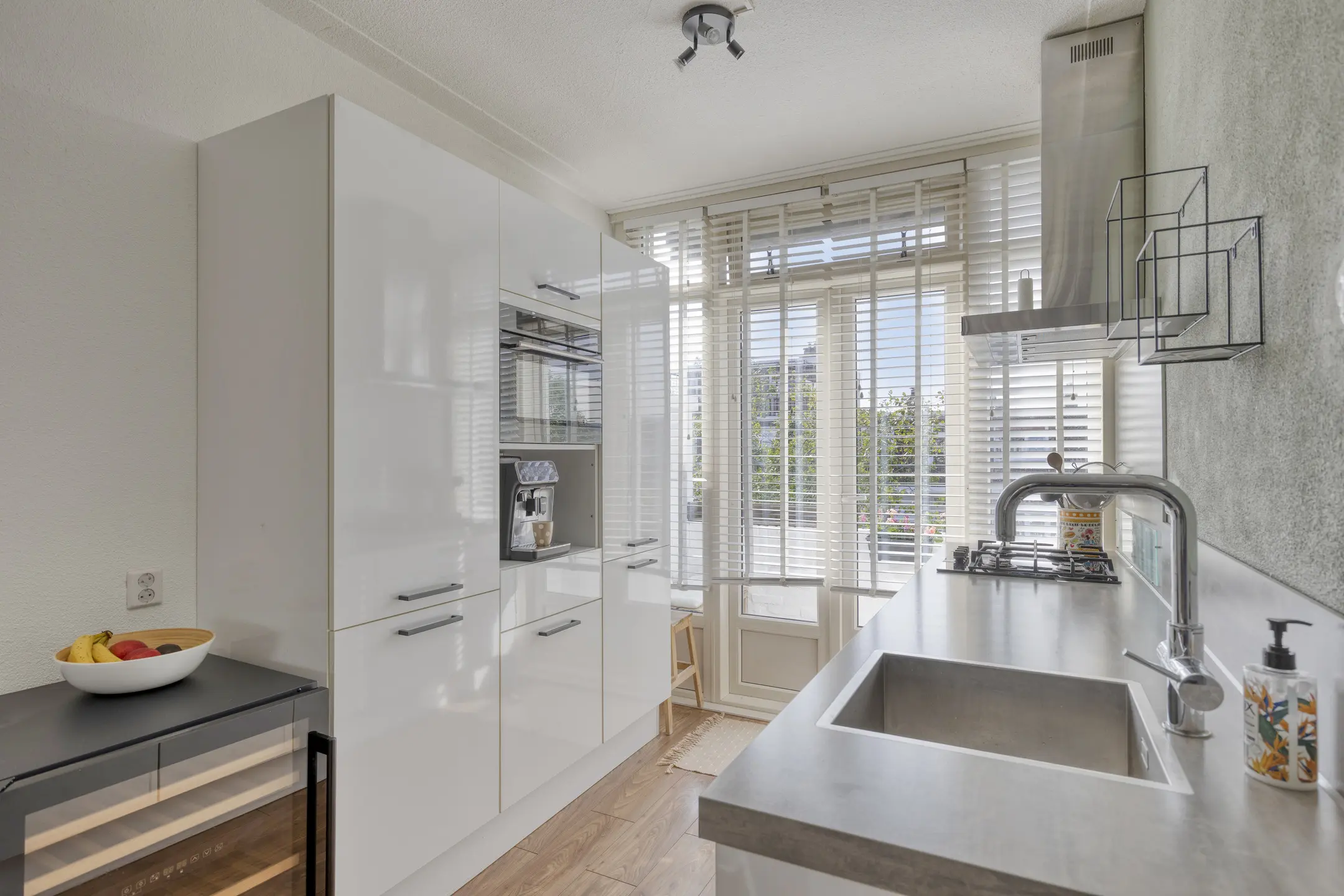 Via de voordeur bereikt u via een trap de eerste verdieping, waar een centrale overloop de diverse vertrekken met elkaar verbindt. Over de gehele lengte van de woning bevindt zich de lichte woonkamer, die doorloopt in de open keuken. Deze keuken, geplaatst in 2014, is voorzien van een koel- vriescombinatie, combimagnetron, vaatwasser, heetwaterkraan, afzuigkap en een vierpits gaskookplaat. De gehele verdieping is keurig afgewerkt met een laminaatvloer. Aan de achterzijde ligt een ruime slaapkamer van circa tien vierkante meter, met ensuite een badkamer voorzien van een inloopdouche en wastafel. Direct naast deze slaapkamer bevindt zich de bijkeuken met opstelplaats voor de wasmachine en droger. Separaat is er op deze verdieping nog een toilet aanwezig. Aan de achterzijde van de woning ligt bovendien een ruim balkon over de volle breedte, waar u heerlijk kunt genieten van de buitenlucht.