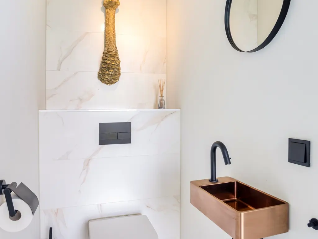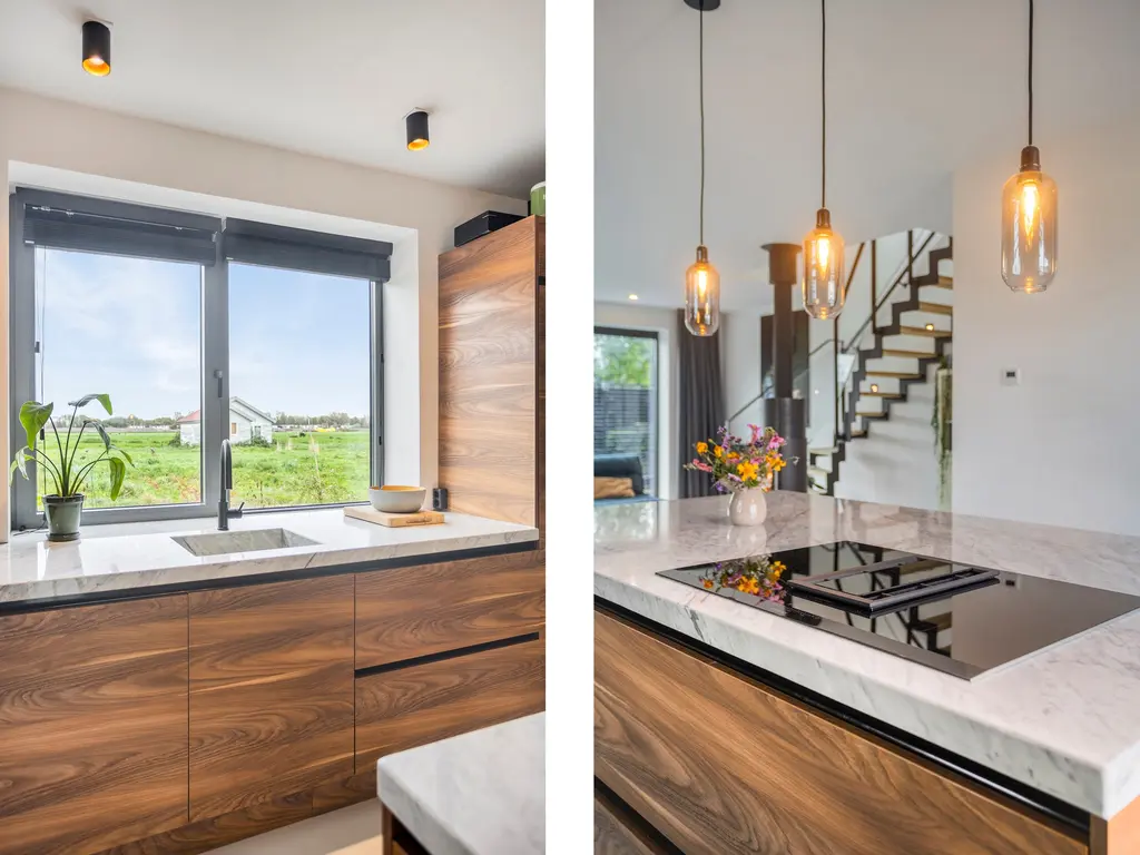 Aan de voorzijde bevindt zich de keuken – een echte blikvanger: tijdloos, strak en van hoge kwaliteit. Het royale kookeiland met barzitje vormt het hart van de ruimte, ideaal voor een gezellig ontbijt of een borrel met vrienden. De keuken is voorzien van een inductiekookplaat met geïntegreerde afzuiging, vaatwasser, oven, ingebouwd koffiezetapparaat, koelkast, vriezer en een luxe marmeren werkblad. Dankzij de open verbinding met de eetruimte ontstaat een sfeervol geheel waar koken, eten en wonen perfect samenkomen.
