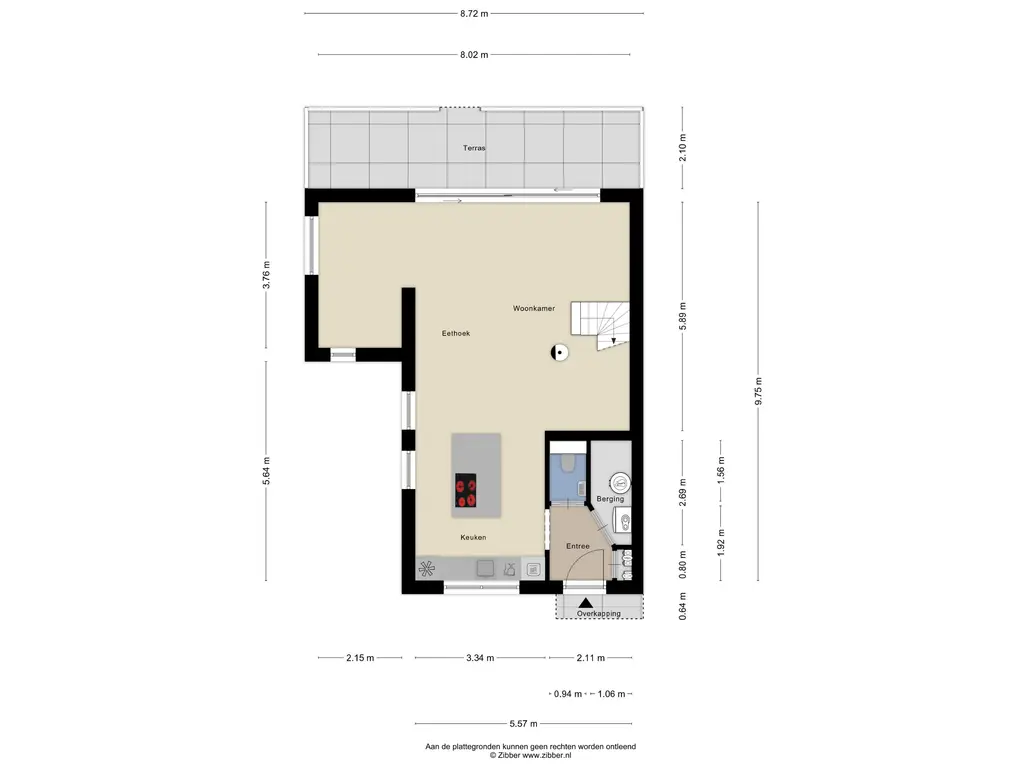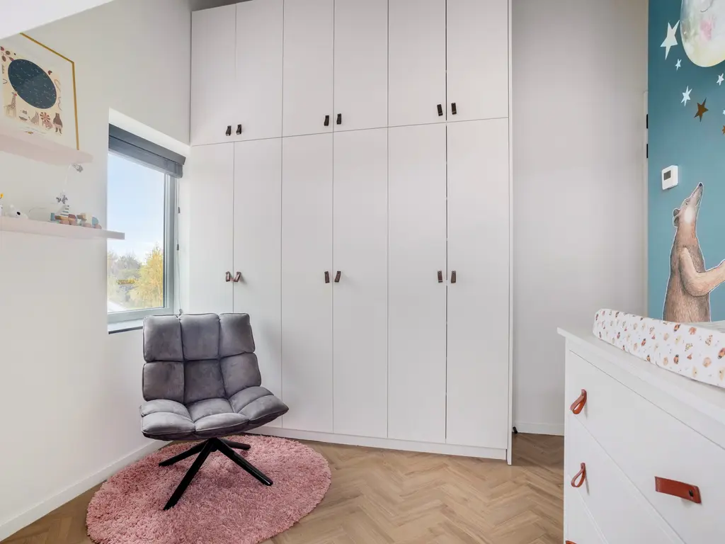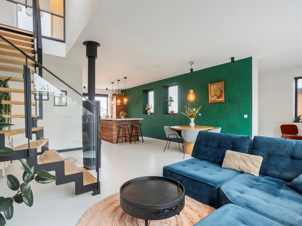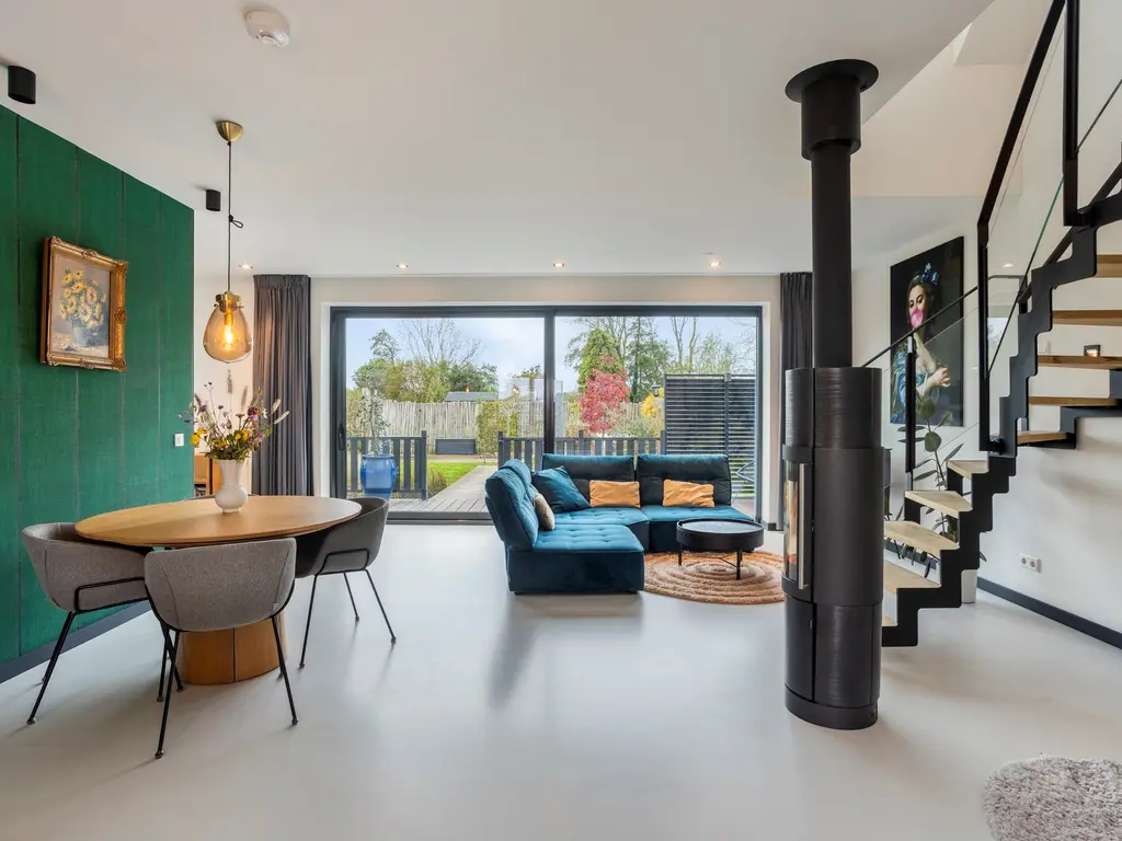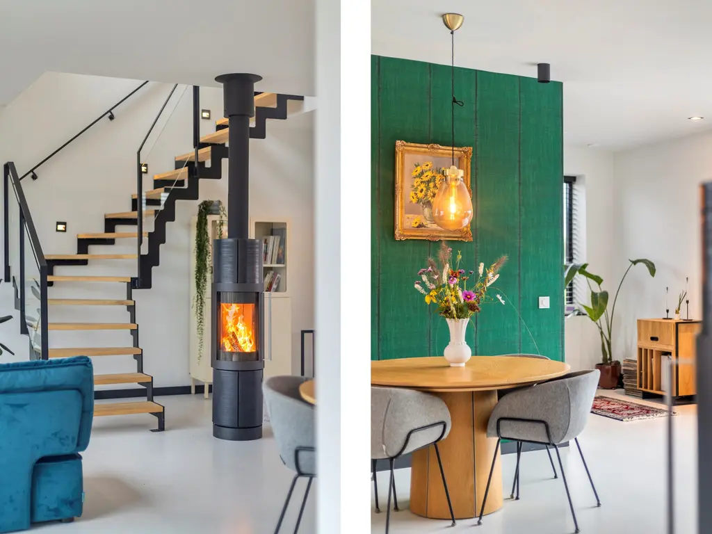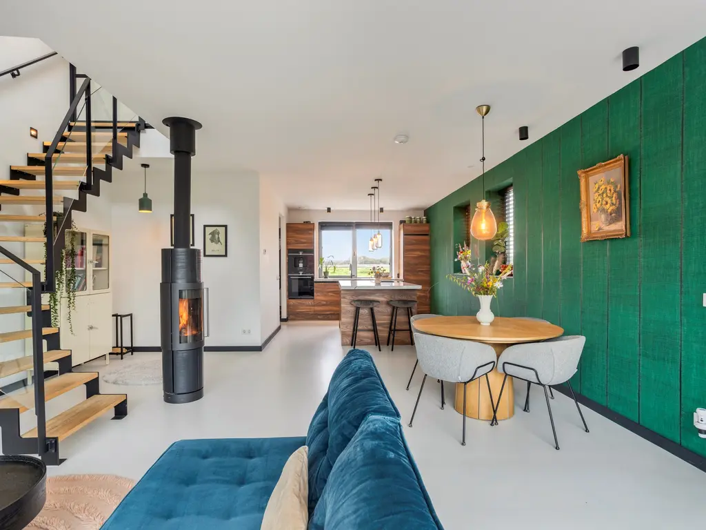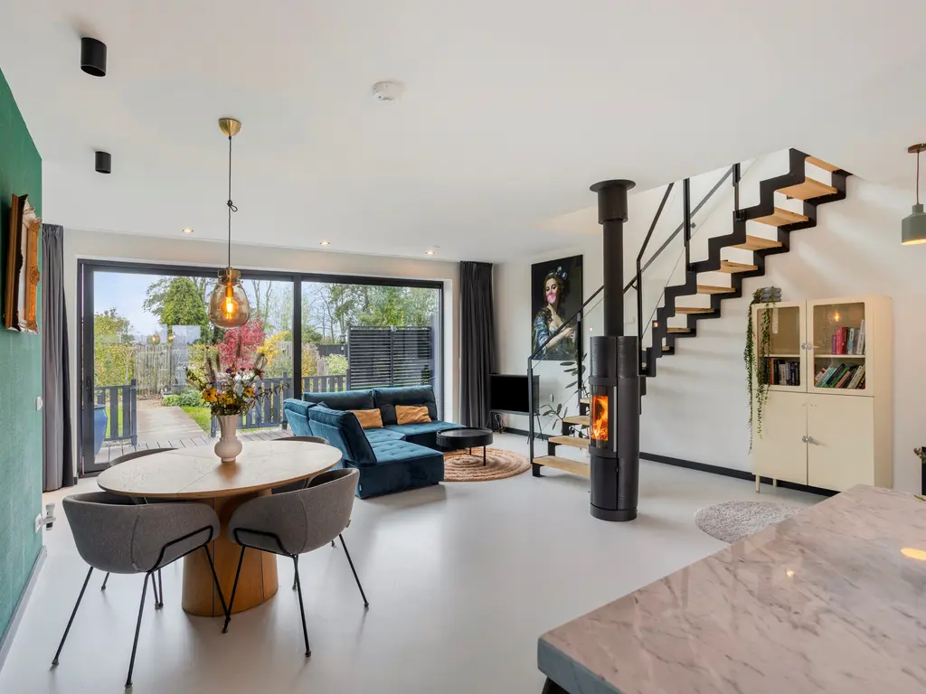 De woonkamer is verrassend ruim en licht, met een grote glazen schuifpui die het binnen- en buitenleven naadloos met elkaar verbindt. De ruimte is speels ingedeeld en biedt een apart gedeelte dat momenteel in gebruik is als kantoor of werkruimte, ideaal voor thuiswerken of als leeshoek. Hier bestaat tevens de mogelijkheid om eenvoudig een derde slaapkamer te creëren. Achterin bevindt zich het tuingerichte zitgedeelte, waar in alle rust van het uitzicht over de tuin, het groen en het water kan worden genoten. Dit gedeelte staat in open verbinding met de rest van de woonkamer en de sfeervolle draaibare houtkachel, die vanuit verschillende hoeken van de kamer te bewonderen is en zorgt voor een warme, uitnodigende sfeer. De stalen trap met frakéhouten treden sluit hier prachtig op aan en vormt een stijlvolle eyecatcher in het interieur.