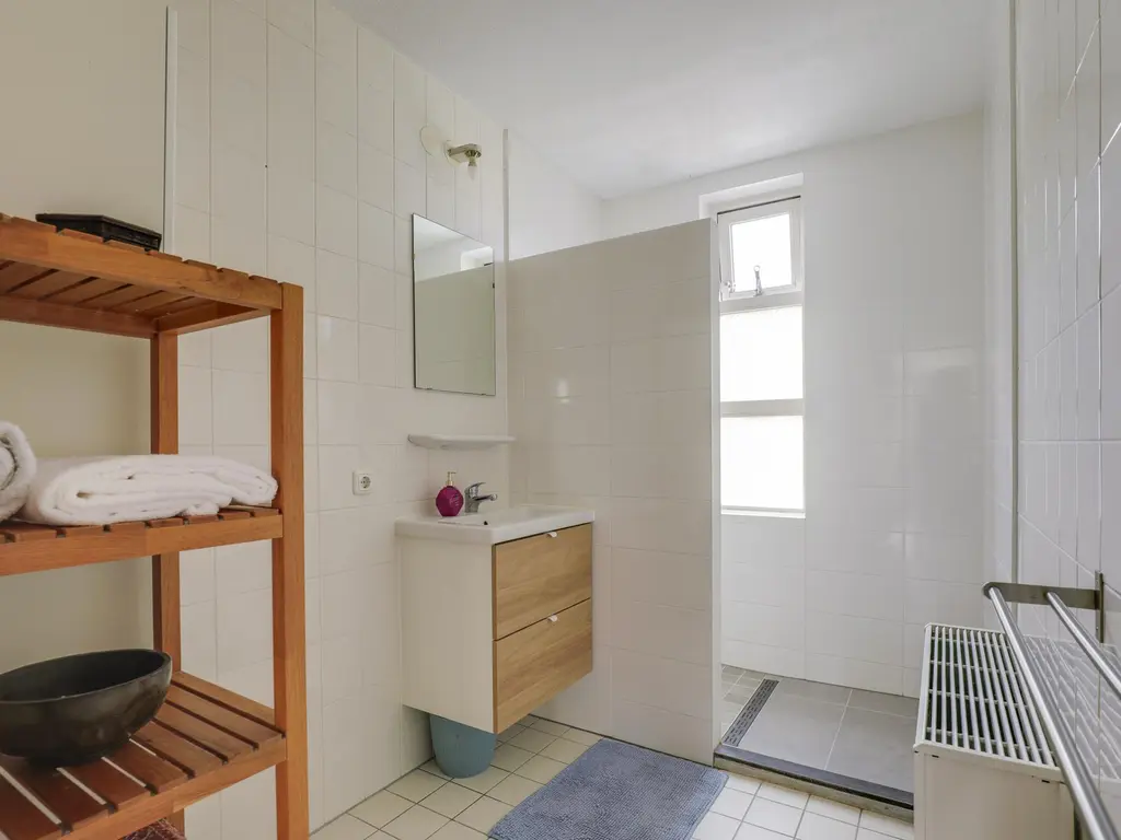 - Badkamer met inloopdouche, wastafel, wastafelmeubel en toilet