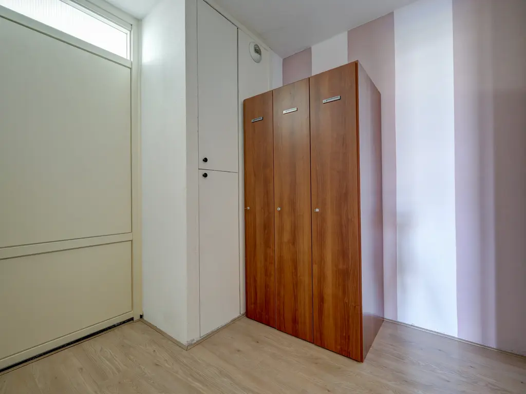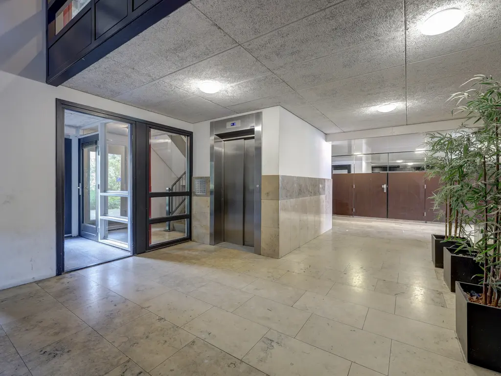 Op de begane grond stap je binnen in het afgesloten portiek met bellentableau en brievenbussen. Hier bevinden zich ook de entree naar de bergingen, het trappenhuis en de liftinstallatie. Op de zevende verdieping stappen we de lift uit en lopen naar het einde van de hal, waar we achter de voordeur van het appartement de hal binnenstappen. Daar is voldoende ruimte om de jassen op te hangen en vind je de meterkast.