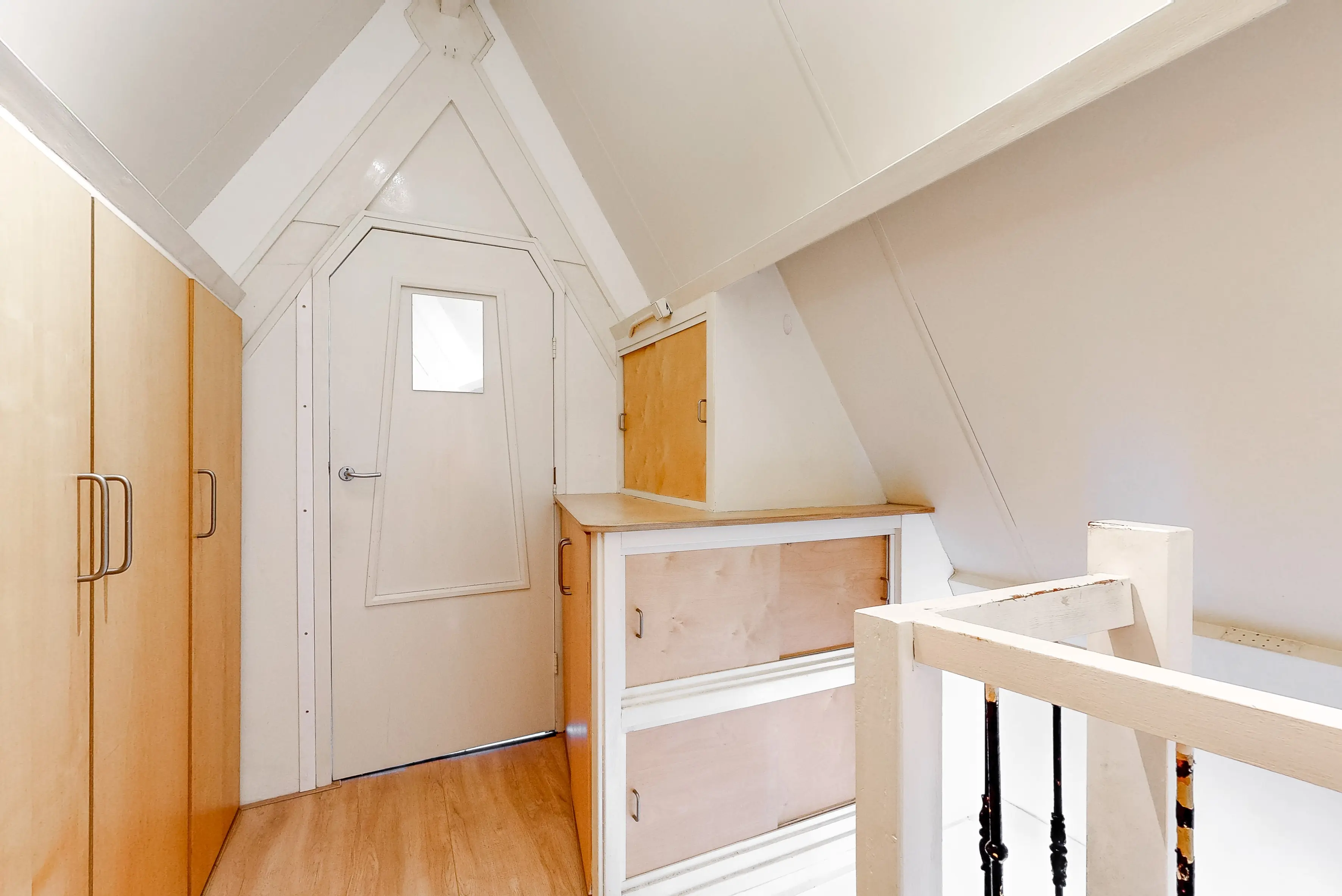 Tweede verdieping: wederom via een vaste trap komt u op de overloop van de bovenste verdieping. Hier vindt u veel kastruimte en toegang tot de twee slaapkamers.