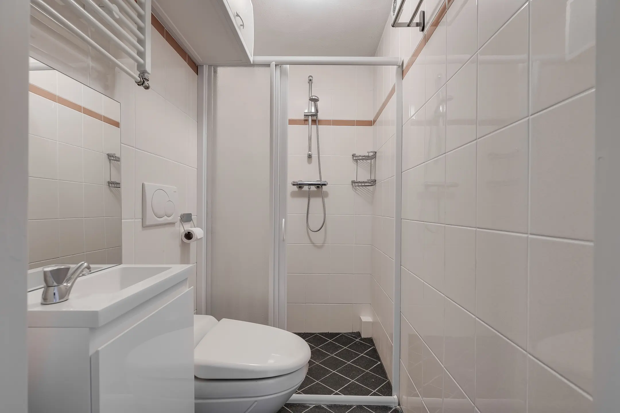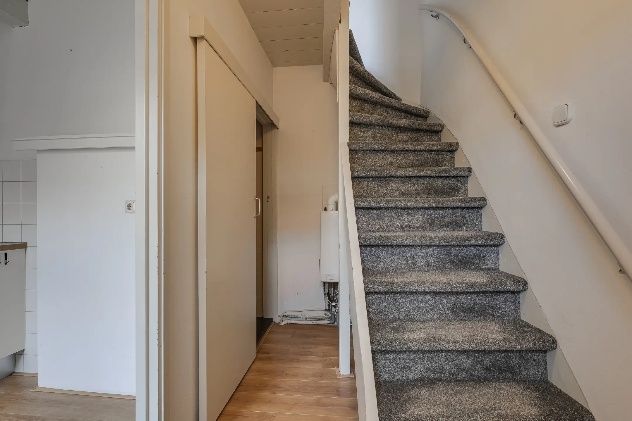 Ground floor: Upon entering you step into a spacious hallway with a fuse box. The kitchen is equipped with a gas stove, extractor hood, and practical storage space. On the ground floor you will also find the neat bathroom with a shower, toilet, sink, towel radiator and cabinet.
