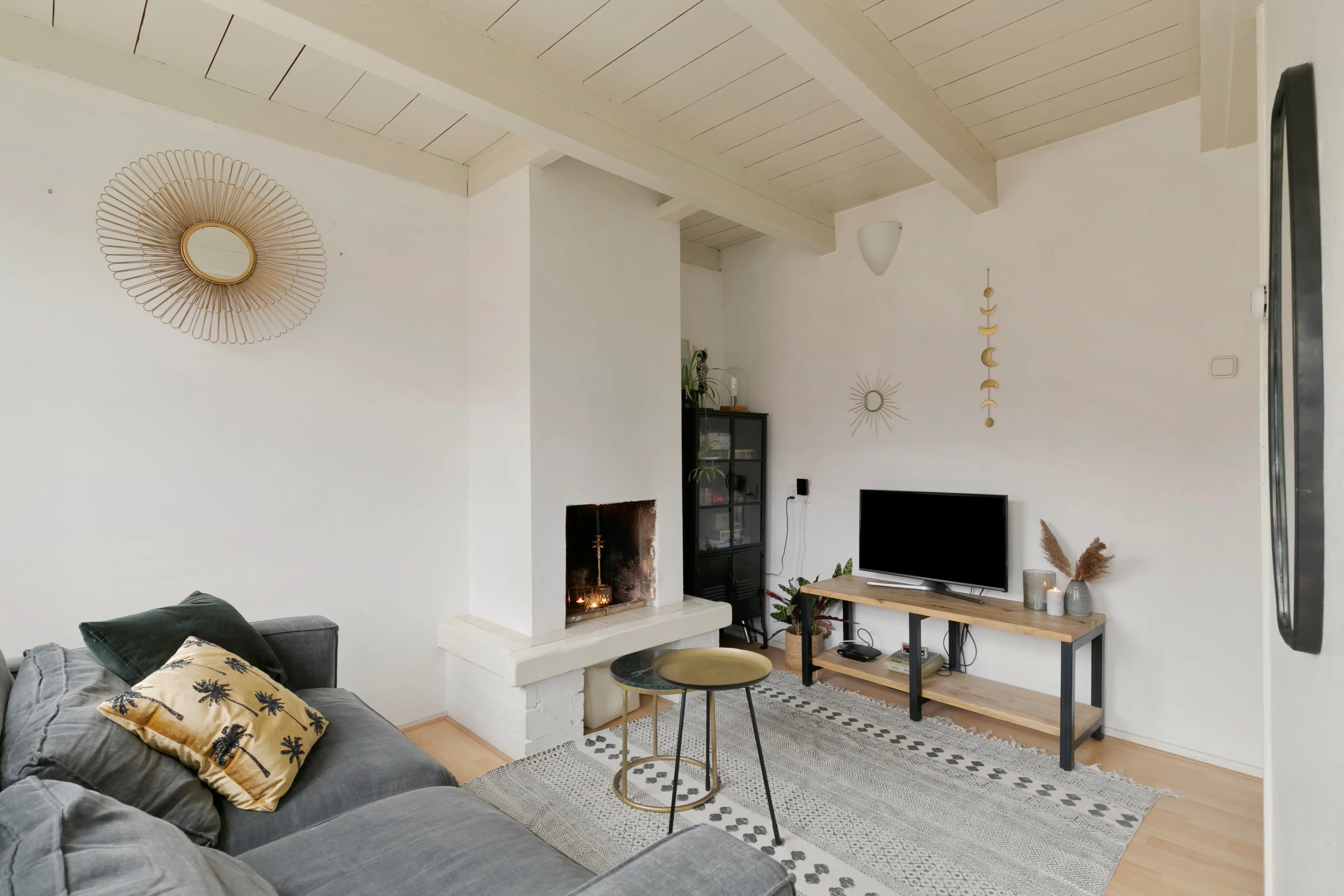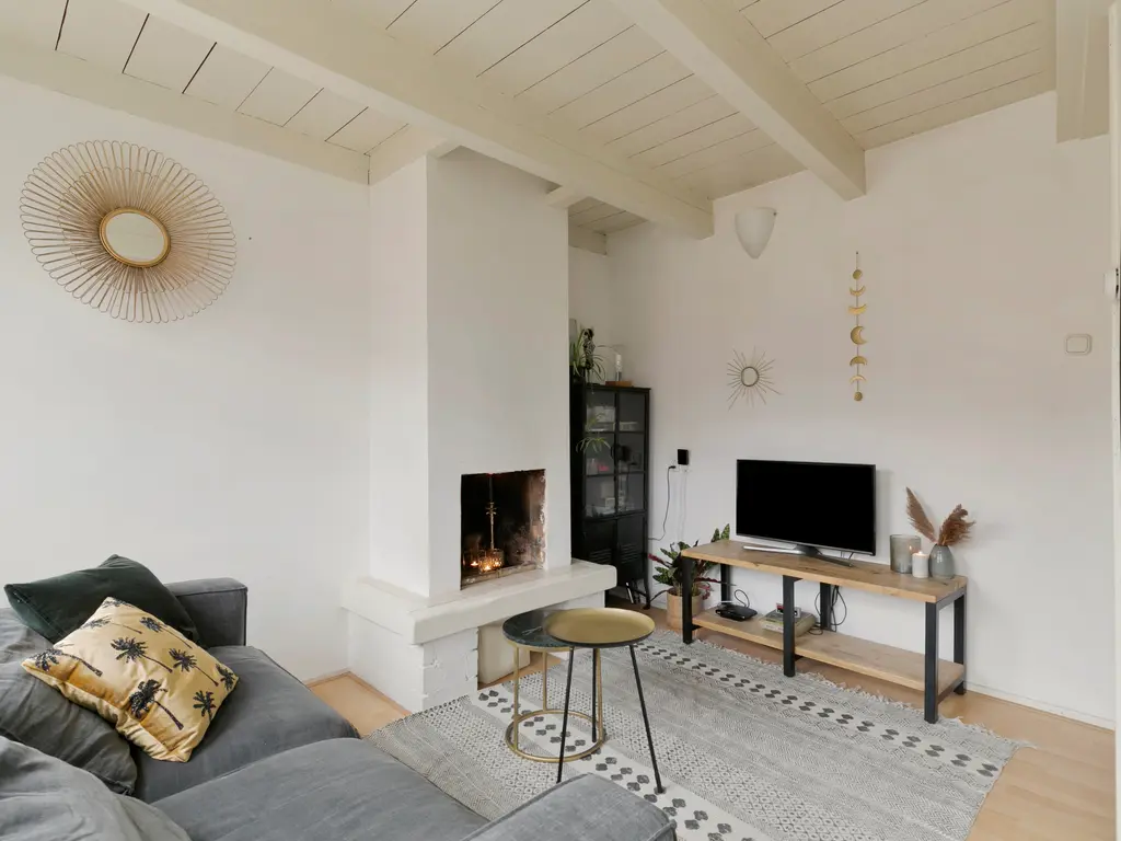 Eerste etage: Een sfeervolle woonkamer met open haard en grote raampartijen die zorgen voor veel lichtinval en een warm gevoel.