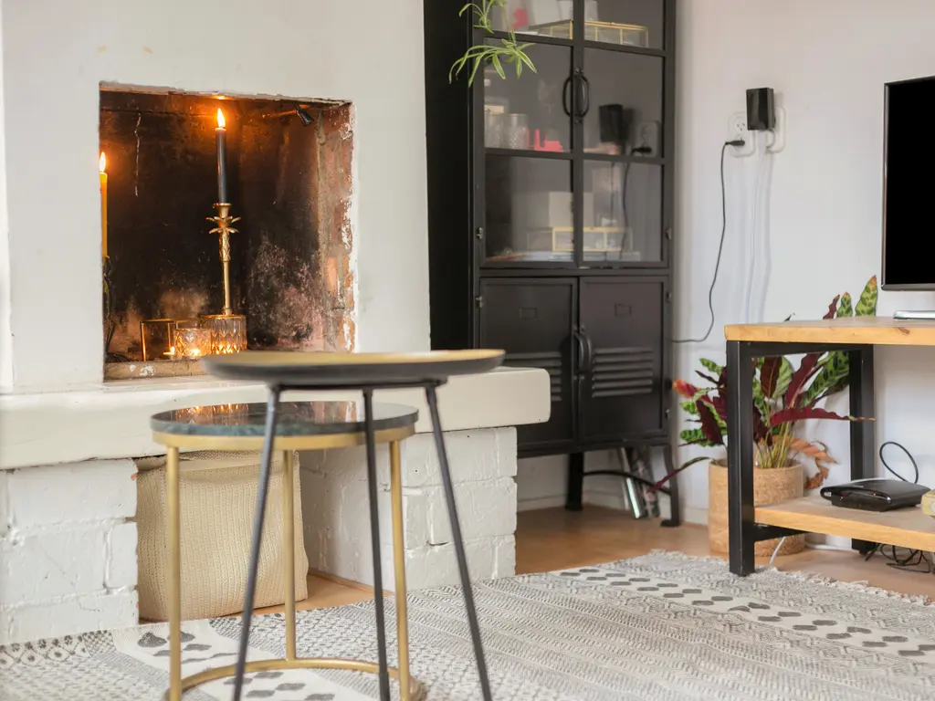 First floor: A cozy living room with a fireplace and large windows that let in plenty of light creating a warm and inviting atmosphere.