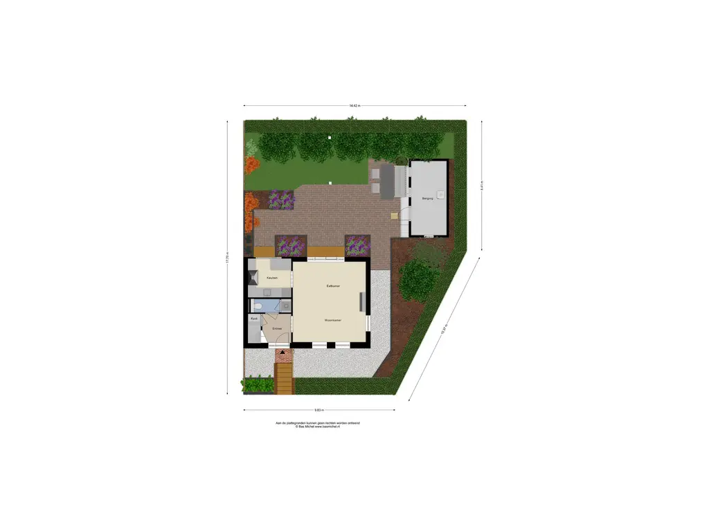 De woning is omringd door een tuin aan maar liefst drie zijden, waardoor u op elk moment van de dag kunt genieten van zon, groen en privacy. De brede achtertuin van circa 14 meter biedt volop ruimte om te ontspannen en is fraai aangelegd met beplanting en hoge bomen. Hier vindt u tevens een vrijstaande, sfeervolle houten berging. De tuin is ook via de zijkant van de woning bereikbaar, wat het geheel extra praktisch maakt.
