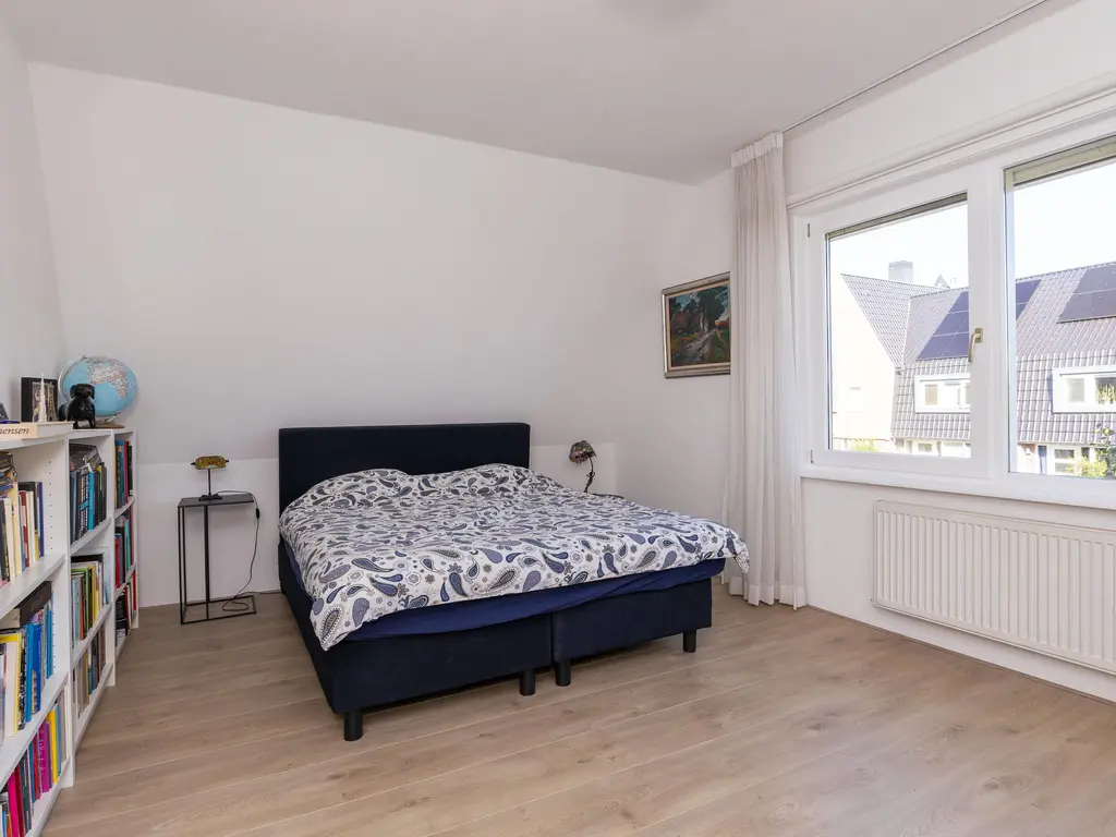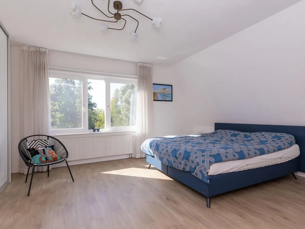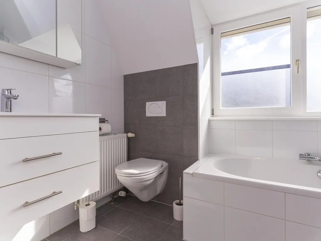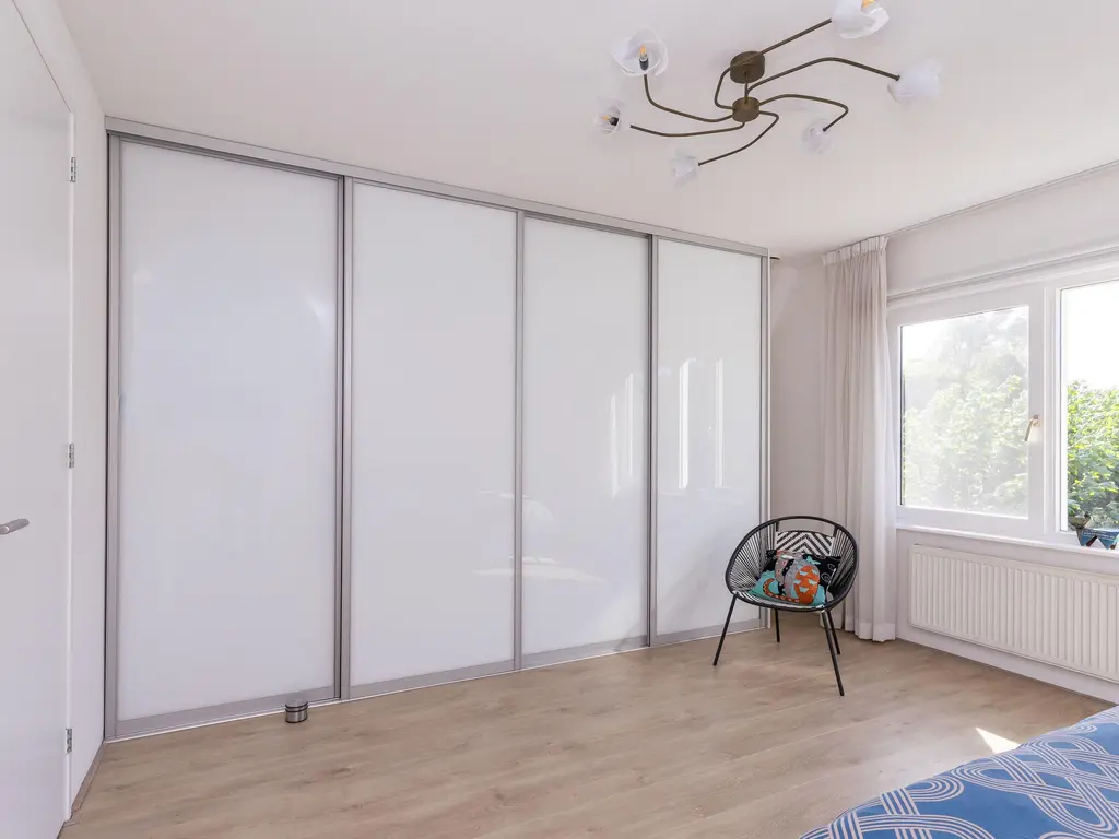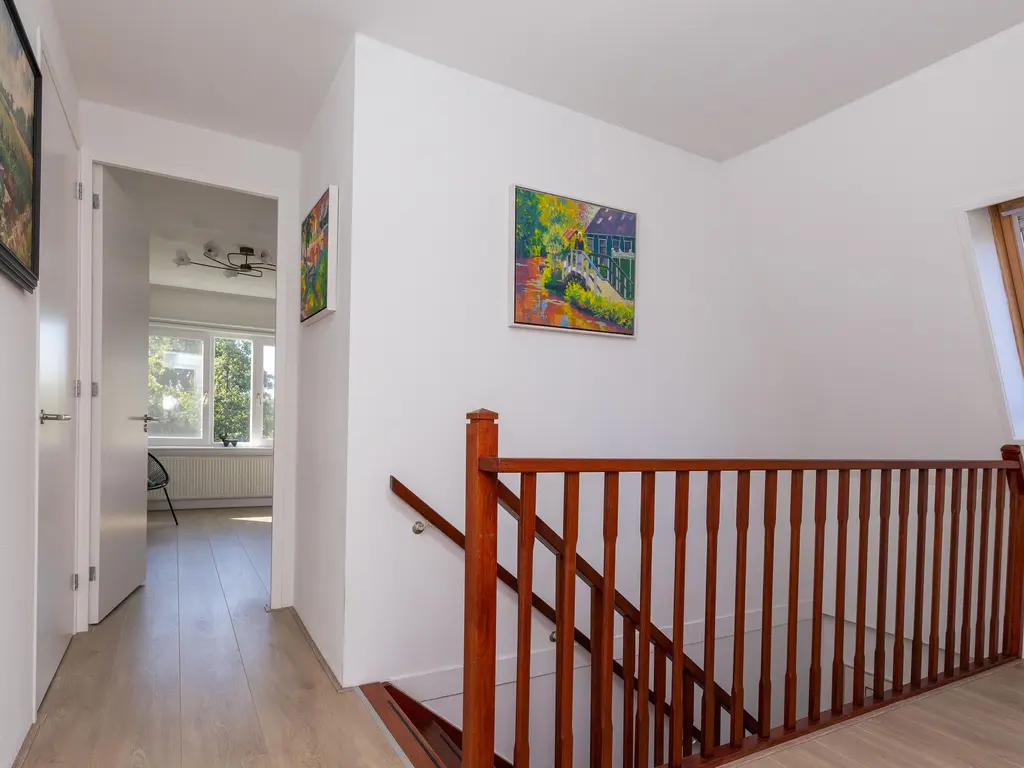 Ruime overloop met trap naar de 2e verdieping, toegang tot een ruime slaapkamer aan de voorzijde, badkamer met een hangcloset, wastafelmeubel, ligbad en een douchehoek, bergkast en een grote slaapkamer aan de achterzijde met een vaste kast en een inloopkast. Beide slaapkamers zijn erg ruim over de volledige breedte van de woning.