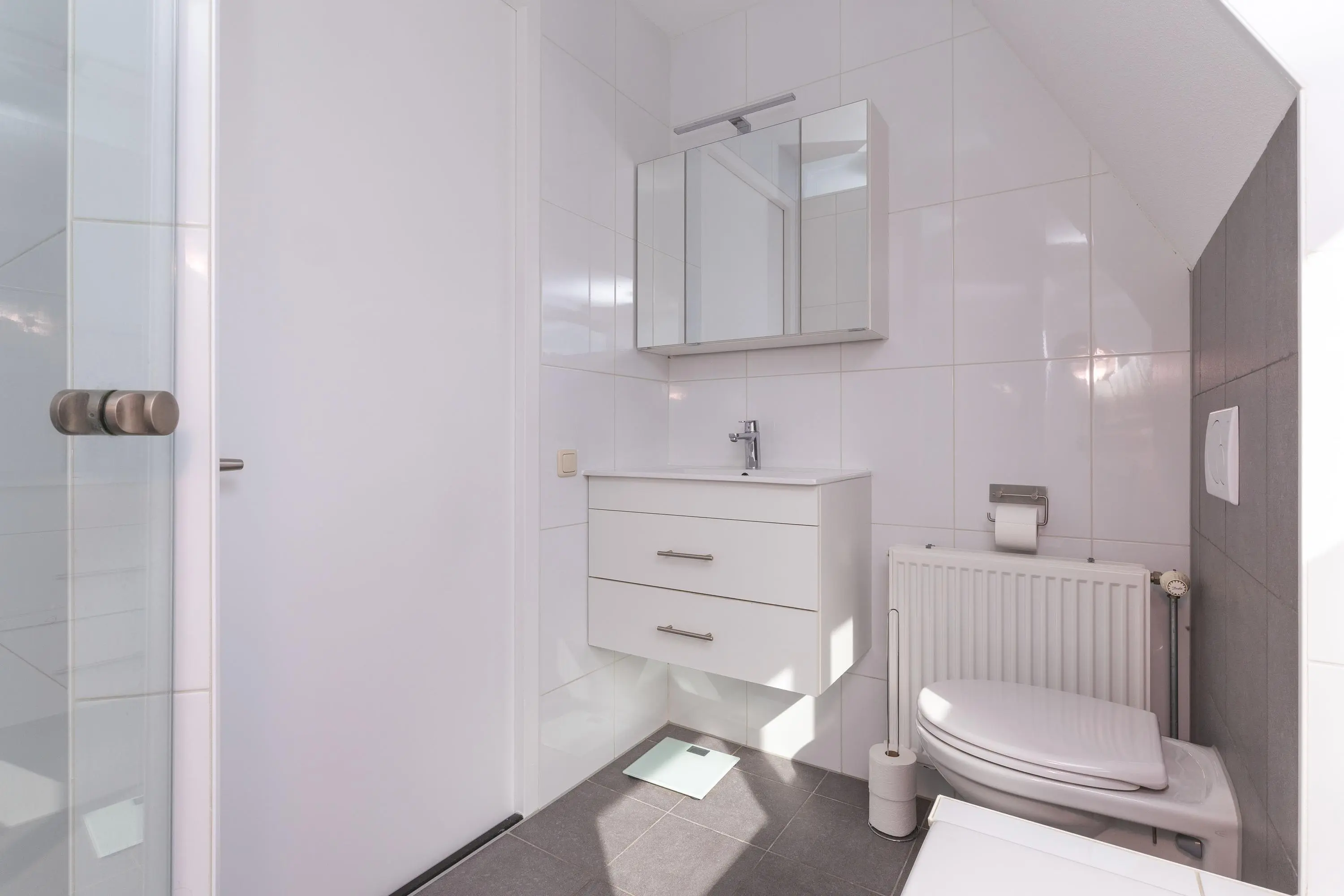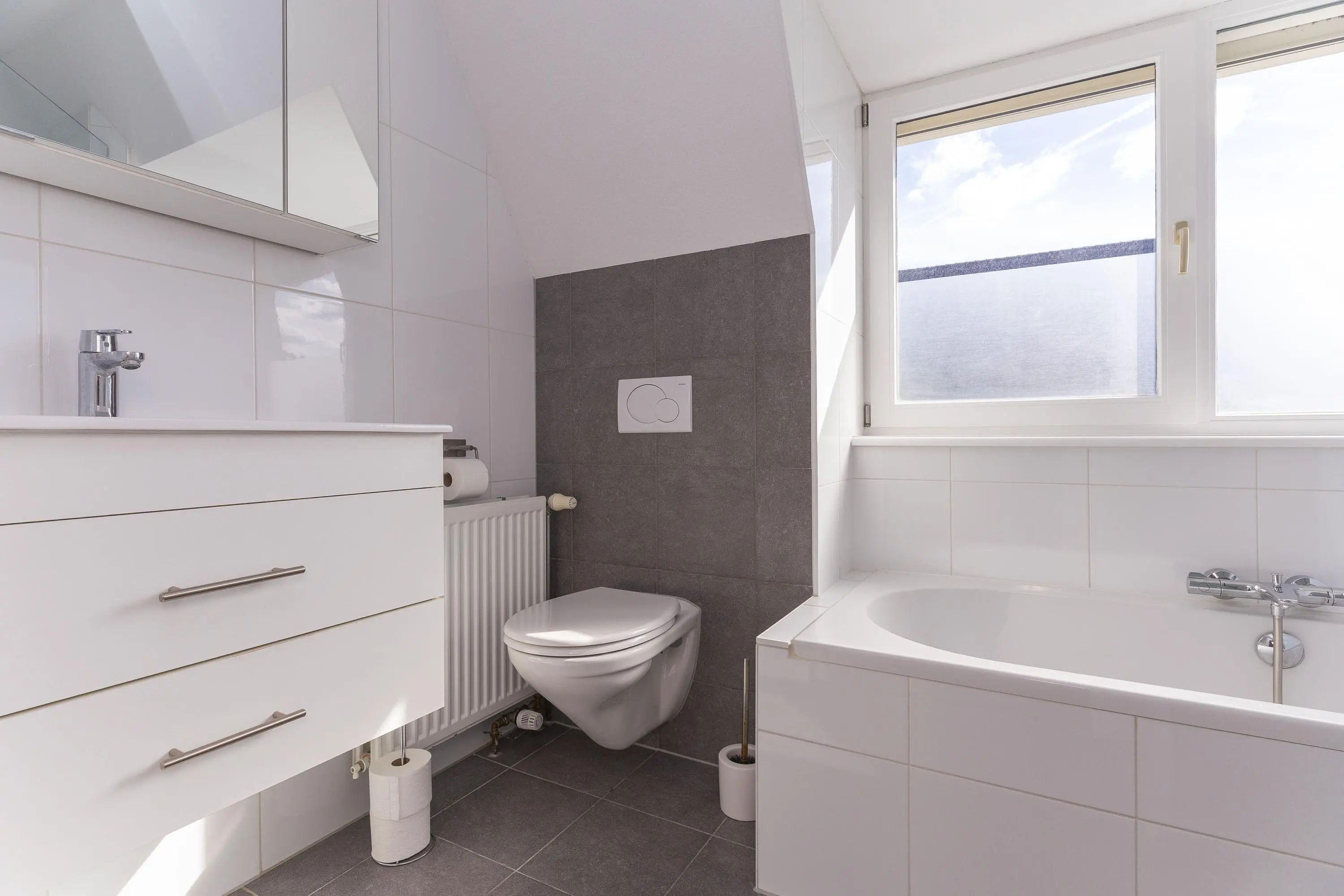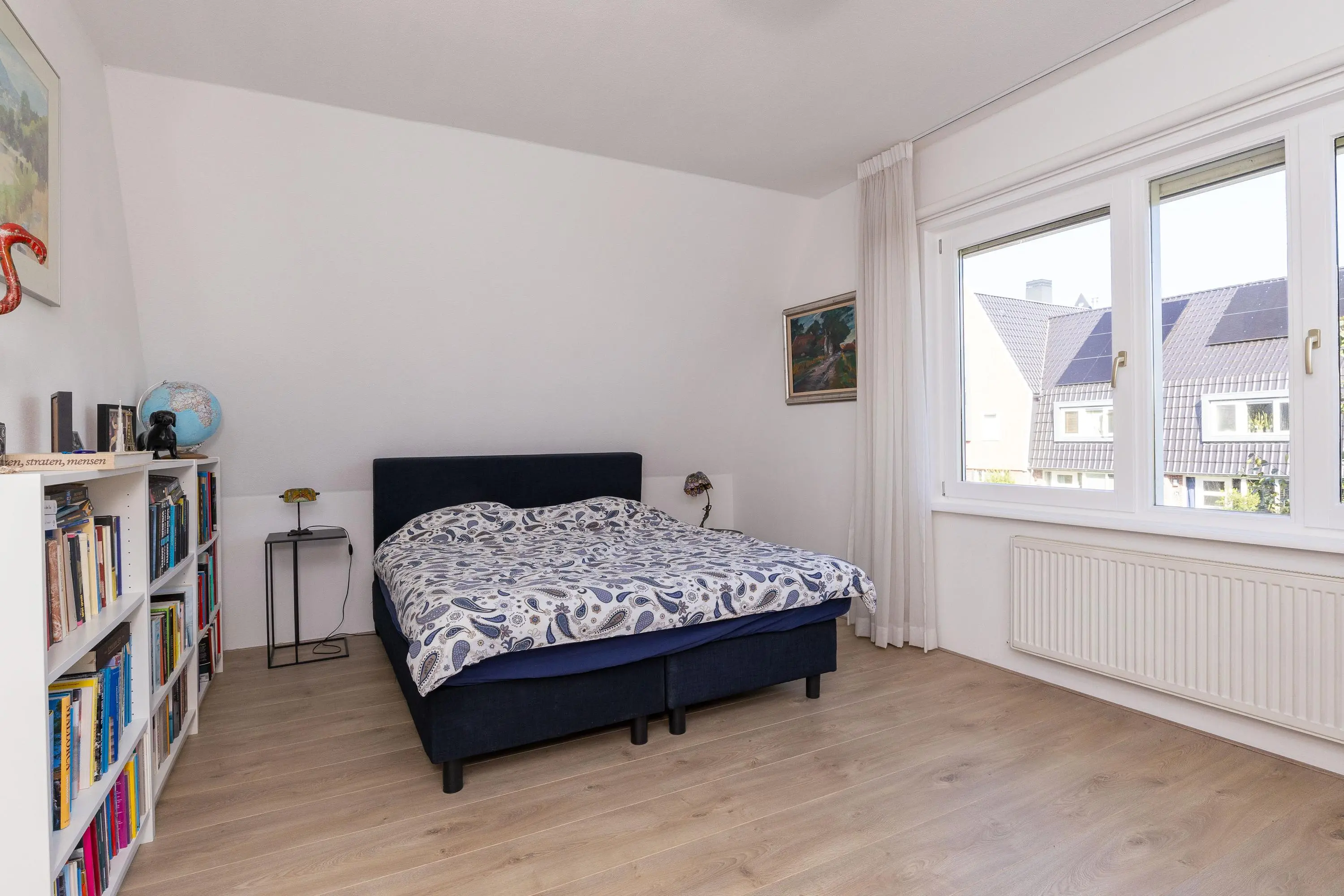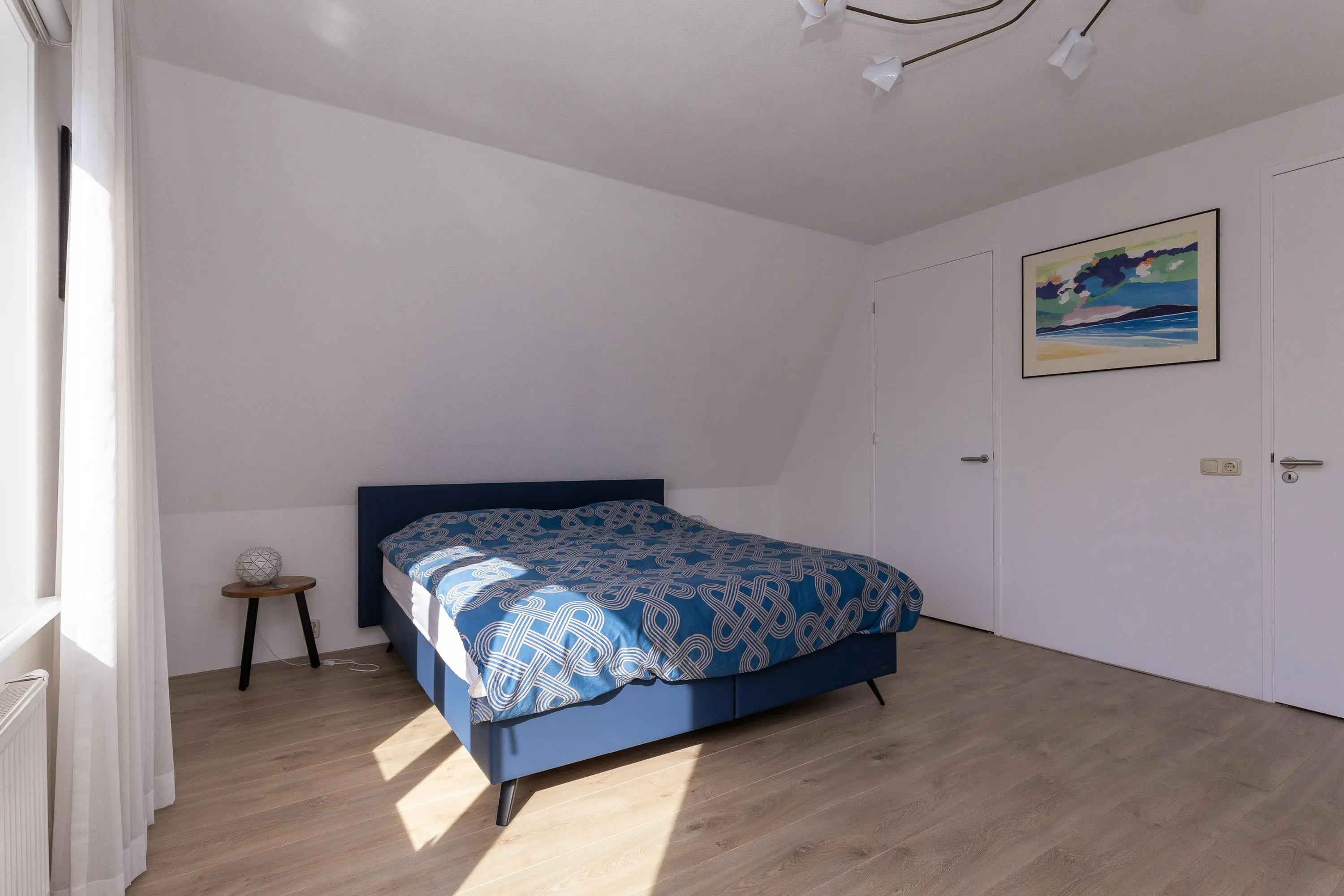 Ruime overloop met trap naar de 2e verdieping, toegang tot een ruime slaapkamer aan de voorzijde, badkamer met een hangcloset, wastafelmeubel, ligbad en een douchehoek, bergkast en een grote slaapkamer aan de achterzijde met een vaste kast en een inloopkast. Beide slaapkamers zijn erg ruim over de volledige breedte van de woning.