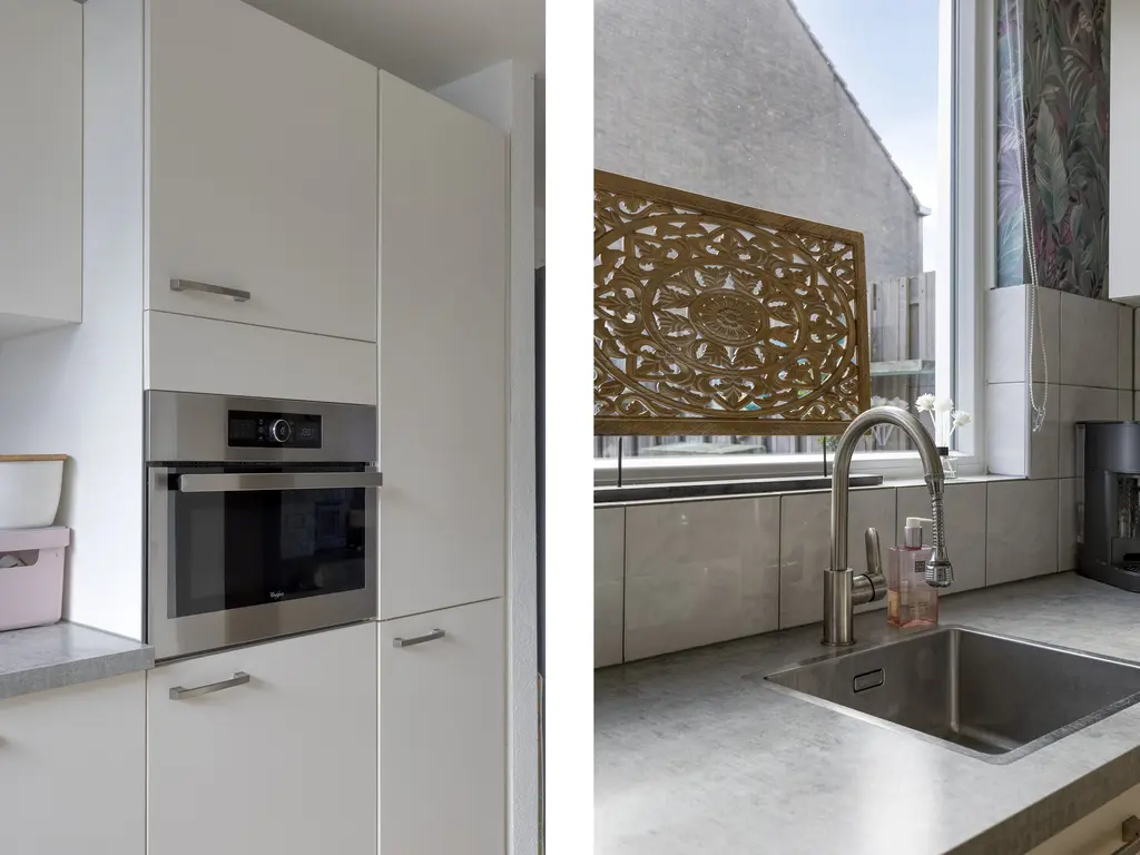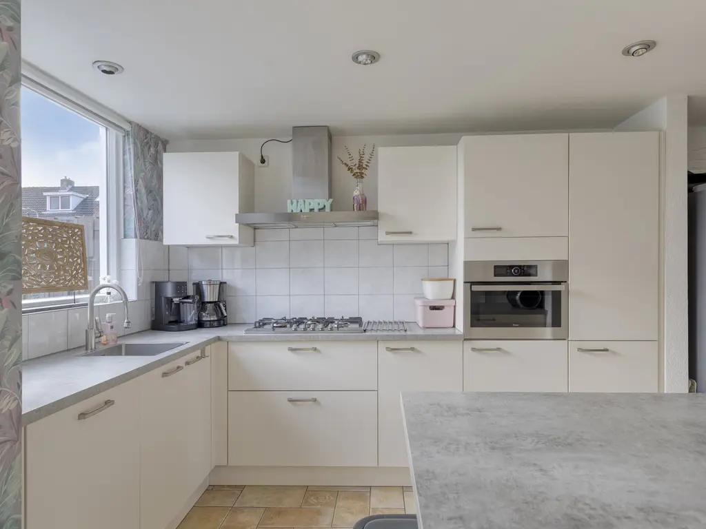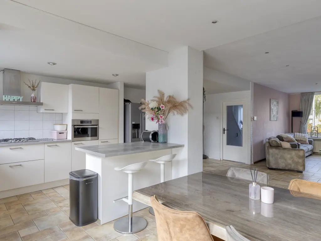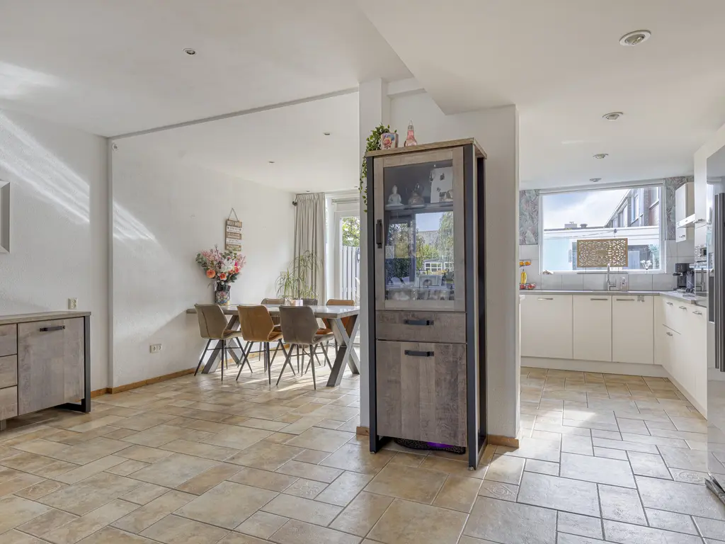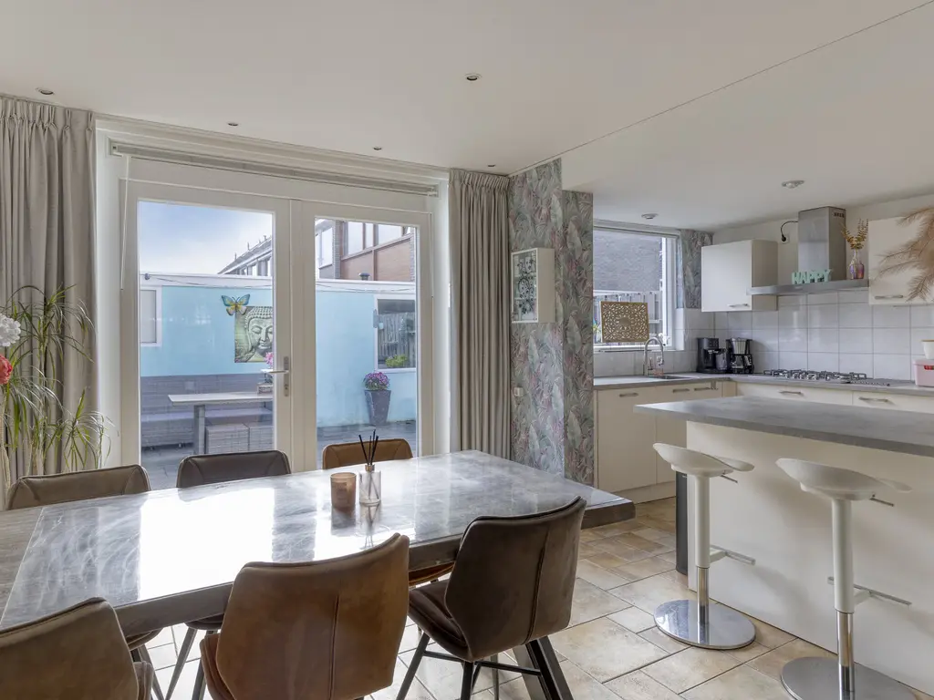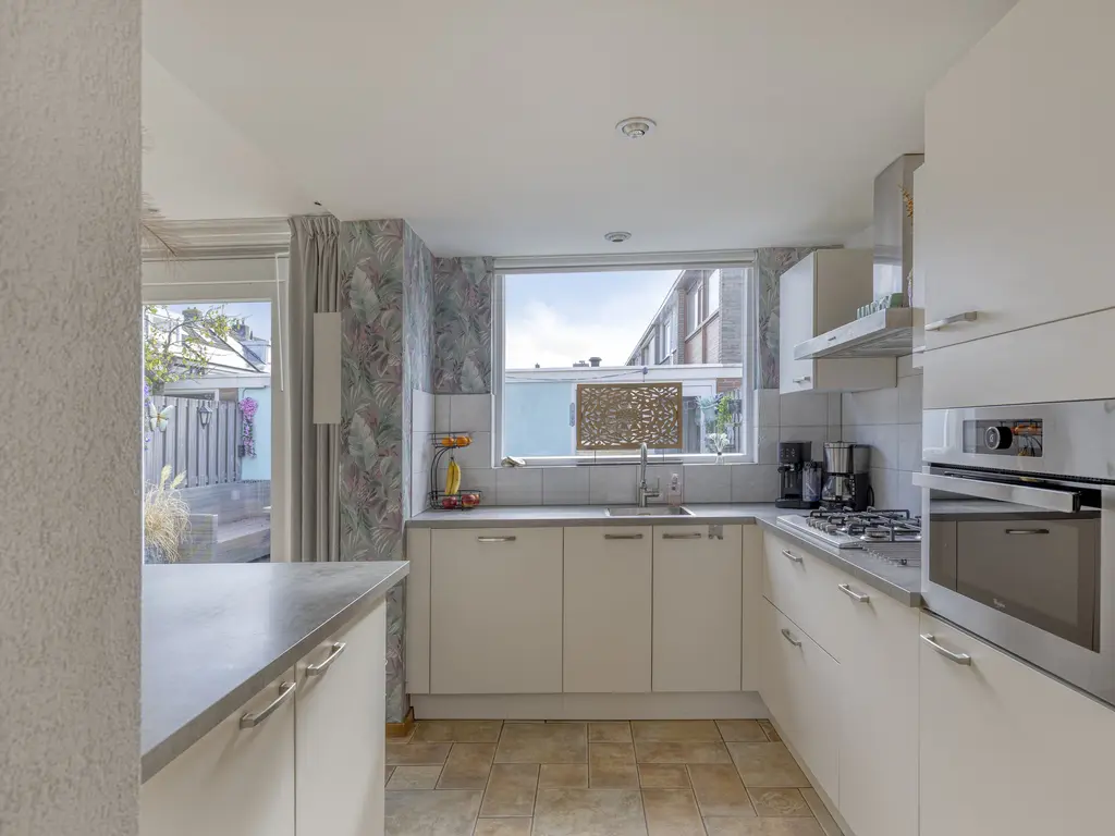 Aan de achterzijde is de woning ruim uitgebouwd, waardoor er maar liefst zeventien vierkante meter extra leefruimte is ontstaan. In deze uitbouw bevindt zich de open keuken, die in 2017 is geplaatst. De keuken is modern uitgevoerd en voorzien van diverse inbouwapparatuur, waaronder een combimagnetron, vaatwasser, vijfpits gaskookplaat, afzuigkap en een boiler. Daarnaast staat er een ruime Amerikaanse koelkast die ter overname wordt aangeboden. De uitbouw biedt bovendien een prettige verbinding met de achtertuin, waardoor binnen en buiten mooi in elkaar overlopen.