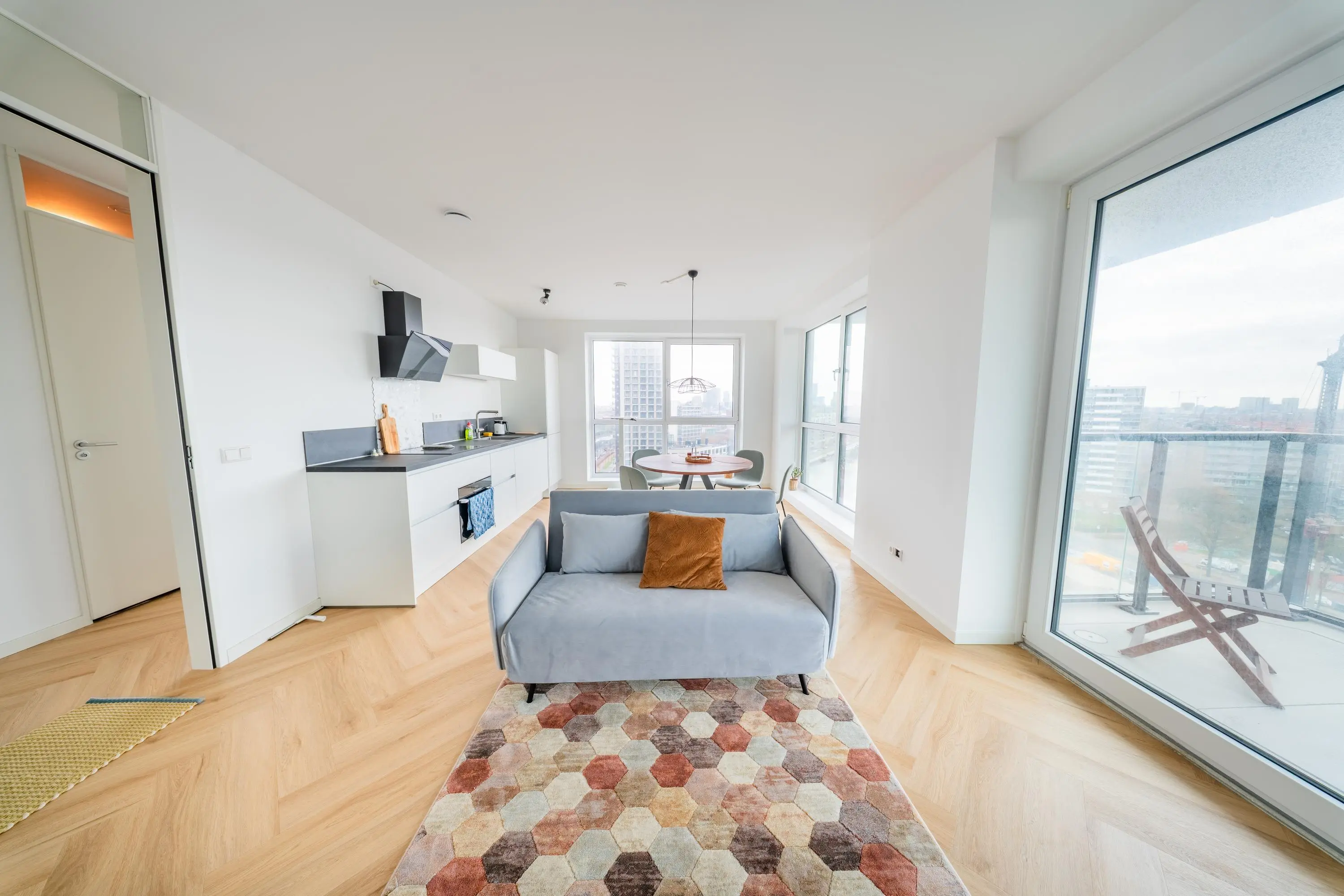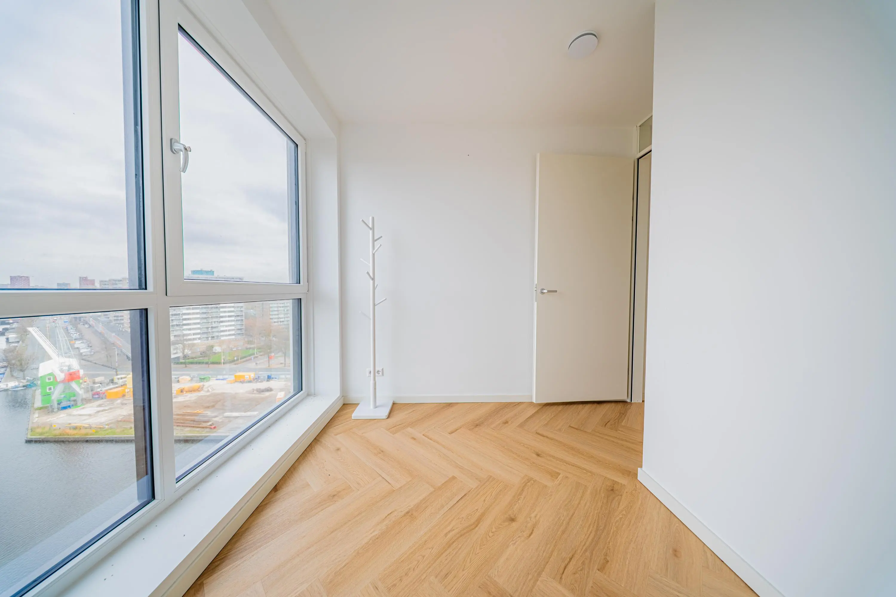 Vanuit de woonkamer stap je het grote balkon op een echte eyecatcher. Hier geniet je van een fraai uitzicht over de kade en de toekomstige havenlocatie, waardoor dit een ideale plek is voor een kop koffie in de ochtend of ontspanning aan het einde van de dag.