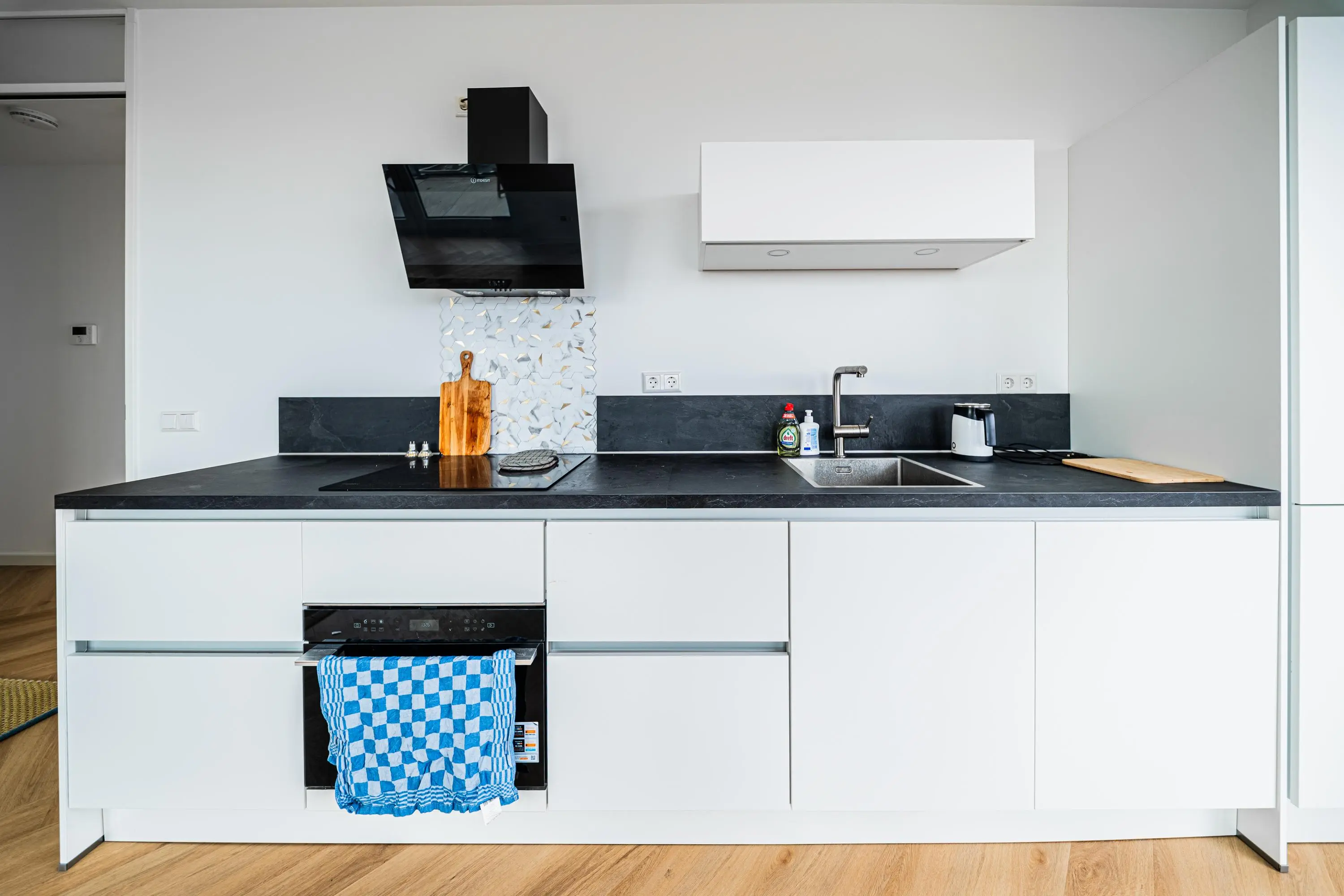 De lichte en royale woonkamer is een heerlijke leefruimte, mede door de grote raampartijen en de prettige open indeling. Hier bevindt zich de moderne open keuken, die volledig in de woonkamer is geïntegreerd. Deze is uitgerust met een inductiekookplaat, moderne apparatuur en volop kastruimte.
