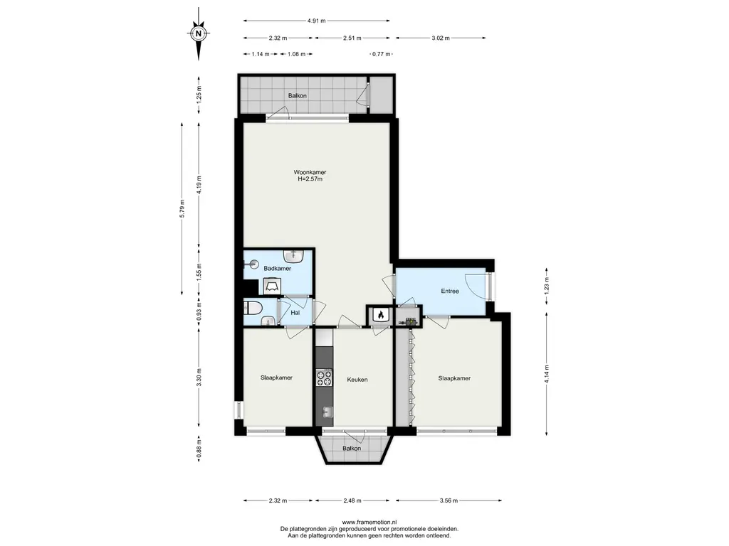 De dichte keuken heeft een rechte opstelling en is uitgevoerd in een moderne wit-grijze kleurstelling. De keuken is voorzien van een 4-pits gaskookplaat, afzuigschouw en koel-vriescombinatie. Tevens bevindt zich hier een designradiator en is er toegang tot het balkon aan de achterzijde. In een vaste kast bevindt zich de cv-installatie (Intergas, 2021).