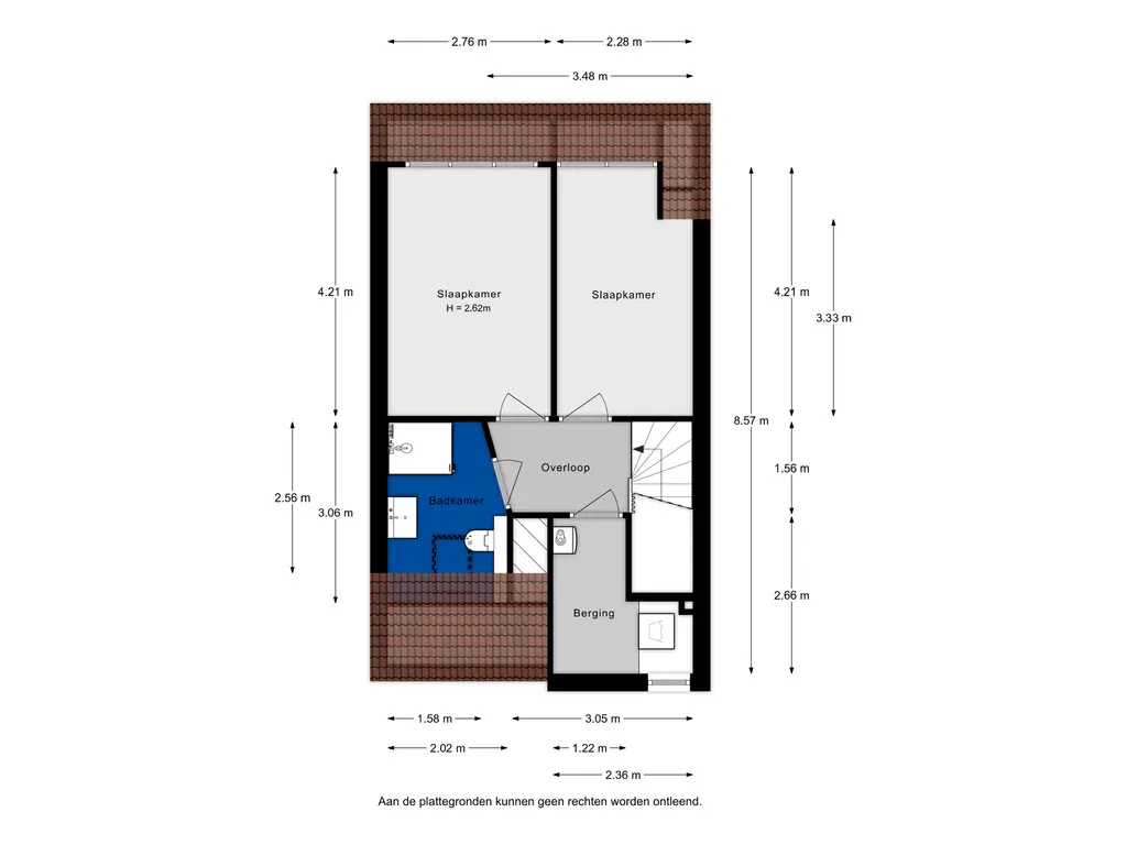 Via een vaste trap bereikt u de overloop op de 2e verdieping. Aan de achterzijde bevinden zich twee volwaardige slaapkamers, beide prettig licht en goed indeelbaar. Aan de voorzijde treft u een ruime berging met wasmachineaansluiting. De badkamer is modern uitgevoerd en volledig betegeld, voorzien van een douche, wastafel met meubel, toilet en een Velux-dakraam voor natuurlijke ventilatie. Daarnaast beschikt de woning over mechanische ventilatie in het gehele appartement. Ook hier is een praktische overloop aanwezig.