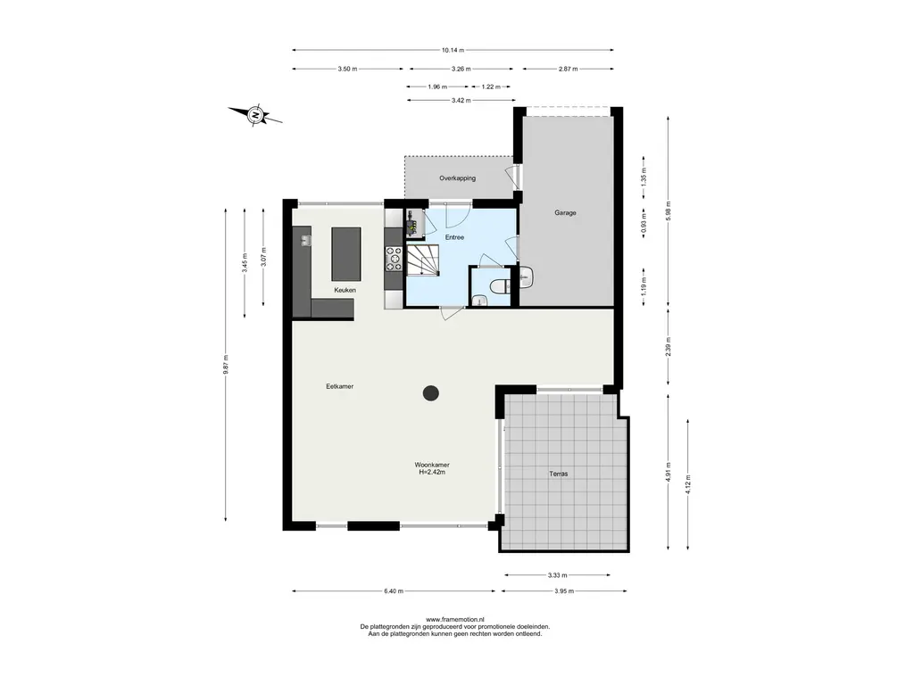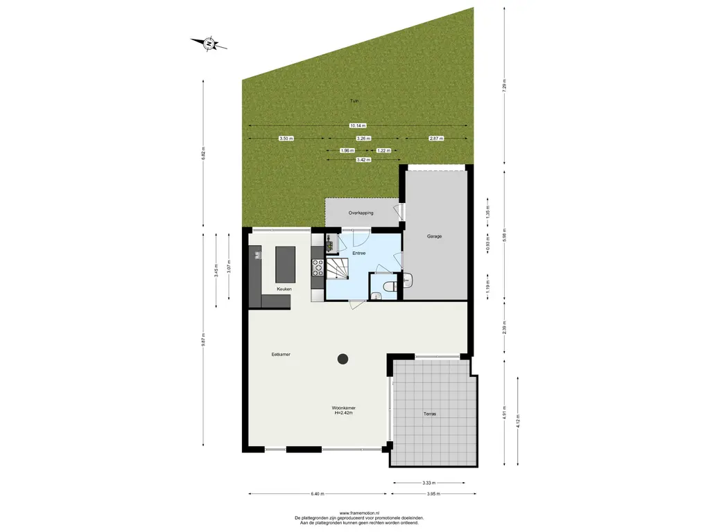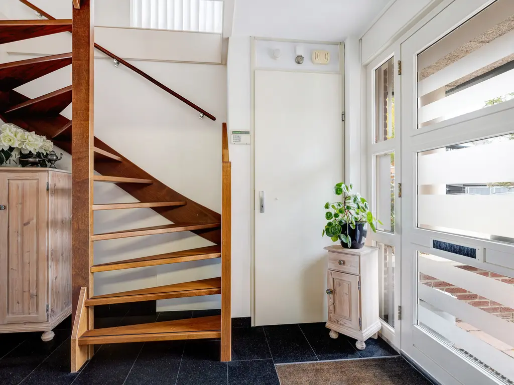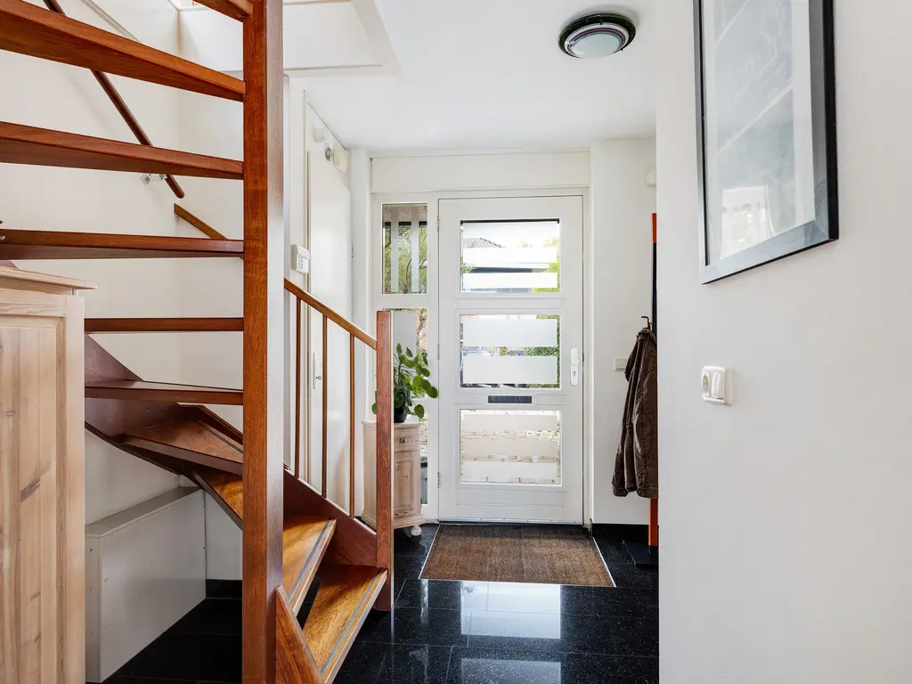 De royale voortuin biedt parkeergelegenheid op eigen terrein. Via de entree komt u in de ruime hal met trapopgang, modern toilet en toegang tot de inpandige, geïsoleerde garage – ideaal voor het stallen van fietsen, opslag of als hobbyruimte.
