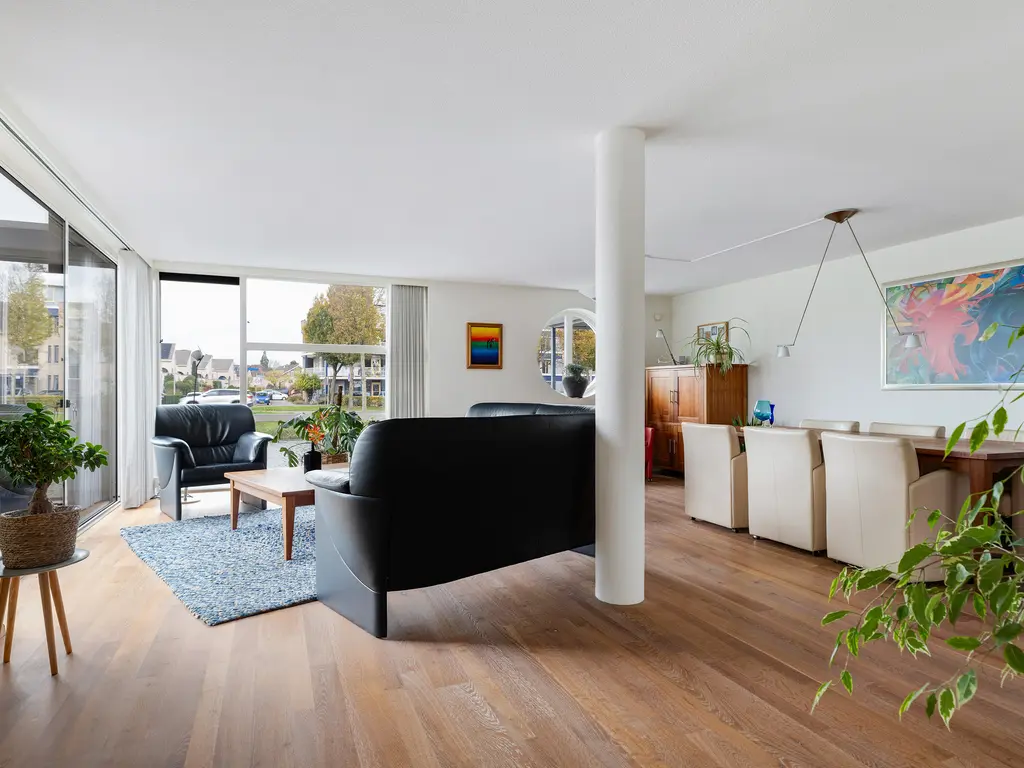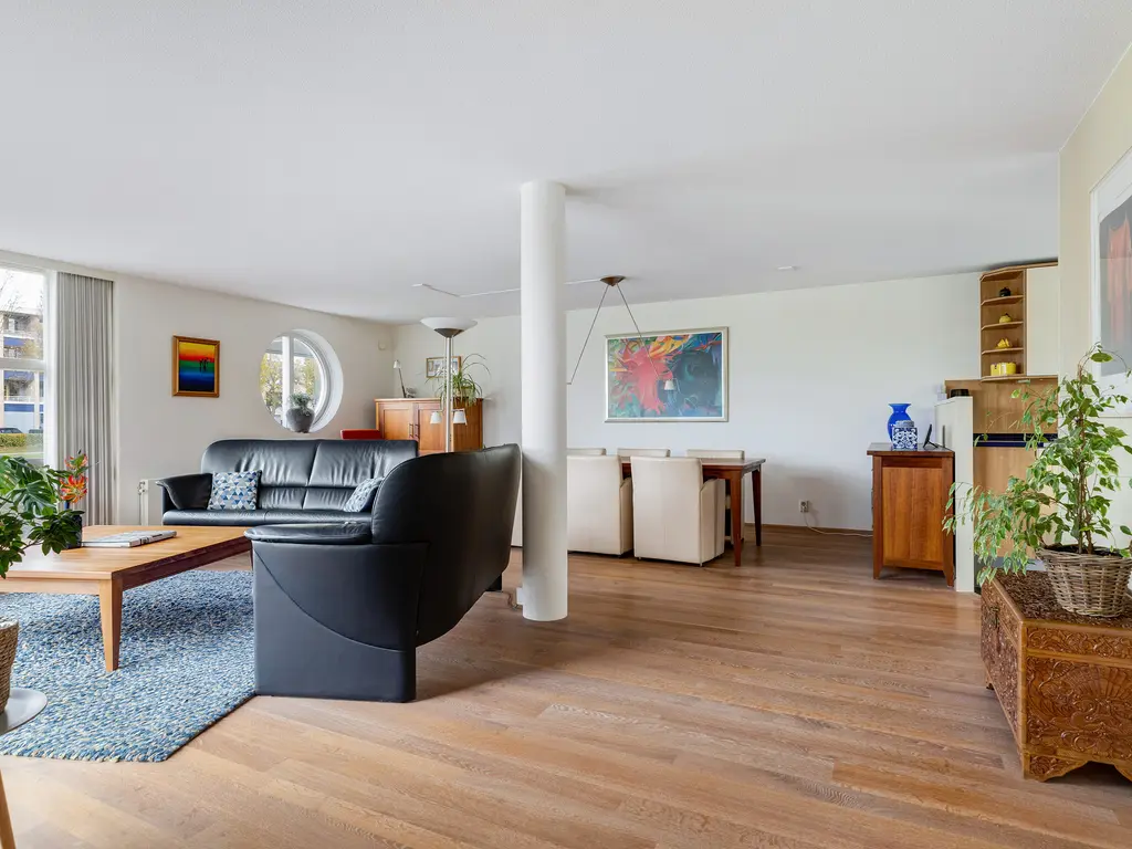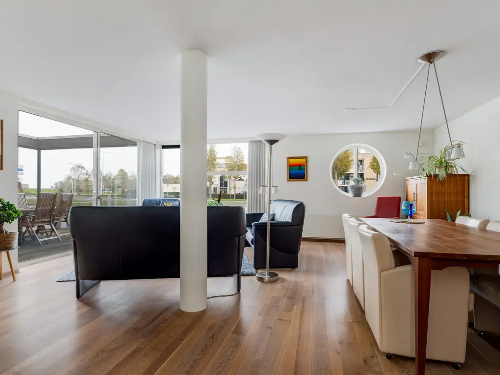 De living is royaal en sfeervol, met grote raampartijen en een schuifpui naar het terras aan het water. Dankzij de eikenhouten whitewash vloer en de speelse indeling ontstaat er een lichte en uitnodigende leefruimte met volop mogelijkheden voor meerdere zithoeken.