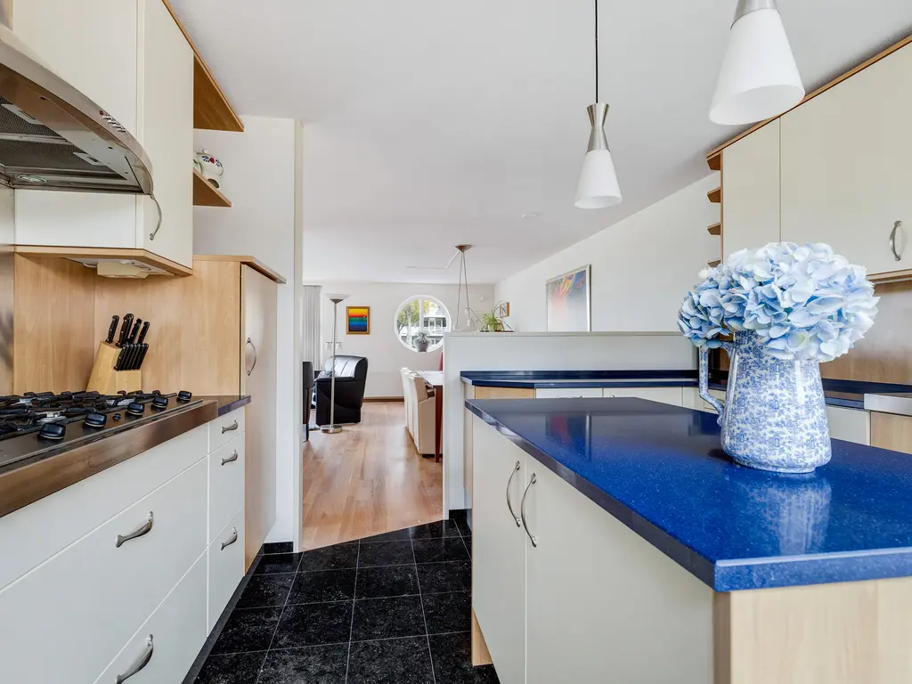 Aan de voorzijde bevindt zich de moderne woonkeuken, uitgerust met een royaal werkeiland met bergruimte en de vriezer. De keuken is voorzien van diverse inbouwapparatuur zoals een koelkast, 6-pits gaskookplaat met RVS-afzuigkap, combi-oven, vaatwasser en een stijlvol composiet werkblad. De donkere Belgisch hardstenen vloer vormt een prachtig contrast met de lichte woonkamer.