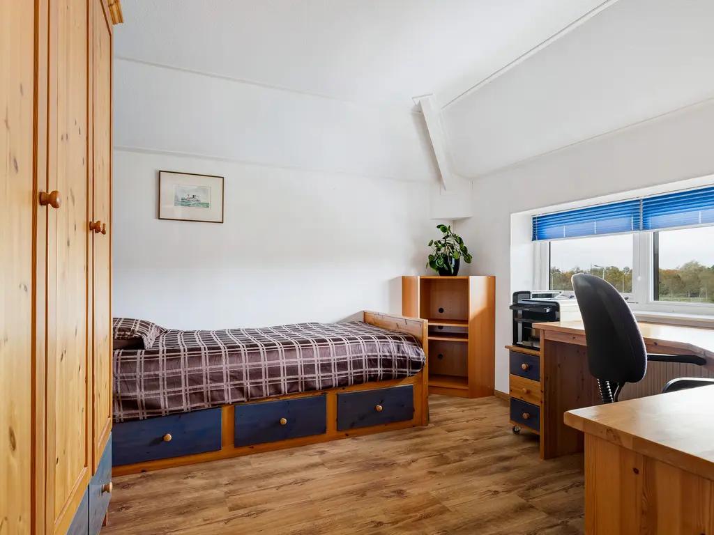 De badkamer is modern en praktisch ingedeeld met een douchecabine, dubbele wastafel en royale bergruimte in de diverse spiegelkasten. De gehele verdieping is afgewerkt met een laminaatvloer, wat zorgt voor een verzorgde uitstraling.