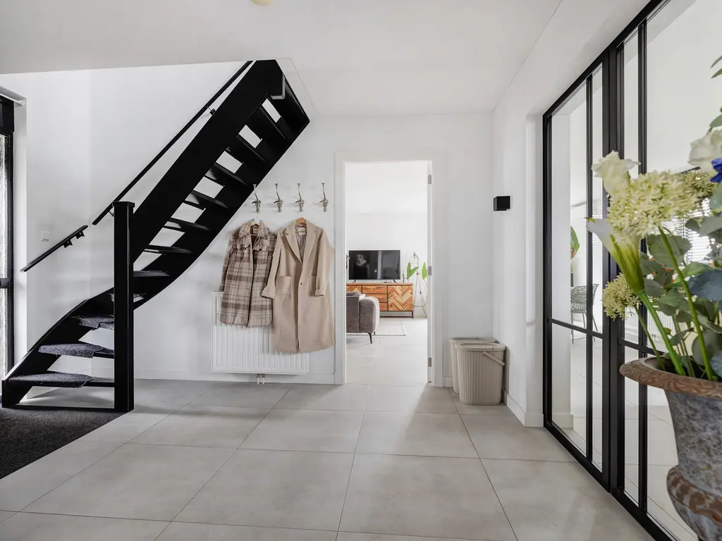 - Fraaie zwart stalen trapleuning en witte paneeldeuren in de hele woning zorgen voor een stijlvolle afwerking