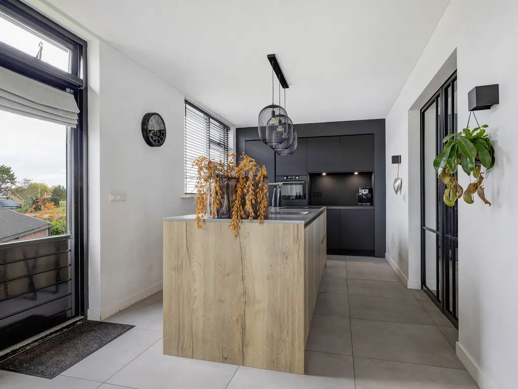 De open keuken vormt het hart van het huis en is uitgevoerd in een stijlvolle combinatie van zwart en houttinten. De wandopstelling biedt veel kastruimte, een koel-vriescombinatie, combi-oven en een nis met coffeecorner en verlichting. Het kook-/spoeleiland met composiet werkblad in betonlook is voorzien van een Bora inductiekookplaat met geïntegreerde afzuiging, vaatwasser, spoelbak en een gezellige eetbar. Vanuit de keuken is er middels een trap toegang tot het achtererf met de loods en oprit.