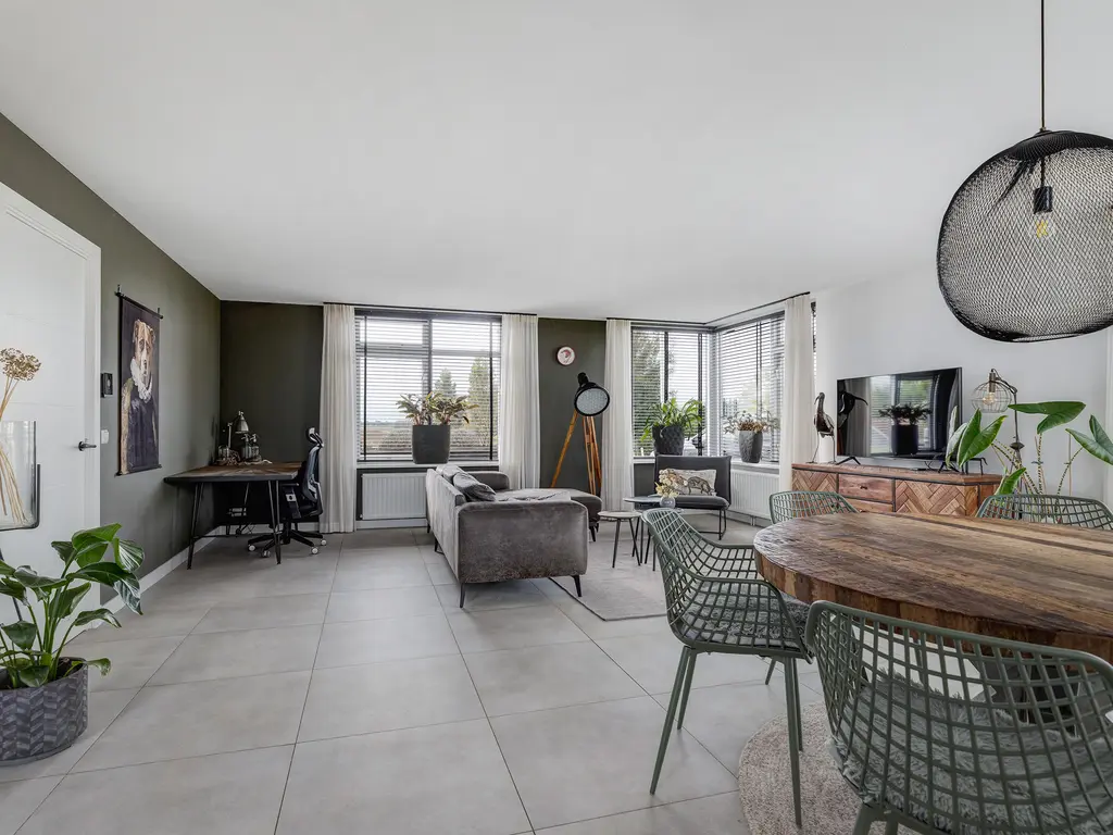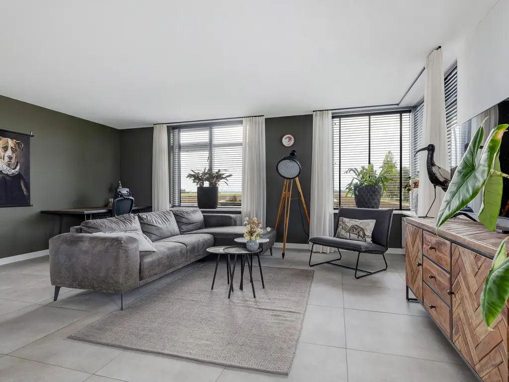 De woonkamer is een heerlijke, lichte ruimte met ramen rondom en een adembenemend uitzicht over de polder. Via openslaande deuren bereikt u het terras op dijkniveau, afgewerkt met houten vlonders, dé plek om te genieten van zon, uitzicht en rust.