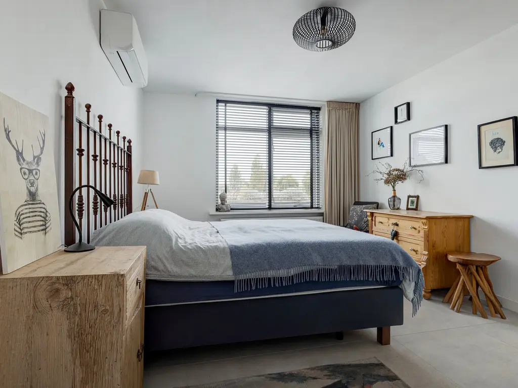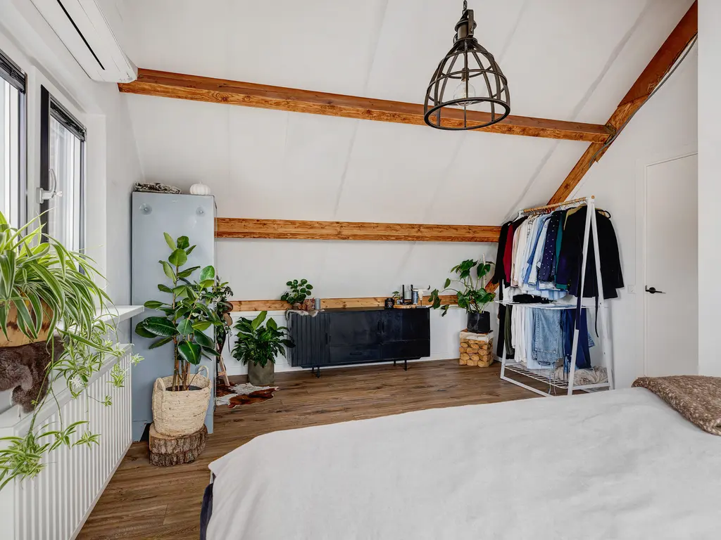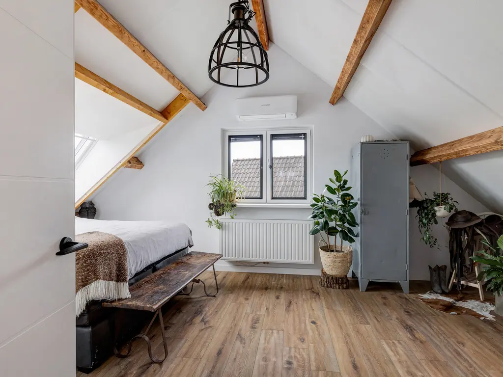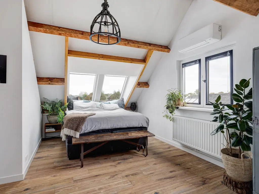 Slaapkamer 1 is voorzien van twee kunststof Velux dakramen met HR++ glas en elektrische rolluiken, houten balken, laminaatvloer en airconditioning.
