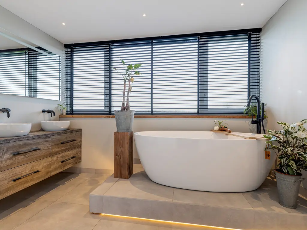 De badkamer is een waar wellnessgevoel: een riante inloopdouche met zwarte regendouche, een dubbel wastafelmeubel met houten accenten en moderne inbouwverlichting. Afgewerkt met grote grijze wand- en vloertegels, glad stucwerk en mechanische ventilatie (automatische vochtmeting).