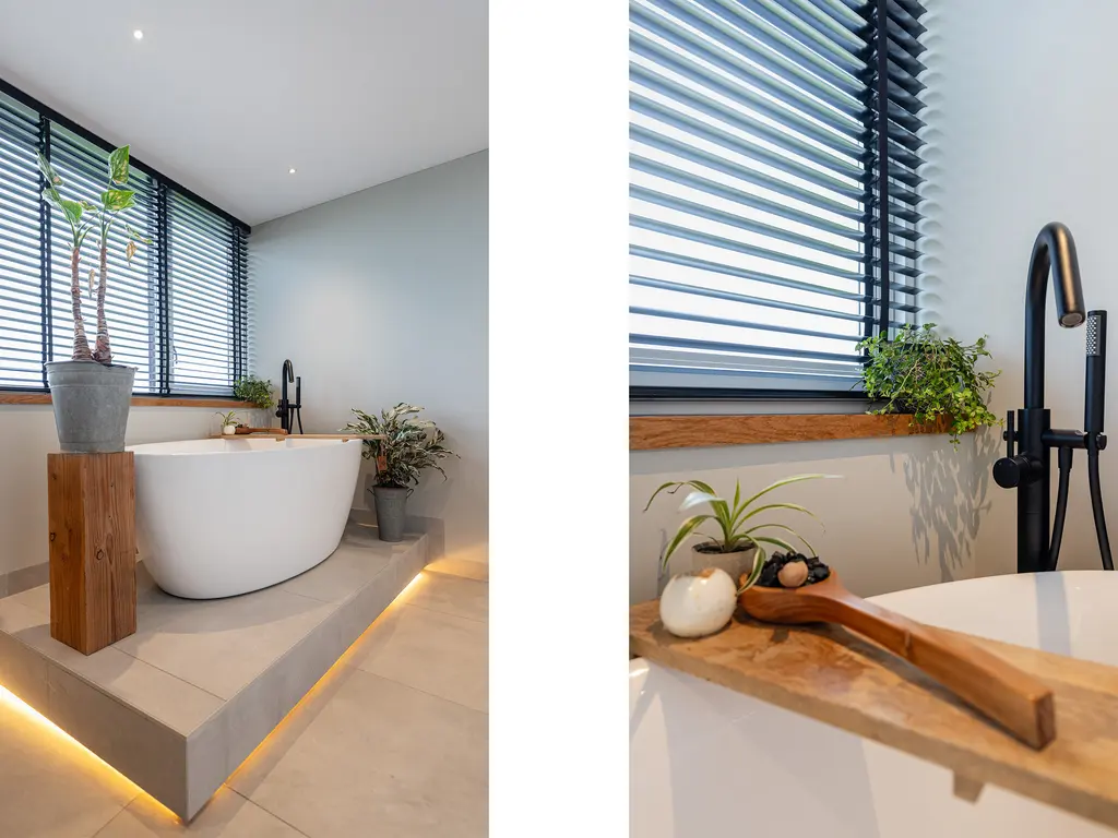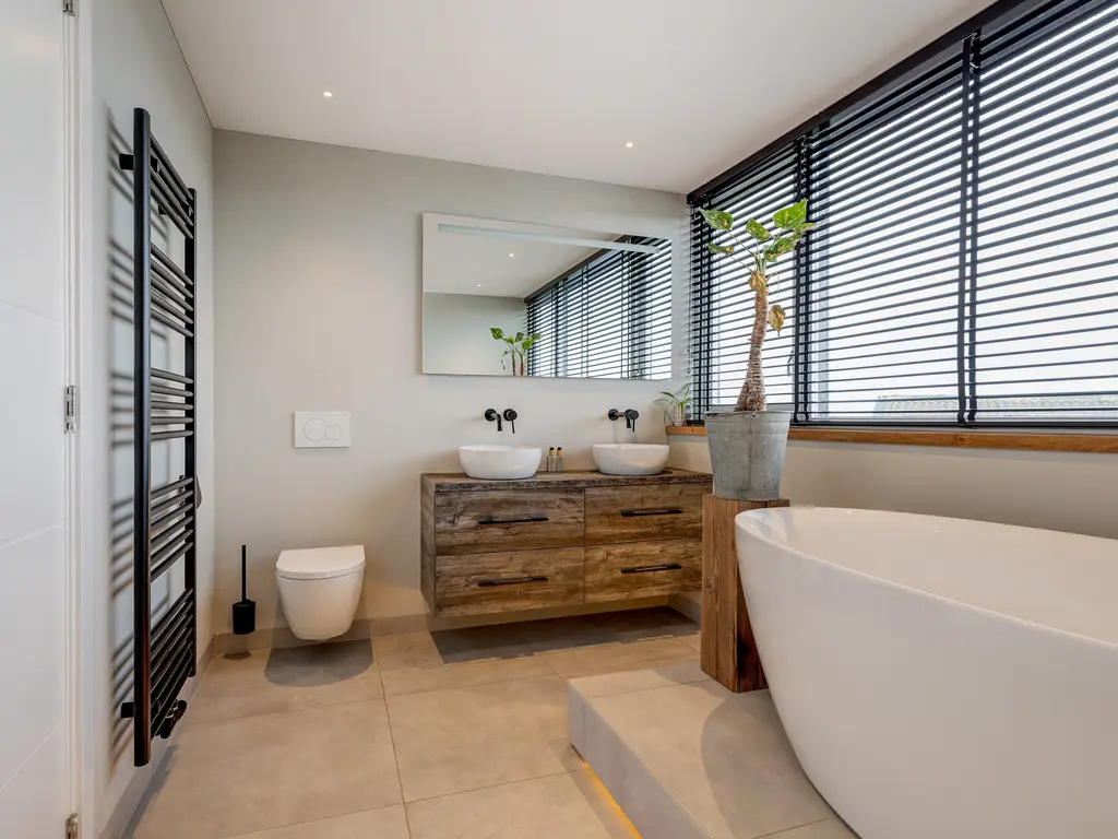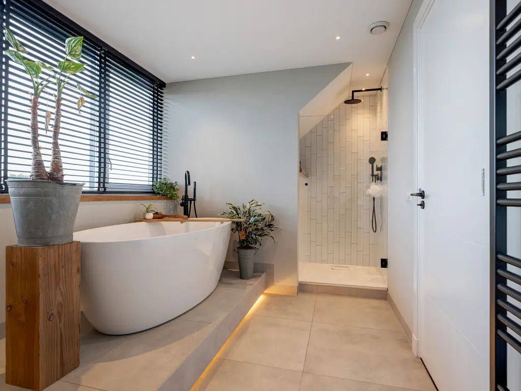 De tweede badkamer is een luxe oase met een verhoogd vrijstaand ligbad (met indirecte verlichting aan de onderzijde), inloopdouche, hangend toilet en dubbel wastafelmeubel met verlichte spiegel. De ruimte beschikt over dimbare inbouwspots en een dakkapel die extra licht en ruimte biedt.
